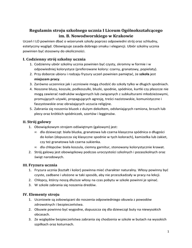 Regulamin stroju szkolnego ucznia I Liceum Ogólnokształcącego im. B. Nowodworskiego w Krakowie Uczeń I LO powinien dbać o wizerunek szkoły poprzez odpowiedni strój oraz schludny, estetyczny wygląd. Obowiązuje zasada dobrego smaku i elegancji. Ubiór szkolny ucznia powinien być stosowny do okoliczności. I. Codzienny strój szkolny ucznia 1. Codzienny ubiór szkolny ucznia powinien być czysty, skromny w formie i w odpowiedniej kolorystyce (preferowane kolory: czarny, granatowy, popielaty). 2. Przy doborze ubioru i rodzaju fryzury uczeń powinien pamiętać, że szkoła jest miejscem pracy. 3. Zarówno uczennice jak i uczniowie mogą chodzić do szkoły tylko w długich spodniach. 4. Noszone bluzy, koszule, podkoszulki, bluzki, spodnie, spódnice, kurtki czy płaszcze nie mogą zawierać nadruków wulgarnych lub związanych z subkulturami młodzieżowymi, promujących używki, propagujących agresję, treści nazistowskie, komunistyczne i faszystowskie oraz obrażających uczucia religijne. 5. Zabrania się noszenia bluzek z dużym dekoltem, odsłaniających ramiona, brzuch lub plecy oraz krótkich spódniczek, szortów i legginsów. II. Strój galowy 1. Obowiązkowym strojem odświętnym (galowym) jest: • dla dziewcząt: biała bluzka, granatowa lub czarna klasyczna spódnica o długości do kolan (dopuszcza się klasyczne spodnie w tych kolorach), kamizelka lub żakiet, czy też granatowa lub czarna sukienka. • dla chłopców: biała koszula, ciemny garnitur, stonowany kolorystycznie krawat. 2. Strój galowy jest obowiązkowy podczas uroczystości szkolnych i pozaszkolnych oraz świąt narodowych. III. Fryzura ucznia 1. Fryzura ucznia (kształt i kolor) powinna mieć charakter naturalny. Włosy powinny być czyste, zadbane i ułożone w taki sposób, aby nie przeszkadzały w pracy na lekcji. 2. Chłopcy, którzy noszą dłuższe włosy na czas pobytu w szkole powinni je spinać. 3. W szkole zabrania się noszenia dredów. IV. Elementy stroju 1. Uczniowie są zobowiązani do noszenia odpowiedniego obuwia z powodów zdrowotnych i bezpieczeństwa. 2. Obuwie powinno być wygodne, dopuszcza się dla dziewcząt buty na niewysokich obcasach. 3. Ze względów bezpieczeństwa zabrania się chodzenia w szkole w butach na wysokich szpilkach oraz koturnach. 1 4. Dopuszcza się dyskretny makijaż i bezbarwny lakier do paznokci. 5. Biżuteria (drobna, dyskretna) dobrana z zasadą dobrego smaku; nie powinna zagrażać bezpieczeństwu i zdrowiu ucznia oraz niszczyć mienia szkoły. 6. Zabrania się noszenia ozdób będących elementami subkultur młodzieżowych, wulgarnych lub związanych z subkulturami młodzieżowymi, promujących używki, propagujących agresję, treści nazistowskie, komunistyczne i faszystowskie oraz obrażających uczucia religijne. V. Konsekwencje nieprzestrzegania regulaminu Nieprzestrzeganie regulaminu, skutkuje upomnieniem wpisanym przez nauczyciela do dziennika. Uczeń powinien być poinformowany o wpisie. Dwa takie upomnienia powodują obniżenie oceny zachowania. Stosowna notatka, sporządzona przez nauczyciela/wychowawcę do dzienniczka ucznia powinna być podpisana przez rodzica/prawnego opiekuna. 2