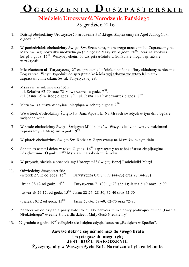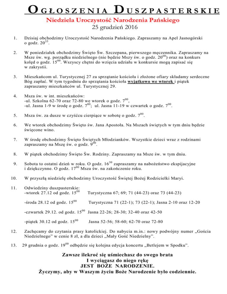 OGŁOSZENIA DUSZPASTERSKIE Niedziela Uroczystość Narodzenia Pańskiego 25 grudzień 2016 1. Dzisiaj obchodzimy Uroczystość Narodzenia Pańskiego. Zapraszamy na Apel Jasnogórski o godz. 20 35 . 2. W poniedziałek obchodzimy Święto Św. Szczepana, pierwszego męczennika. Zapraszamy na Msze św. wg. porządku niedzielnego (nie będzie Mszy św. o godz. 20 00 ) oraz na konkurs kolęd o godz. 15 00 . Wszyscy chętni do wzięcia udziału w konkursie mogą zapisać się w zakrystii. 3. Mieszkańcom ul. Turystycznej 27 za sprzątanie kościoła i złożone ofiary składamy serdeczne Bóg zapłać. W tym tygodniu do sprzątania kościoła wyjątkowo we wtorek i piątek zapraszamy mieszkańców ul. Turystycznej 29. 4. Msza św. w int. mieszkańców: -ul. Szkolna 62-70 oraz 72-80 we wtorek o godz. 7 00 , -ul. Jasna 1-9 w środę o godz. 7 00 ; ul. Jasna 11-19 w czwartek o godz. 7 00 . 5. Msza św. za dusze w czyśćcu cierpiące w sobotę o godz. 7 00 . 6. We wtorek obchodzimy Święto św. Jana Apostoła. Na Mszach świętych w tym dniu będzie święcone wino. 7. W środę obchodzimy Święto Świętych Młodzianków. Wszystkie dzieci wraz z rodzinami zapraszamy na Mszę św. o godz. 9 00 . 8. W piątek obchodzimy Święto Św. Rodziny. Zapraszamy na Msze św. w tym dniu. 9. Sobota to ostatni dzień w roku. O godz. 16 30 zapraszamy na nabożeństwo ekspijacyjne i dziękczynne. O godz. 17 00 Msza św. na zakończenie roku. 10. W przyszłą niedzielę obchodzimy Uroczystość Świętej Bożej Rodzicielki Maryi. 11. Odwiedziny duszpasterskie: -wtorek 27.12 od godz. 15 00 Turystyczna 67; 69; 71 (44-23) oraz 73 (44-23) -środa 28.12 od godz. 15 00 Turystyczna 71 (22-1); 73 (22-1); Jasna 2-10 oraz 12-20 -czwartek 29.12. od godz. 15 00 Jasna 22-26; 28-30; 32-40 oraz 42-50 -piątek 30.12 od godz. 15 00 12. 13. Jasna 52-56; 58-60; 62-70 oraz 72-80 Zachęcamy do czytania prasy katolickiej. Do nabycia m.in.: nowy podwójny numer „Gościa Niedzielnego” w cenie 8 zł, a dla dzieci „Mały Gość Niedzielny”. 29 grudnia o godz. 19 00 odbędzie się kolejna edycja koncertu „Betlejem w Spodku”. Zawsze ilekroć się uśmiechasz do swego brata I wyciągasz do niego rękę JEST BOŻE NARODZENIE. Życzymy, aby w Waszym życiu Boże Narodzenie było codziennie.