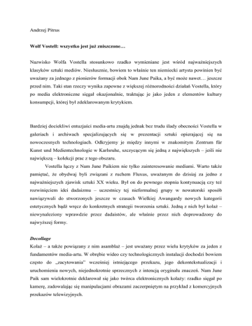 Andrzej Pitrus Wolf Vostell: wszystko jest już zniszczone… Nazwisko Wolfa Vostella stosunkowo rzadko wymieniane jest wśród najważniejszych klasyków sztuki mediów. Niesłusznie, bowiem to właśnie ten niemiecki artysta powinien być uważany za jednego z pionierów formacji obok Nam June Paika, a być może nawet… jeszcze przed nim. Taki stan rzeczy wynika zapewne z większej różnorodności działań Vostella, który po media elektroniczne sięgał okazjonalnie, traktując je jako jeden z elementów kultury konsumpcji, której był zdeklarowanym krytykiem. Bardziej dociekliwi entuzjaści media-artu znajdą jednak bez trudu ślady obecności Vostella w galeriach i archiwach specjalizujących się w prezentacji sztuki opierającej się na nowoczesnych technologiach. Odkryjemy je między innymi w znakomitym Zentrum für Kunst und Medientechnologie w Karlsruhe, szczycącym się jedną z największych – jeśli nie największą – kolekcji prac z tego obszaru. Vostella łączy z Nam June Paikiem nie tylko zainteresowanie mediami. Warto także pamiętać, że obydwaj byli związani z ruchem Fluxus, uważanym do dzisiaj za jedno z najważniejszych zjawisk sztuki XX wieku. Był on do pewnego stopnia kontynuacją czy też rozwinięciem idei dadaizmu – uczestnicy tej nieformalnej grupy w nowatorski sposób nawiązywali do stworzonych jeszcze w czasach Wielkiej Awangardy nowych kategorii estetycznych bądź wręcz do konkretnych strategii tworzenia sztuki. Jedną z nich był kolaż – niewynaleziony wprawdzie przez dadaistów, ale właśnie przez nich doprowadzony do najwyższej formy. Decollage Kolaż – a także powiązany z nim asamblaż – jest uważany przez wielu krytyków za jeden z fundamentów media-artu. W obrębie wideo czy technologicznych instalacji dochodzi bowiem często do „zacytowania” wcześniej istniejącego przekazu, jego dekontekstualizacji i uruchomienia nowych, niejednokrotnie sprzecznych z intencją oryginału znaczeń. Nam June Paik sam wielokrotnie deklarował się jako twórca elektronicznych kolaży: rzadko sięgał po kamerę, zadowalając się manipulacjami obrazami zaczerpniętym na przykład z komercyjnych przekazów telewizyjnych. Vostell także czerpał z tej tradycji, czynił to jednak w nieco przewrotny sposób. W jego twórczości zamiast kolażu pojawia się inna kategoria – określana mianem decollage. Strategia ta – zgodnie ze swą nazwą – jest w pewnym sensie zaprzeczeniem kolażu. Vostell nie jest jej wynalazcą. Za takiego uważa się francuskiego surrealistę Léo Maleta, który zaczął stosować ją w połowie lat 30. XX wieku. Później – już w latach 50. – powrócili do niej inni artyści znad Sekwany, m.in. Hervé Télémaque i Mimmo Rotella. Technika stosowana przez wymienionych tu twórców została zainspirowana przez obserwacje czynione w przestrzeni miejskiej, a pierwszym posługującym się nią „artystą” był… wiatr zrywający ze słupów ogłoszeniowych kolejne warstwy starych plakatów. O ile kolaż polegał na dodawaniu do siebie istniejących wcześniej elementów, o tyle decollage jest strategią subtraktywną. Zadaniem artysty jest tu swoiście pojmowana redukcja, mająca jednak bardziej „organiczny” charakter niż w wypadku minimal artu. Minimaliści dokonywali bowiem tej operacji na etapie konceptualnym, przedstawiając widzowi wypreparowany artefakt. Decollage skutkuje innego rodzaju obiektami: są one programowo „brudne”, noszą na sobie ślady niszczącego procesu, właśnie jak wspomniane wcześniej ogłoszeniowe słupy oklejone wieloma warstwami nieaktualnych już plakatów. Dla Vostella ta cecha nowej strategii stała się najważniejsza. Nie tylko pozwalała mu tworzyć nowatorskie i oryginalne obiekty, ale także umożliwiała wyrażanie pesymistycznej wizji rzeczywistości. Świat opanowany przez technologie znajduje się, w jego odczuciu, w stanie pogłębiającej się degeneracji, ustawicznego rozkładu, a technologiczny postęp sprawia, że człowiek w coraz większym stopniu zanurza się w oceanie wszelkiego rodzaju śmieci – rozumianych dosłownie, ale również pojmowanych jako „śmieci komunikacyjne”, dostarczane na przykład przez komercyjną telewizję. Być może właśnie dlatego Vostell zainteresował się tym medium już w 1958 roku, stając się tym samym absolutnym pionierem wykorzystania technologii TV w sztuce. Odbiornik telewizyjny pojawił się u niego po raz pierwszy w realizacji Zyklus Schwarzes Zimmer (1958), by powrócić później między innymi w Transmigracion 1-3 (1958), a także w Elektronischer Dé-coll/age Happening Raum (1968). Telewizor w betonie Cechą wyróżniającą twórczości Vostella jest nie tylko zastosowanie wspomnianej wcześniej strategii dekompozycji, umożliwiającej mu z jednej strony ujawnienie istoty materii jego sztuki (bliskiej artystom z kręgu konceptualizmu), a z drugiej budowanie zaangażowanego przekazu (bardziej charakterystycznego dla sztuki krytycznej), ale również wykorzystanie określonych materiałów. Kiedy patrzymy na rzeźby Richarda Serry, bez trudu rozpoznajemy je po samym tworzywie – w tym wypadku jednolicie zardzewiałym żelazie. Dla Vostella firmowym budulcem jego instalacji jest beton. To wręcz zaskakujące, jak obydwaj artyści zdolni byli uczynić z tak anonimowych substancji coś w rodzaju autorskiego podpisu. Vostell zatapia w betonie różne obiekty, pozbawiając je – tu kolejny ukłon w stronę tradycji dadaistycznej – ich pierwotnej funkcjonalności. Przedmiotami tymi są bardzo często monitory, które choć nadal działają, nie są w stanie skutecznie komunikować jakichkolwiek treści. Być może zresztą nigdy nie były – zdaje się sugerować autor. Powierzchnia ekranu zostaje zredukowana do niewielkiego okienka, zwykle ukazującego jedynie charakterystyczne śnieżenie – telewizyjny sygnał minimum manifestujący wyłącznie swoją obecność. Nic ponad to. Kiedy indziej od