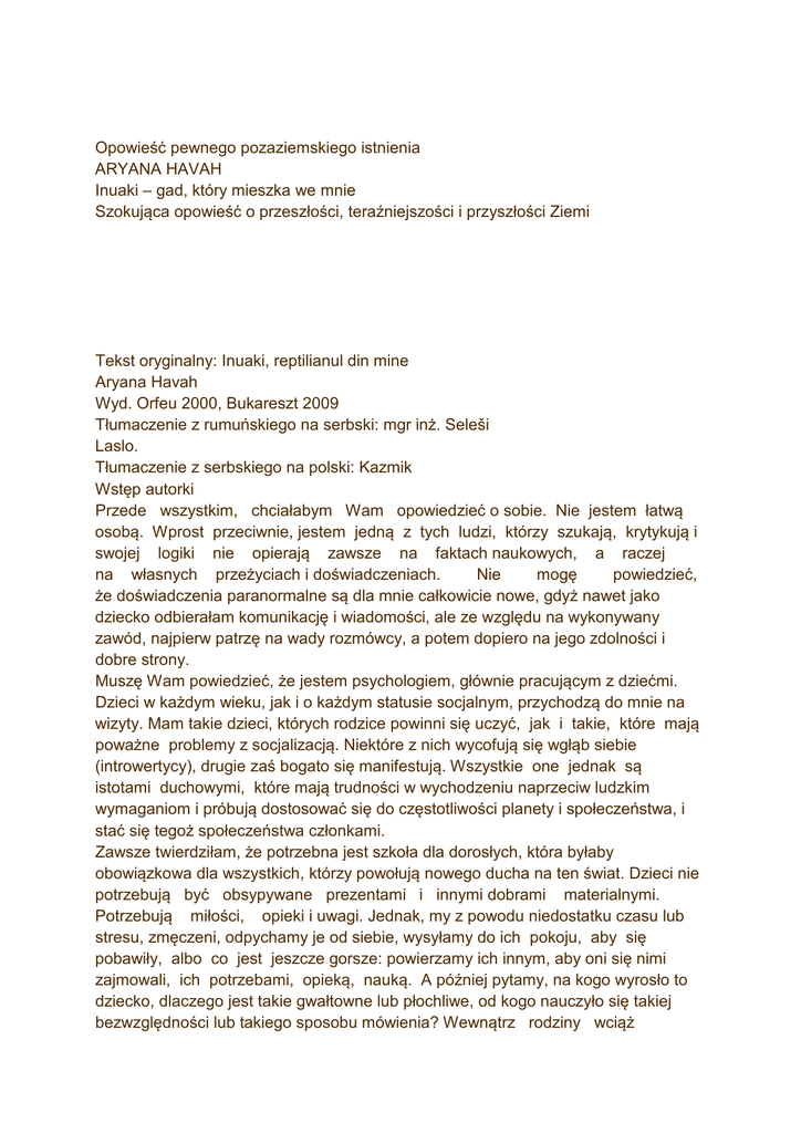 Opowieść pewnego pozaziemskiego istnienia ARYANA HAVAH Inuaki – gad, który mieszka we mnie Szokująca opowieść o przeszłości, teraźniejszości i przyszłości Ziemi Tekst oryginalny: Inuaki, reptilianul din mine Aryana Havah Wyd. Orfeu 2000, Bukareszt 2009 Tłumaczenie z rumuńskiego na serbski: mgr inż. Seleši Laslo. Tłumaczenie z serbskiego na polski: Kazmik Wstęp autorki Przede wszystkim, chciałabym Wam opowiedzieć o sobie. Nie jestem łatwą osobą. Wprost przeciwnie, jestem jedną z tych ludzi, którzy szukają, krytykują i swojej logiki nie opierają zawsze na faktach naukowych, a raczej na własnych przeżyciach i doświadczeniach. Nie mogę powiedzieć, że doświadczenia paranormalne są dla mnie całkowicie nowe, gdyż nawet jako dziecko odbierałam komunikację i wiadomości, ale ze względu na wykonywany zawód, najpierw patrzę na wady rozmówcy, a potem dopiero na jego zdolności i dobre strony. Muszę Wam powiedzieć, że jestem psychologiem, głównie pracującym z dziećmi. Dzieci w każdym wieku, jak i o każdym statusie socjalnym, przychodzą do mnie na wizyty. Mam takie dzieci, których rodzice powinni się uczyć, jak i takie, które mają poważne problemy z socjalizacją. Niektóre z nich wycofują się wgłąb siebie (introwertycy), drugie zaś bogato się manifestują. Wszystkie one jednak są istotami duchowymi, które mają trudności w wychodzeniu naprzeciw ludzkim wymaganiom i próbują dostosować się do częstotliwości planety i społeczeństwa, i stać się tegoż społeczeństwa członkami. Zawsze twierdziłam, że potrzebna jest szkoła dla dorosłych, która byłaby obowiązkowa dla wszystkich, którzy powołują nowego ducha na ten świat. Dzieci nie potrzebują być obsypywane prezentami i innymi dobrami materialnymi. Potrzebują miłości, opieki i uwagi. Jednak, my z powodu niedostatku czasu lub stresu, zmęczeni, odpychamy je od siebie, wysyłamy do ich pokoju, aby się pobawiły, albo co jest jeszcze gorsze: powierzamy ich innym, aby oni się nimi zajmowali, ich potrzebami, opieką, nauką. A później pytamy, na kogo wyrosło to dziecko, dlaczego jest takie gwałtowne lub płochliwe, od kogo nauczyło się takiej bezwzględności lub takiego sposobu mówienia? Wewnątrz rodziny wciąż szukamy podobieństw – genetyczną, docieramy do najsłabszego ogniwa – a znajdujemy linię wszystko po to, aby ukryć przed samymi sobą własną porażkę, aby nie zetknąć się z czymś nieprzyjemnym. Oszukujemy sami siebie. Jednak, zawsze w głębi duszy skrywa się prawdziwa tożsamość, ta która jest nam samym znana, winny, którego nie dopuszcza się do pola świadomości. Borykamy się z tym się codziennie. Czasami odnosimy sukcesy, czasami zwyciężamy, czasami się gubimy, czasem nie dzieje się nic, ale to co z pewnością mogę wam powiedzieć to to, że po terapeutycznej rozmowie, pomiędzy rodzicami i dziećmi powstaje cienka więź, jedna świetlista nić która ich łączy, która od każdego pięknego słowa, każdej przeczytanej bajki, każdego buziaka lub przytulenia, staje się coraz grubsza. Ale wróćmy do głównego tematu. Pamiętam, że był pochmurny letni poranek. Było bardzo duszno, można się było udusić. Postanowiłam otworzyć okno z zamiarem wpuszczenia świeżego podmuchu, aby rozproszył to ciche, nieprzyjemne i stłumione uczucie. Nie czułam się dobrze we własnej skórze. Czułam ucisk w splocie słonecznym. Wiedziałam, że ten ucisk to mój wewnętrzny sygnał alarmowy, który się pojawia, kiedy dzieje się coś nieprzyjemnego. Z całego serca miałam nadzieję, że to fałszywy alarm, gdyż na terapię miał przyjść nowy chłopak. O zaplanowanej godzinie pojawił się w biurze ze swoją matką. Dziecko, urocze stworzenie, z anielskimi oczyma, potarganymi włosami w kolorze kasztana, w niezupełnie nowych dżinsach i żółtej koszuli z napisem: Love me. Pomyślałam, że dobrze byłoby, gdyby każde dziecko nosiło ubranie z napisem ‘kochaj mnie’. W ten sposób, nikt by o tym nie zapominał. Długo na mnie patrzył, bo nie śmiał usiąść w fotelu. Wiedziałam, gdyż przeczytam w karcie pacjenta, że na imię ma David (nie jest to jego prawdziwe imię), i że ma 7 lat. Zwykle po pewnym czasie przystosowania, kiedy czuję że mogę skomunikować się bezpośrednio z dzieckiem, proszę rodziców o zaczekanie w poczekalni, ale ku mojemu zdziwieniu, to David poprosił mamę, żeby opuściła gabinet. Zdenerwowałam się lekko, gdyż nigdy nie widziałam niczego podobnego i chciałam odkryć tego przyczynę. Dowiedziałam się od chłopca, że jego matka przyprowadziła go, gdyż wciąż słyszy jakiś głos: „jakby ktoś mówił przez telefon”. Ten głos mówi, chce on tego chce czy nie, wciąż odpowiada na pytania, pomaga mu pokonać rozmaite problemy i wyciągnąć zawsze właściwe wnioski. Poprosiłam go, żeby powiedział jak nazywa się ten głos. Odpowiedział, że Aghton i powiedział, że jest z pewnej innej konstelacji, do której dotarł przez reinkarnację. Zostanie związany z nim przez cały czas, kiedy jest on na ziemi. Zapytałam jak długo z nami pozostanie, a on odpowiedział: „Jeżeli policzyć w obecny sposób, około 200 lat, ale on mówi mi, że wkrótce inaczej będziemy liczyć czas i dlatego nie wiadomo jak długo zostanie”. Rozmawialiśmy prawie dwie godziny. Dziwiłam się jak bardzo dojrzałe i fundamentalne są jego odpowiedzi. W trakcie rozmowy dowiedziałam się, że te odpowiedzi daje mu „telefon z jego głowy”. Zanim opuścił pomieszczenie, odwrócił się w moją stronę i powiedział „wczoraj kiedy dowiedział się od 1 mamy, że ma tutaj przyjść, Aghton powiedział mu, aby przekazał psycholożce wiadomość i poprosił ją, żeby o wszystkim o czym będą rozmawiać napisała książkę, bez względu na to, czy jej się będzie podobać czy też nie to, o czym mówi. Jednocześnie, niech uwierzy, że wszystko to jest rzeczywiste i niec