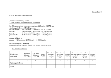 Załącznik nr 2 ................................................................ (Pieczęć Wykonawcy/ Wykonawców) „Formularz cenowy /wzór/ A. Cena i wartość dla dzierżawionego asortymentu Do obliczenia wartości miesięcznej należy przyjąć łącznie: 10.597,12 kg - bielizna pościelowa – 8 435,52 kg w tym: poszewki na jaśki : 1092 szt./mies. X 0,06 kg/ szt. – 65,52 kg/mies. poszewki: 6260 szt./mies. X 0,20 kg/ szt. – 1252,00 kg/mies. poszwy: 6240 szt./mies. X 0,60 kg/szt. – 3744,00 kg/mies. prześcieradło: 6748 szt./mies. X 0,50 kg/szt. – 3374,00 kg/mies. piżamy – 1349,60 kg piżamy: 1928 kpl./mies. X 0,70 kg/kpl. – 1349,60 kg/mies. koszule operacyjne – 812,00 kg koszule operacyjne: 1624 szt./mies. X 0,50 kg/szt. – 812,00 kg/mies. A.1. Dzierżawa bielizny Dzierżawiony asortyment 1 Bielizna pościelowa Piżamy Cena netto dzierżawy / 1 kg w PLN Cena brutto dzierżawy/ 1 kg w PLN Podatek VAT % Wartość netto dzierżawy/ 1 miesiąc w PLN Wartość brutto dzierżawy/ 1 miesiąc w PLN 2 3 4 5 6 Wartość netto Wartość brutto Podatek dzierżawy za 48 dzierżawy za 48 VAT % miesięcy/ miesięcy/ w PLN w PLN 7 8 9 Podatek VAT % 10 Koszule operacyjne Suma A.2. Cena usługi prania, naprawy, maglowania i transportu dla asortymentu dzierżawionego Dzierżawiony asortyment 1 Bielizna pościelowa Cena netto Cena brutto prania / prania / 1 kg 1 kg dzierżawionego dzierżawionego asortymentu asortymentu w PLN w PLN 2 3 Podatek VAT % Wartość netto prania dzierżawionego asortymentu / 1 miesiąc w PLN 4 5 Wartość netto Wartość brutto Wartość brutto prania prania prania Podatek dzierżawionego dzierżawionego dzierżawionego VAT % asortymentu /za asortymentu / asortymentu /1 48 miesięcy/ w za 48 miesięcy/ miesiąc w PLN PLN w PLN 6 7 8 9 Podatek VAT % 10 Piżamy Koszule operacyjne Suma B. Cena usługi prania, naprawy, maglowania i transportu dla bielizny będącej własnością Zamawiającego Do obliczenia wartości miesięcznej należy przyjąć 8 540 kg bielizny – Przedmiot zamówienia 1 Cena netto prania 1 kg bielizny w PLN Cena brutto prania 1 kg bielizny w PLN 2 3 Wartość netto Wartość Wartość netto Wartość prania brutto prania prania brutto prania Podatek Podatek bielizny / 1 bielizny/ 1 bielizny za 48 bielizny za 48 VAT % VAT % miesiąc w miesiąc w miesiący/ w miesiący/ w PLN PLN PLN PLN 4 5 6 7 8 9 Podatek VAT % 10 Bielizna będąca własnością Zamawiającego C. Łączna wartość oferty: Przedmiot zamówienia 1 Dzierżawa bielizny (tabela A.1) Pranie bielizny dzierżawionej (tabela A.2) Pranie bielizny będącej własnością Zamawiającego (tabela B) Wartość netto / 1 miesiąc w PLN Wartość brutto / 1 miesiąc w PLN Podatek VAT % Wartość netto za 48 miesięcy/ w PLN Wartość brutto za 48 miesięcy/ w PLN Podatek VAT % 2 3 4 5 6 7 Wartość łączna ..........................,dn.................... …………………………………………………… Podpisy wykonawcy lub osób upoważnionych do składania oświadczeń woli w imieniu wykonawcy