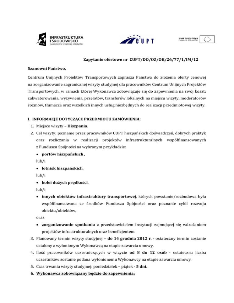 Zapytanie ofertowe nr CUPT/DO/OZ/OK/26/77/1/IM/12 Szanowni Państwo, Centrum Unijnych Projektów Transportowych zaprasza Państwa do złożenia oferty cenowej na zorganizowanie zagranicznej wizyty studyjnej dla pracowników Centrum Unijnych Projektów Transportowych, w ramach której Wykonawca zobowiązuje się do zapewnienia na swój koszt: zakwaterowania, wyżywienia, przelotów, transferów lokalnych na miejscu wizyty, moderatorów rozmów, tłumacza oraz wszelkich innych usług niezbędnych do realizacji przedmiotowej wizyty. I. INFORMACJE DOTYCZĄCE PRZEDMIOTU ZAMÓWIENIA: 1. Miejsce wizyty – Hiszpania. 2. Cel wizyty: poznanie przez pracowników CUPT hiszpańskich doświadczeń, dobrych praktyk oraz rozliczania w realizacji projektów infrastrukturalnych współfinansowanych z Funduszu Spójności na wybranym przykładzie: portów hiszpańskich , lub/i lotnisk hiszpańskich, lub/i kolei dużych prędkości, lub/i innych obiektów infrastruktury transportowej, których powstanie/rozbudowa była współfinansowana ze środków Funduszu Spójności oraz poznanie cykli rozwoju obiektu/obiektów, oraz zorganizowanie spotkania z przedstawicielem instytucji zajmującej się wdrażaniem projektów infrastrukturalnych oraz beneficjentem. 3. Planowany termin wizyty studyjnej – do 14 grudnia 2012 r. - ostateczny termin zostanie ustalony z wyłonionym Wykonawcą na etapie zawarcia umowy. 4. Ilość pracowników uczestniczących w wizycie od 8 do 12 osób - ostateczna liczba uczestników zostanie podana wyłonionemu Wykonawcy na etapie zawarcia umowy. 5. Czas trwania wizyty studyjnej: poniedziałek – piątek - 5 dni. 6. Wykonawca zobowiązany będzie do zapewnienia: 1) Organizacji całej wizyty – Wykonawca zobowiązany będzie do zapewnienia realizacji celu wizyty poprzez dotarcie do wybranych osób ze strony przedstawiciela instytucji zajmującej się wdrażaniem projektów infrastrukturalnych oraz beneficjenta, organizację spotkań oraz zapewnienie prezentacji obiektu/obiektów. Oficjalna część wizyty powinna trwać w godzinach 10.00-16.00 (w tym przerwa na obiad), z zastrzeżeniem, że w dniu przyjazdu i wyjazdu godziny harmonogramu oficjalnej części wizyty powinny być dopasowane do godzin lotu. Wykonawca zobowiązany jest do opisania w koncepcji szczegółowej organizacji wizyty, która powinna zawierać m.in.: a) plan wizyty - szczegółowy opis sposobu realizacji wizyty studyjnej, b) harmonogram zorganizowanej części wizyty w dniach i godzinach, c) wskazanie wizytowanego obiektu/obiektów infrastruktury transportowej z podaniem nazwy, lokalizacji, wartości projektu oraz kwoty dofinansowania ze środków UE, d) informację o spotkaniach z podaniem stanowisk/funkcji osób, z którymi prowadzone będą spotkania oraz nazw instytucji, które reprezentują, ze wskazaniem osób dokonujących prezentacji każdego obiektu infrastruktury transportowej (projektu), e) podanie tematów spotkań, Zamawiający dopuszcza zmiany w harmonogramie spotkań. Ewentualne zmiany w planie wizyty w stosunku do przedstawionego w ofercie harmonogramu mogą dotyczyć w szczególności godzin spotkań, kolejności poszczególnych części wizyty, pod warunkiem utrzymania celu wizyty. 2) Zakwaterowania - Wykonawca zobowiązany będzie dokonać rezerwacji i zakupu miejsc noclegowych dla uczestników na czas trwania wizyty studyjnej. Zamawiający wymaga zakwaterowania uczestników w hotelu co najmniej trzy gwiazdkowym, zlokalizowanym w granicach administracyjnych odwiedzanego miasta, w dobrze skomunikowanej części, w pokojach: dwa pokoje dwuosobowe, pozostałe jednoosobowe. 3) Wyżywienia - Wykonawca zobowiązany będzie do zapewnienia wyżywienia na miejscu wizyty zagranicznej obejmującego 2 posiłki (śniadanie i dwudaniowy obiad), cateringu podczas spotkań, z zastrzeżeniem, że w dniu przyjazdu i wyjazdu godziny posiłków powinny być dopasowane do godzin lotu. W dniu przyjazdu Wykonawca zapewni wyłącznie obiad. W dniu wyjazdu Wykonawca zapewni wyłącznie śniadanie lub, jeżeli wylot z Hiszpanii nastąpi po godzinie 18:00, śniadanie i obiad. Śniadania muszą być serwowane na terenie hotelu, w którym zakwaterowani zostaną uczestnicy. Wykonawca zapewni posiłki wegetariańskie dla osób, które zgłoszą taką opcję w liście uczestników. 4) Przelotów - Wykonawca dokona rezerwacji i zakupu biletów lotniczych dla wszystkich uczestników wizyty w zaplanowanym terminie na trasie Warszawa – Hiszpania - Warszawa. Wyloty i przyloty dopuszcza się wyłącznie z i na lotnisko w Warszawie. Uczestnicy wizyt podróżować będą bez przesiadek, samolotem charterowym, liniami rejsowymi lub tzw. tanimi liniami lotniczymi, w klasie ekonomicznej, z jedną sztuką bagażu podręcznego na każdego uczestnika (maksymalną wagę i wymiary bagażu podręcznego zgodnie z zasadami linii lotniczej przedstawi Wykonawca) oraz z jedną sztuką bagażu rejestrowanego do 15 kg na uczestnika. Zamawiający dopuszcza dostarczenie biletów lotniczych Zamawiającemu w formie biletu elektronicznego. Bilet lotniczy musi obejmować również opłaty lotniskowe. 5) Transfery lokalne na miejscu wizyty - Wykonawca zapewni wszelkie transfery lokalne na miejscu wizyty. Wszystkie transfery powinny zostać wykonane busem (data pierwszej rejestracji lub rok produkcji nie wcześniejszy niż 2004 r.) przystosowanym do przewozu ww. liczby osób, wyposażonym w klimatyzację. Transfery będą obejmowały m.in. odebranie z lotniska, przejazdy w czasie wizyty na poszczególne obiekty, dowóz osób z/do hotelu, przejazd na lotnisko w dniu wyjazdu, itp. 6) Wynajem sali/sal na spotkania. 7) Organizację spotkań w czasie wizyty z przedstawicielami wizytowanych placówek – zapewnienie eksperta/ekspertów i/lub moderatora/moderatorów do przeprowadzenia wykładów oraz prowadzenia spotkań. Organizację spotkań wraz z wskazaniem ekspertów i/lub moderatorów należy szczegółowo opisać w koncepcji. ekspert/eksperci i/lub moderator