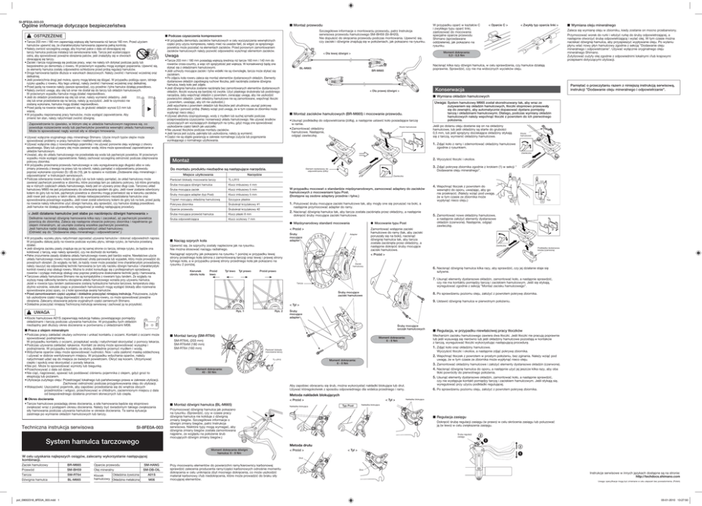 SI-8FE0A-003-03 Ogólne informacje dotyczące bezpieczeństwa ■ Montaż przewodu OSTRZEŻENIE • Tarcze 203 mm i 180 mm zapewniają większą siłę hamowania niż tarcze 160 mm. Przed użyciem hamulców upewnić się, że charakterystyka hamowania zapewnia pełną kontrolę. • Należy zwrócić szczególną uwagę, aby trzymać palce z dala od obracającej się tarczy hamulca podczas instalacji lub serwisowania koła. Tarcza jest wystarczająco ostra, aby spowodować poważne obrażenia palców, jeśli znalazłyby się w otworach obracającej się tarczy. • Zaciski i tarcza rozgrzewają się podczas pracy, więc nie należy ich dotykać podczas jazdy lub bezpośrednio po demontażu z roweru. W przeciwnym wypadku mogą wystąpić poparzenia. Upewnić się, że elementy hamulca zostały odpowiednio schłodzone przed próbą regulacji hamulców. • Droga hamowania będzie dłuższa w warunkach deszczowych. Należy zwolnić i hamować wcześniej oraz delikatniej. • Jeśli powierzchnia drogi jest mokra, opony mogą łatwiej się ślizgać. W przypadku poślizgu opon, istnieje ryzyko upadku z roweru. Aby tego uniknąć, należy zwolnić i hamować wcześniej oraz delikatniej. • Przed jazdą na rowerze należy zawsze sprawdzać, czy przednie i tylne hamulce działają prawidłowo. • Należy zwrócić uwagę, aby olej lub smar nie dostał się do tarczy lub okładzin hamulcowych. W przeciwnym wypadku hamulce mogą działać nieprawidłowo. • Jeśli do okładzin przedostanie się olej lub smar, należy wymienić okładziny. Jeśli olej lub smar przedostanie się na tarczę, należy ją wyczyścić. Jeśli te czynności nie zostaną wykonane, hamulce mogą działać nieprawidłowo. • Przed jazdą na rowerze należy upewnić się, że grubość okładzin wynosi 0,5 mm lub więcej. • W przypadku nieprzerwanej pracy hamulców, może wystąpić zapowietrzenie. Aby zmienić ten stan, należy natychmiast zwolnić dźwignię. Zapowietrzenie to zjawisko, w którym olej w układzie hamulcowym nagrzewa się, co powoduje rozszerzenie wody lub pęcherzyków powietrza wewnątrz układu hamulcowego. Może to spowodować nagły wzrost siły w dźwigni hmowania. • Używać wyłącznie oryginalnego oleju mineralnego Shimano. Użycie innych typów olejów może spowodować problemy w pracy hamulców i nieefektywność układu. • Używać wyłącznie oleju z nowootwartego pojemnika i nie używać ponownie oleju wylanego z otworu spustowego. Stary lub używany olej może zawierać wodę, która może spowodować zapowietrzanie w układzie hamulcowym. • Uważać, aby do układu hamulcowego nie przedostała się woda lub pęcherzyki powietrza. W przeciwnym wypadku może wystąpić zapowietrzenie. Należy zachować szczególną ostrożność podczas zdejmowania pokrywy zbiornika. • W przypadku przecinania przewodu hamulcowego w celu wyregulowania jego długości albo w celu zmiany przewodu z lewego na prawy lub na odwrót, należy pamiętać o odpowietrzeniu przewodu poprzez wykonanie czynności (5) i (8) do (10), jak to opisano w rozdziale „Dodawanie oleju mineralnego i odpowietrzanie” w Instrukcjach serwisowych. • Podczas odwracania roweru kołami do góry lub na bok należy pamiętać, że układ hamulcowy może zawierać pęcherzyki powietrza w zbiorniku, które pozostają tam po założeniu pokrywy, lub które gromadzą się w różnych częściach układu hamulcowego, kiedy jest on używany przez długi czas. Tarczowy układ hamulcowy M665 nie jest przystosowany do odwracania spodem do góry. Jeśli rower zostanie odwrócony kołami do góry lub na bok, pęcherzyki powietrza w zbiorniku mogą przemieścić się w kierunku zacisków. Jeśli rower jest używany w takim stanie, istnieje niebezpieczeństwo niezadziałania hamulców oraz spowodowania poważnego wypadku. Jeśli rower został odwrócony kołami do góry lub na bok, przed jazdą na rowerze należy kilkukrotnie użyć dźwigni hamulca, aby sprawdzić, czy hamulce działają prawidłowo. Jeśli hamulce nie działają prawidłowo, wyregulować je według następującej procedury. < Jeśli działanie hamulców jest słabe po naciśnięciu dźwigni hamowania > Delikatnie nacisnąć dźwignię hamowania kilka razy i zaczekać, aż pęcherzyki powietrza powrócą do zbiornika. Zaleca się następnie otwarcie pokrywy zbiornika i napełnienie go olejem mineralnym, aż usunięte zostaną wszelkie pęcherzyki powietrza. Jesli hamulce nadal działają słabo, odpowietrzyć układ hamulcowy. (Odnieść się do "Dodawanie oleju mineralnego i odpowietrzanie".) • W przypadku wycieku płynu natychmiast zaprzestać używania hamulców i dokonać odpowiednich napraw. W przypadku dalszej jazdy na rowerze podczas wycieku płynu, istnieje ryzyko, że hamulce przestaną działać. • Jeśli dźwignia zacisku piasty znajduje się po tej samej stronie co tarcza, istnieje ryzyko, że będzie ona kolidować z tarczą, więc należy sprawdzić, czy nie dochodzi do kontaktu. • Pełne zrozumienie zasady działania układu hamulcowego roweru jest bardzo ważne. Niewłaściwe użycie układu hamulcowego roweru może spowodować utratę panowania lub wypadek, który może prowadzić do poważnych obrażeń. Ze względu na fakt, że każdy rower może posiadać inne charakterystyki prowadzenia, należy nauczyć się odpowiednej techniki hamowania (w tym siły nacisku dźwigni hamulca i charakterystyki kontroli roweru) oraz obsługi roweru. Można to zrobić konsultując się z profesjonalnym sprzedawcą rowerów i czytając instrukcję obsługi oraz poprzez praktyczne doskonalenie techniki jazdy i hamowania. • Tarczowe układy hamulcowe Shimano nie są kompatybilne z rowerami typu tandem. Ze względu na wyższą masę całkowitą tandemu obciążenie układu hamulcowego wzrasta przy używaniu hamulca. Jeżeli w rowerze typu tandem zastosowane zostaną hydrauliczne hamulce tarczowe, temperatura oleju zbytnio wzrośnie, wskutek czego w przewodach ha