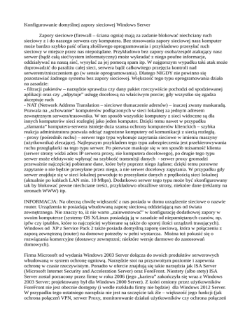 Konfigurowanie domyślnej zapory sieciowej Windows Server Zapory sieciowe (firewall – ściana ognia) mają za zadanie blokować niechciany ruch sieciowy z i do naszego serwera czy komputera. Bez stosowania zapory sieciowej nasz komputer może bardzo szybko paść ofiarą złośliwego oprogramowania i przykładowo przesyłać ruch sieciowy w miejsce przez nas niepożądane. Przykładowo bez zapory osoba/zespół atakujący nasz serwer (bądź całą sieć/system informatyczny) może wykradać z niego poufne informacje, oddziaływać na naszą sieć, wysyłać za jej pomocą spam itp. W najgorszym wypadku taki atak może doprowadzić do paraliżu całej sieci, serwera bądź całkowitego przejęcia kontroli nad serwerem/zniszczeniem go (w sensie oprogramowania). Dlatego NIGDY nie powinno się pozostawiać żadnego systemu bez zapory sieciowej. Większość tego typu oprogramowania działa na zasadzie: - filtracji pakietów – narzędzie sprawdza czy dany pakiet rzeczywiście pochodzi od spodziewanej aplikacji oraz czy „odpytuje” usługę docelową na właściwym porcie; gdy wszystko się zgadza akceptuje ruch - NAT (Network Address Translation – sieciowe tłumaczenie adresów) – inaczej zwany maskaradą. Pozwala na „schowanie” komputerów podłączonych w sieci lokalnej za jednym adresem zewnętrznym serwera/trasownika. W ten sposób wszystkie komputery z sieci widoczne są dla innych komputerów sieci rozległej jako jeden komputer. Dzięki temu nawet w przypadku „złamania” komputera-serwera istnieje duża szansa ochrony komputerów klienckich – szybka reakcja administratora pozwala odciąć zagrożone komputery od komunikacji z siecią rozległą. - proxy (pośrednik ruchu) – serwer tego typu wykonuje zapytania sieciowe w imieniu maszyny (użytkownika) zlecającej. Najlepszym przykładem tego typu zabezpieczenia jest przekierowywania ruchu przeglądarki na tego typu serwer. Po pierwsze maskuje się w ten sposób tożsamość klienta (serwer strony widzi adres IP serwera proxy, nie komputera docelowego), po drugie tego typu serwer może efektywnie wpłynąć na szybkość transmisji danych - serwer proxy gromadzi przeważnie najczęściej pobierane dane, które były poprzez niego żądane; dzięki temu ponowne zapytanie o nie będzie przesyłane przez niego, a nie serwer docelowy zapytania. W przypadku gdy serwer znajduje się w sieci lokalnej powoduje to przesyłanie danych z prędkością sieci lokalnej (aktualnie po kablach LAN min. 10 Mbps). Dodatkowo serwer tego typu może być skonfigurowany tak by blokować pewne niechciane treści, przykładowo obraźliwe strony, niektóre dane (reklamy na stronach WWW) itp. INFORMACJA: Na obecną chwilę większość z nas posiada w domu urządzenie sieciowe o nazwie router. Urządzenia te posiadają wbudowaną zaporę sieciową oddzielającą nas od świata zewnętrznego. Nie znaczy to, iż nie warto „zainwestować” w konfigurację dodatkowej zapory w swoim komputerze (systemy OS X/Linux posiadają ją w zasadzie od niepamiętanych czasów, np. ipfw czy iptables, które to najczęściej wybierane są także do sporej ilości urządzeń trasujących). Windows od XP z Service Pack 2 także posiada domyślną zaporę sieciową, która w połączeniu z zaporą zewnętrzną (router) na domowe potrzeby w pełni wystarcza. Można też pokusić się o rozwiązania komercyjne (dostawcy zewnętrzni; niektóre wersje darmowe do zastosowań domowych). Firma Microsoft od wydania Windows 2003 Server dołącza do swoich produktów serwerowych wbudowaną w system ochronę ogniową. Narzędzie stoi na przyzwoitym poziomie i zapewnia ochronę w czasie rzeczywistym. Ponadto w ofercie znajdują się takie narzędzia jak ISA Server (Microsoft Internet Security and Acceleration Server) oraz ForeFront. Niestety (albo stety) ISA Server został porzucony przez firmę w roku 2006 (jego „kariera” zakończyła się wraz z Windows 2003 Server; projektowany był dla Windows 2000 Server). Z kolei ceniony przez użytkowników ForeFront nie jest obecnie dostępny (i wedle rozkładu firmy nie będzie) dla Windows 2012 Server. W przypadku tego ostatniego narzędzia nie jest na szczęście tak źle – większość jego funkcji (jak ochrona połączeń VPN, serwer Proxy, monitorowanie działań użytkowników czy ochrona połączeń zdalnych) zostały zaimplementowane jako role i narzędzia serwera Windows 2012 R2 (wydany w roku 2014). Na zajęciach bliżej poznamy możliwości standardowej (domyślnej) zapory sieciowej systemu Windows. Prócz samej ochrony pozwala ona także na inne operacje (w połączeniu z usługą ActiveDirectory). 1. Konfiguracja i użytkowanie Konfigurowanie zapory sieciowej w systemie Windows 2012 można rozpocząć od wybrania jej w menu Narzędzia->Zapora systemu Windows z zabezpieczeniami zaawansowanymi Proszę pamiętać by nie wybierać opcji zapory sieciowej poprzez Panel sterowania – tam pierwotnie otworzy się identyczne okno do tego, jakie możemy zobaczyć np. w systemie Windows 8 (trzeba dodatkowo wybierać opcje zaawansowane). Okno zaawansowanej zapory sieciowej to nic innego jak jedna z przystawek systemu Windows. Okno pozwala na pełną konfigurację zasad zabezpieczenia danego komputera. Po prawej stronie mamy możliwe akcje: - Importuj zasady.../Eksportuj zasady... - funkcja pozwala na wyeksportowanie bieżących zasad zapory do pliku. Następnie tego typu plik można importować na tym samym komputerze (eksport jest formą kopii bezpieczeństwa ustawień zapory) jak też importować z niego zasady na inny komputer (bądź do zasad domeny) - Przywróć zasady domyślne – przywraca zasady jakie domyślnie sugeruje Microsoft. Dotyczy to zarówno właściwości zapory jak i reguł przychodzących/wychodzących oraz zabezpieczeń połączeń sieciowych - Diagnozuj/napraw – opcja ogólna dla wszystkich ustawień sieci w systemie Windows; kreator próbuje pomóc ustalić aktualny problem z dostępem do sieci