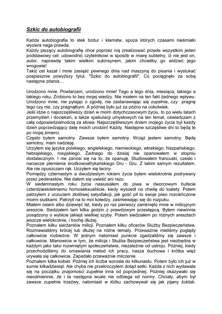 Szkic do autobiografii Każda autobiografia to stek bzdur i kłamstw, spoza których czasami nieśmiało wyziera naga prawda. Każdy piszący autobiografię chce poprzez nią zrealizować przede wszystkim jeden podstawowy cel: udowodnić czytelnikowi w sposób w miarę subtelny, iż nie jest on, autor, naprawdę takim wielkim sukinsynem, jakim chcieliby go widzieć jego wrogowie! Takiż cel kazał i mnie zasiąść pewnego dnia nad maszyną do pisania i wystukać pospiesznie powyższy tytuł, "Szkic do autobiografii". Co pociągnęło za sobą następne zdania… Urodzono mnie. Powtarzam, urodzono mnie! Tego a tego dnia, miesiąca, takiego a takiego roku. Zrobiono to bez mojej wiedzy. Nie miałem na ten fakt żadnego wpływu. Urodzono mnie, nie pytając o zgodę, nie zastanawiając się zupełnie, czy pragnę tego czy nie, czy pragnąłbym. A później było już za późno na cokolwiek. Jeśli idzie o najszczęśliwszy dzień w moim dotychczasowym życiu, to po wielu latach przemyśleń i dociekań, a także spekulacji umysłowych na ten temat, oświadczam z całą odpowiedzialnością za słowa: Najszczęśliwszym dniem mojego życia był każdy dzień poprzedzający datę moich urodzin! Każdy. Następne szczęśliwe dni to będą te po mojej śmierci. Często byłem samotny. Zawsze byłem samotny. Wciąż jestem samotny. Będę samotny, mam nadzieję. Uczyłem się języka polskiego, angielskiego, niemieckiego, włoskiego, hiszpańskiego, hebrajskiego, rosyjskiego. Żadnego do dzisiaj nie opanowałem w stopniu dostatecznym. I nie zanosi się na to, że opanuję. Studiowałem francuski, czeski i narzecze plemienia środkowoafrykańskiego Dru - Gru. Z takim samym rezultatem. Ale nie opuszczam rąk. Uczyłem się łaciny. Pomiędzy czternastym a dwudziestym rokiem życia byłem wielokrotnie podrywany przez pederastów. Nie dałem się uwieść ani razu. W siedemnastym roku życia nasiusiałem do piwa w dworcowym bufecie czterdziestoletniemu homoseksualiście, kiedy wyszedł na chwilę do toalety. Potem patrzyłem z uczuciem złośliwej satysfakcji, jak gość pił to swoje piwo rozcieńczone moimi siuśkami. Patrzyli na to moi koledzy, zaśmiewając się do rozpuku. Miałem osiem albo dziewięć lat, kiedy po raz pierwszy zamknięto mnie w milicyjnym areszcie. Siedziałem tam kilka godzin z prawdziwym przestępcą. Byłem niewinnie posądzony o wybicie jakiejś wielkiej szyby. Potem siedziałem po różnych aresztach jeszcze wielokrotnie, i trochę dłużej. Poznałem kilku sierżantów milicji. Poznałem kilku oficerów Służby Bezpieczeństwa. Rozmawialiśmy krócej lub dłużej na różne tematy. Przeważnie mieliśmy poglądy całkowicie rozbieżne. W jednym natomiast punkcie zgadzaliśmy się zawsze i całkowicie. Mianowicie w tym, że milicja i Służba Bezpieczeństwa jest niezbędna w każdym jako tako rozwiniętym społeczeństwie, niezależnie od ustroju. Później, kiedy przechodziliśmy do omawiania metod ich pracy, nasza duchowa i krótka więź urywała się całkowicie. Zapadało przeważnie milczenie. Poznałem kilka kobiet. Później ich liczba wzrosła do kilkunastu. Potem było ich już w sumie kilkadziesiąt. Ale chyba nie przekroczyłem dotąd setki. Każda z nich wydawała się na początku znajomości zupełnie inna od poprzedniej. Później okazywało się nieodmiennie, że i ta następna wcale nie odbiega od normy. Chciały, abym był zawsze zupełnie trzeźwy, natomiast w łóżku zachowywał się jak pijany żołdak. Mówiły górnolotne bzdury głosem pełnym pretensji. Oczy błyszczały im prawdziwym uniesieniem dopiero wtedy, kiedy otrzymywały prezenty. Słowo "kocham" wymawiały znudzonym, monotonnym głosem, jak na odczepkę. Wszystkie miewały humory. Raz jedyny poznałem dziewczynę, w której zakochałem się bez pamięci, jedyny raz w życiu. Była zupełnie wyjątkowa. Następne dni ugruntowały tę wyjątkowość. Okazało się, że to zupełna wariatka, stała pacjentka zakładu psychiatrycznego, nieuleczalnie chora. Moje szczęście okazało się moim pechem. Ale to była zupełnie wyjątkowa dziewczyna, tak w pierwszych trzech dniach. Piłem wódkę. Piłem piwo. Piłem wino, owocowe i gronowe, deserowe i wytrawne, białe, czerwone i ze spirytusem. Piłem spirytus. Piłem wodę kolońską, wodę brzozową, bimber, denaturat i salicyl. Piłem jeszcze inne świństwa, które albo są produkowane na bazie alkoholu, albo działają jak alkohol. Piłem krople walerianowe, miętowe i nasercowe. Zażywałem psychotropy. Nie znałem nigdy żadnych narkomanów i może z tego powodu nigdy się nie narkotyzowałem. Dlatego nie wpadłem w nałóg. Nigdy nie miałem w ręku żadnych narkotyków, ani tych klasycznych, ani rodzimych kompotów. Ale niewykluczone, że będę miał. Nie jestem alkoholikiem, chyba. Piję w towarzystwie kilka kieliszków. Wygląda to mniej więcej tak. W bardzo wytwornym towarzystwie wypijam jeden kieliszek maksimum, żeby się nie zbłaźnić. W trochę gorszym towarzystwie dwa. Im niżej, tym ilość wypitych kieliszków zazwyczaj się zwiększa. Z przyjaciółmi upijam się do oporu, jeśli owi przyjaciele akurat piją. Samotnie wypijam ćwiartkę wódki albo butelkę wina i kładę się spać. Wierzę w Boga. Wierzę, że wszyscy inni bogowie wszystkich innych religii to ten sam Bóg, jeden i jedyny. Obrządki rytualne się nie liczą. Jest jeden Bóg. Wierzę w życie pozagrobowe. Wierzę w śmierć, ufam jej. Po śmierci zajmie się nami Bóg i poprowadzi nas dalej, w to wierzyć jest najlepiej i najwygodniej, dobrze to wykalkulowałem! Dlaczegóż miałbym utrudniać sobie życie i pozbawiać się Boga, mojego przyjaciela i opiekuna? Wymieniam imiona i nazwiska kobiet, z którymi spałem. Wróć. Wymieniam tylko ich imiona: Barbara, Lucyna, Stanisława, Maria, Marta, Bożena, Ewa, Elżbieta, Krystyna. Ach, to daremna wyliczanka, niektóre imiona jako popularne, powtarzają się kilkakrotnie, inne zapomniałem. Całe życie 