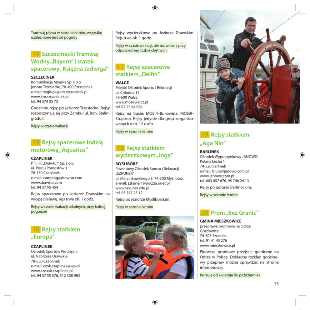 Tramwaj pływa w sezonie letnim, wszystko uzależnione jest od pogody 14 Szczecinecki Tramwaj Wodny „Bayern” i statek spacerowy „Księżna Jadwiga” SZCZECINEK Komunikacja Miejska Sp. z o.o. jezioro Trzesiecko, 78-400 Szczecinek e-mail: [email protected] www.km.szczecinek.pl tel. 94 374 35 73 Godzinne rejsy po jeziorze Trzesiecko. Rejsy rozpoczynają się przy Zamku (ul. Boh. Stalingradu). Rejsy w czasie wakacji Rejsy wycieczkowe po Jeziorze Drawskim. Rejs trwa ok. 1 godz. Rejsy w czasie wakacji, ale też wiosną przy odpowiedniej liczbie chętnych. 17 Rejsy spacerowe statkiem „Delfin” WAŁCZ Miejski Ośrodek Sportu i Rekreacji ul. Chłodna 12 78-600 Wałcz www.mosirwalcz.pl tel. 67 25 84 056 Rejsy na trasie: MOSiR–Bukowina, MOSiR– Strączno. Rejsy jedynie dla grup zorganizowanych min. 12 osób. Rejsy w sezonie letnim 15 Rejsy spacerowe łodzią motorową „Aquarius” CZAPLINEK P. T. i R. „Drawtur” Sp. z o.o. ul. Pięciu Pomostów 1 78-550 Czaplinek e-mail: [email protected] www.drawtur.com tel. 94 37 55 454 Rejsy spacerowe po Jeziorze Drawskim na wyspę Bielawę, rejs trwa ok. 1 godz. Rejsy w czasie wakacji szkolnych, przy ładnej pogodzie 18 Rejsy statkiem wycieczkowym „Inga” MYŚLIBÓRZ Powiatowy Ośrodek Sportu i Rekreacji „SZKUNER” ul. Marcinkowskiego 5, 74-300 Myślibórz e-mail: [email protected] www.szkuner.edu.pl tel. 95 747 25 12 Rejsy po jeziorze Myśliborskim. Rejsy w sezonie letnim 19 Rejsy statkiem „Aga Nin” BARLINEK Ośrodek Wypoczynkowy JANOWO Polana Lecha 1 74-320 Barlinek e-mail: [email protected] www.janowo.com.pl tel. 603 057 676, 95 746 24 13 Rejsy po jeziorze Barlineckim. Rejsy w sezonie letnim 20 Prom „Bez Granic” GMINA MIESZKOWICE 16 Rejsy statkiem „Europa” CZAPLINEK Ośrodek Sportów Wodnych ul. Nabrzeże Drawskie 78-550 Czaplinek e-mail: [email protected] www.czoksir.czaplinek.pl tel. 94 37 55 576, 512 338 983 przeprawa promowa na Odrze Gozdowice 74-505 Szczecin tel. 91 41 45 276 www.mieszkowice.pl Pierwsze promowe przejście graniczne na Odrze w Polsce. Dokładny rozkład godzinowy przepraw można sprawdzić na stronie internetowej. Kursuje od kwietnia do października 15