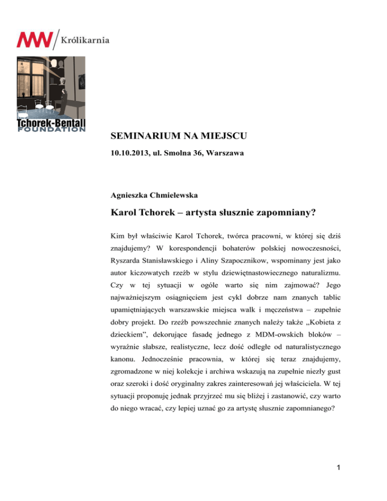 SEMINARIUM NA MIEJSCU 10.10.2013, ul. Smolna 36, Warszawa Agnieszka Chmielewska Karol Tchorek – artysta słusznie zapomniany? Kim był właściwie Karol Tchorek, twórca pracowni, w której się dziś znajdujemy? W korespondencji bohaterów polskiej nowoczesności, Ryszarda Stanisławskiego i Aliny Szapocznikow, wspominany jest jako autor kiczowatych rzeźb w stylu dziewiętnastowiecznego naturalizmu. Czy w tej sytuacji w ogóle warto się nim zajmować? Jego najważniejszym osiągnięciem jest cykl dobrze nam znanych tablic upamiętniających warszawskie miejsca walk i męczeństwa – zupełnie dobry projekt. Do rzeźb powszechnie znanych należy także „Kobieta z dzieckiem”, dekorujące fasadę jednego z MDM-owskich bloków – wyraźnie słabsze, realistyczne, lecz dość odległe od naturalistycznego kanonu. Jednocześnie pracownia, w której się teraz znajdujemy, zgromadzone w niej kolekcje i archiwa wskazują na zupełnie niezły gust oraz szeroki i dość oryginalny zakres zainteresowań jej właściciela. W tej sytuacji proponuję jednak przyjrzeć mu się bliżej i zastanowić, czy warto do niego wracać, czy lepiej uznać go za artystę słusznie zapomnianego? 1 Karol Tchorek – urodzony 30 X 1904 roku w Serocku, zmarły 10 IV 1985 roku w Warszawie – był rzeźbiarzem, medalierem, marszandem i kolekcjonerem, a także mężem Zofii z Kochanowiczów (tkaczki), z którą miał dwóch synów, Mariusza oraz Olafa. Ze względu na pochodzenie – uboga rodzina chłopska – jego edukacja przebiegała mozolnie i powoli. Rzeźby uczył się najpierw, w latach 1922-1926, w Miejskiej Szkole Sztuk Zdobniczych i Malarstwa w Warszawie u Jana Szczepkowskiego, a później, od 1931 roku, w warszawskiej Szkole Sztuk Pięknych pod kierunkiem Tadeusza Breyera. Już w czasie studiów uczestniczył w życiu artystycznym (od 1929 roku był członkiem Spółdzielni Rzeźbiarskiej „Forma”), brał udział w licznych konkursach i wystawach m.in. w latach 1937-1938 w konkursie na projekt sarkofagu Józefa Piłsudskiego, w wystawach międzynarodowych w Paryżu w 1937 roku i w Nowym Jorku w 1939 roku. W latach 1943-1944 i 1945-1951 prowadził Salon Sztuki „Nike” w Warszawie. Zaraz po wojnie uczestniczył w reaktywacji Związku Polskich Artystów Plastyków, gdzie w latach 1945-1946 był sekretarzem Prezydium Zarządu Głównego, a później działał we władzach Sekcji Rzeźby Oddziału Warszawskiego. W latach 1960-1967 był doradcą artystycznym Pracowni Rzeźby Pracowni Sztuk Plastycznych. Brał udział we wszystkich ważniejszych powojennych wystawach, wśród których były: I, II i III Ogólnopolska Wystawa Plastyki, „Plastycy w walce o pokój” (1950), „Rzeźba warszawska 1945-1958”, „Rzeźba Polska 1945-60”, „Rzeźba w XV-lecie PRL”, „XX lat Ludowego Wojska Polskiego w twórczości plastycznej”; w 1955 roku otrzymał Medal X-lecia Polski Ludowej i Srebrny Krzyż Zasługi, w 1966 roku – Medal Brązowy za Zasługi dla Obronności Kraju, w 1980 roku – Krzyż Kawalerski orderu Odrodzenia Polski. Przed wojną Karol Tchorek wykonał takie rzeźby, jak m.in: „Kurpianka” (1933), „Kolędnicy” i „Portret Matki” (1934), „Dziecko leżące” (1938). Zaraz po wojnie, w 1949 roku, wygrał ogólnopolski 2 konkurs SARP na projekt tablic upamiętniających warszawskie miejsca walk i męczeństwa, których zrealizowano około dwustu. Poza tablicami, wśród jego najważniejszych prac powojennych należy wymienić: wspomnianą już „Kobietę z dzieckiem” (1952), tympanon oraz dekoracje sali teatralnej w Domu Kultury na Targówku (1955), statuetkę nagrody klubu krytyki filmowej – „Warszawską Syrenkę” (1958), Pomnik Żołnierzy i Partyzantów w Ostrowi Mazowieckiej (1960), popiersie Ignacego J. Kraszewskiego w kościele św. Krzyża (1961), nagrobek Władysława Strzemińskiego (1962), pomnik żołnierzy polskich w Perth w Wielkiej Brytanii (1970) oraz rzeźbę „Warszawska Jesień” stojącą na tyłach Akademii Muzycznej w Warszawie (1975). Artysta niesłusznie zapomniany? Nawet jeśli ze względów artystycznych zakwalifikujemy Karola Tchorka jako rzeźbiarza drugorzędnego, powinniśmy docenić pierwszorzędny stopień zachowania dotyczących go materiałów – dysponujemy pracownią wraz z jej wyposażeniem: rzeźbami Karola Tchorka, jego kolekcją dzieł sztuki i rzemiosła artystycznego (ze szczególnym uwzględnieniem prac Leona Kudły) oraz obszernym archiwum. Pozwala to na szczegółowe opracowanie jego biografii i dorobku z uwzględnieniem perspektywy bliższej artyście, dotyczącej spraw drobnych i mało istotnych w skali makro, ale też często rzucających ciekawe światło na szerzej znane problemy. Jest to perspektywa inna od tych, których może dostarczyć prasa, oferująca obraz oficjalny i raczej propagandowy, czy archiwa PRL-owskich instytucji odpowiedzialnych za sprawy sztuki, brakowane przede wszystkim pod kątem formalnoprawnym – oba typy źródeł często ukrywają sprawy niewygodne z punktu widzenia administracji państwowej różnych szczebli. Inna jest także perspektywa instytucji artystycznych zajmujących się 3 dokumentowaniem sztuki nowoczesnej, związanych z polem artystycznym i dokonujących selekcji materiału pod kątem tradycji autonomii sztuki. Karola Tchorka można – jak myślę – uznać za przykład reprezentatywny dla środowiska rzeźbiarzy wykształconych przed wojną w pracowni Tadeusza Breyera, których dojrzałe lata przypadły na okres powojenny. Rzeźbiarze ci wydają się stanowić kategorię wartą wydzielenia ze względu na szczególne uzależnienie od mecenasa państwowego – szczyt ich możliwości twórczych przypadał na lata pięćdziesiąte i szceśćdziesiąte, kiedy trudno było myśleć o realizacji poważniejszych prac rzeźbiarskich na zlecenia prywatne, istniały natomiast stosunkowo duże możliwości udziału w dekoracji przestrzeni publicznej odbudowywanego kraju, przede wszy