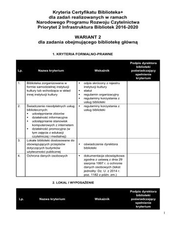 Kryteria Certyfikatu Biblioteka+ dla zadań realizowanych w ramach Narodowego Programu Rozwoju Czytelnictwa Priorytet 2 Infrastruktura Bibliotek 2016-2020 WARIANT 2 dla zadania obejmującego bibliotekę główną 1. KRYTERIA FORMALNO-PRAWNE Lp.. 1. 2. 3. 4. Wskaźnik Nazwa kryterium Biblioteka zorganizowana w formie samodzielnej instytucji kultury lub wchodząca w skład innej instytucji kultury Świadczenie nieodpłatnych usług bibliotecznych: udostępnianie zbiorów działalność informacyjna udostępnianie stanowisk komputerowych z internetem działalność promocyjna (w tym zajęcia z edukacji czytelniczej i medialnej) Lokale biblioteki dostosowane do obowiązujących przepisów dotyczących budynków użyteczności publicznej Ochrona danych osobowych Podpis dyrektora biblioteki poświadczający spełnienie kryterium odpis skrócony z rejestru instytucji kultury statut regulamin organizacyjny regulaminy korzystania z usług biblioteki regulaminy korzystania z usług biblioteki oświadczenie dyrektora biblioteki dokumentacja obowiązkowa zgodna z ustawą z dnia 29 sierpnia 1997 r. o ochronie danych osobowych (tekst jednolity: Dz. U. z 2014 r. poz. 1182 z późn. zm.) 2. LOKAL I WYPOSAŻENIE Lp.. Nazwa kryterium Wskaźnik Podpis dyrektora biblioteki poświadczający spełnienie kryterium 1 5. Lokale – powierzchnia pomieszczeń bibliotecznych 6. Dostęp do biblioteki 7. Aranżacja powierzchni i wyposażenie 8. Identyfikacja wizualna do 5 000 mieszk. gminy min. 150 m2 powyżej 5 000 mieszk. gminy – min. 300 m2 powyżej 10 000 mieszk. gminy – min. 400 m2 powyżej 35 000 mieszk. gminy – min. 500 m2 biblioteka przystosowana do obsługi osób niepełnosprawnych z różnymi dysfunkcjami, z wyjątkiem przypadków, gdy nie będzie to możliwe z przyczyn technicznobudowlanych informacja o bibliotece włączona w system jej rozpoznawalności na terenie gminy, poprzez obowiązkowe wprowadzenie jednolitej identyfikacji wizualnej biblioteki w otoczeniu, w tym drogowskazów do biblioteki w formie znaków informujących o obiektach użyteczności publicznej stawianych przez gminę funkcjonalne powierzchnie z przeznaczeniem na zbiory biblioteczne, obsługę różnych kategorii czytelników (w tym miejsca siedzące do pracy indywidualnej, grupowej oraz obsługi imprez czytelniczych) wolny dostęp do zbiorów pomieszczenia dla personelu (pomieszczenia biurowe/socjalne). ergonomiczne meble dostosowane do: a) grup wiekowych i/lub kategorii czytelników b) rodzajów zbiorów bibliotecznych c) stanowisk komputerowych jednolita i czytelna identyfikacja wizualna i graficzna 2 szyld oraz informacja o godzinach otwarcia na zewnątrz lokalu serwis WWW (w tym BIP na stronie własnej lub urzędu gminy)) 3. INFRASTRUKTURA TELEINFORMATYCZNA Lp.. Wskaźnik Nazwa kryterium 9. Stanowiska komputerowe 10. Urządzenia peryferyjne Podpis dyrektora biblioteki poświadczający spełnienie kryterium do 10 000 mieszk. gminymin. 1 stanowisko komputerowe dla czytelników / 2,5 tys. mieszkańców gminy; ale nie mniej niż 2 stanowiska komputerowe powyżej 10 000 mieszk. gminy- min. 1 stanowisko komputerowe dla czytelników / 5,0 tys. mieszk. gminy, ale nie mniej niż 4 stanowiska komputerowe powyżej 35 000 mieszk. gminy- min. 1 stanowisko komputerowe dla czytelników / 7,5 tys. mieszk. gminy, ale nie mniej niż 6 stanowisk komputerowych stanowisko komputerowe z ekranem o rozdzielczości min. 1024768, z dostępem do Internetu, z możliwością uruchomienia podanego w pkt. 13 oprogramowania min. 2 stanowiska komputerowe dla pracowników, w tym jedno stanowisko komputerowe pełniące funkcję serwera stanowisko komputerowe z ekranem o rozdzielczości min. 1024768, z dostępem do Internetu, z możliwością uruchomienia podanego w pkt. 13 oprogramowania drukarka laserowa i/lub urządzenie wielofunkcyjne 3 11. Sieć / Internet 12. Inne urządzenia 13. Oprogramowanie 14. Łączność telefoniczna skaner płaski i/lub urządzenie wielofunkcyjne czytnik kart pamięci nagrywarka DVD lub Bluray kamera internetowa, słuchawki, mikrofon łącze internetowe o przepustowości minimum 2Mb/s hot spot zgodny z 802.1b/g router z funkcjonalnością bramy ogniowej i organizacji ruchu sieciowego wszystkie komputery połączone siecią wewnętrzną minimum FastEthernet lub bezprzewodowo 802.1g kserokopiarka i/lub urządzenie wielofunkcyjne aparat cyfrowy projektor multimedialny i ekran nagłośnienie UPS − 1 / na każde stanowisko z systemem bibliotecznym graficzny, sieciowy system operacyjny, polskie znaki w standardzie UTF-8 program antywirusowy edytor tekstów, arkusz kalkulacyjny program do tworzenia prezentacji multimedialnych program graficzny telefon faks i/lub urządzenie wielofunkcyjne 4. SYSTEM BIBLIOTECZNY Lp.. 15. Wskaźnik Nazwa kryterium Program biblioteczny Podpis dyrektora biblioteki poświadczający spełnienie kryterium system sieciowy w architekturze klient-serwer 4 obsługa procesów bibliotecznych: ewidencja zbiorów, opracowanie, katalog, udostępnianie, statystyki format danych: MARC21 zaimplementowany format wymienny zgodny z normą ISO 2709 scentralizowana baza danych (lokalna lub w bibliotece nadrzędnej) system archiwizacji danych zaimplementowany protokół Z39.50 zgodnie z normą PN-ISO 23950 OPAC dostępny zarówno w lokalu biblioteki, jak i zdalnie poprzez przeglądarkę internetową możliwość zamawiania i rezerwacji zbiorów w lokalu biblioteki wprowadzenie oznaczeń księgozbioru i kart czytelniczych odczytywanych z poziomu systemu (np. kody kreskowe) minimum 50% zbiorów wprowadzonych do zintegrowanego systemu komputerowego 16. Funkcjonalność programu bibliotecznego 17. Zbiory opracowane elektronicznie (łącznie we wszystkich placówkach) 5. ZBIORY (WARTOŚCI DLA CAŁEJ GMINY) Lp.. Wskaźnik Nazwa kryterium 18. Wielkość księgozbioru (łącznie we wszystkich placówkach) 19. Proporcje w księgozbiorze (łącznie we wszystkich placówkach) Podpis dyrektora biblioteki poświadczający spełnienie kry