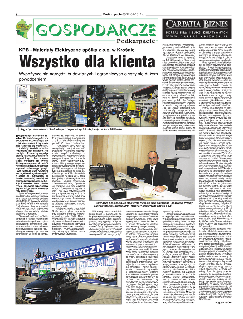 P dk Podkarpacie i 03/ 0 /18 01 2012 r. 03/18-01-2012 8 KPB - Materiały Elektryczne spółka z o.o. w Krośnie Wszystko dla klienta Wypożyczalnia narzędzi budowlanych i ogrodniczych cieszy się dużym powodzeniem Wypożyczalnia narzędzi budowlanych i ogrodniczych funkcjonuje od lipca 2010 roku ą jedną z pięciu spółek-cóS rek Krośnieńskiego Przedsiębiorstwa Budowlanego SA i - jak sama nazwa firmy wskazuje - zajmują się wszystkim, co z elektrycznością szeroko rozumianą jest związane. Ale nie tylko. Prowadzą wypożyczalnię narzędzi budowlanych i ogrodniczych. Potrzebujesz taczki, wkrętarkę czy zwykły 8-kilogramowy młot do robót tylko na kilka godzin, to zamiast kupować możesz wypożyczyć. - Nie każdego stać na zakup szczególnie drogich narzędzi. A ludzie na Podkarpaciu są bardzo pracowici, zaradni, tak zwanych złotych rączek nie brakuje. Krosno i okolice to idealny rynek - zapewnia Przemysław Szymański, prezes KPB -Materiały Elektryczne. Spółka istnieje od końca września 2005 roku, jednak początków firmy należy doszukiwać się już w latach 1992-93, bo wtedy właśnie przy Krośnieńskim Kombinacie Budowlanym utworzony zakład robót elektrycznych na potrzeby własnych budów, wtedy największej firmy w regionie. Główna działalność spółki to sprzedaż i handel materiałami elektrotechnicznymi, osprzętem elektrycznym, oświetleniem ulicznym, wszystkim, co jest związane z elektrycznością szeroko rozumianą począwszy od przewodów schowanych w ziemi po lampy, żarówki itp. akcesoria. W sumie to 7 tysięcy pozycji asortymentu z branży elektrotechnicznej od ponad 150 znanych dostawców. - Od połowy 2010 roku dywersyfikując naszą działalność poszliśmy w kierunku wypożyczalni narzędzi budowlanych i ogrodniczych, niezbędnych przy pielęgnacji ogrodów i otoczenia domu u - mówi Przemysław Szymański. Młody, energiczny prezes spółki pomysł przywiózł z Norwegii. W Polsce wypożyczalnie tego typu już prosperują od kilku lat. Otwarta przez KPB - Materiały Elektryczne w lipcu 2010 roku była jedną z pierwszych w tym regionie. - Jestem zadowolony z rentowności usług. Będziemy się rozwijać. Jest plan otwarcia nowych oddziałów na najbliższe lata a - nie kryje satysfakcji szef firmy - Rynek jest ciężki a duża konkurencja w branży artykułów elektrycznych zmusza nas do ciągłej kreatywności. Tak czy inaczej te działania miały na celu umocnić pozycję spółki. Kolejną ważną dla przyszłości Spółki decyzją było przystąpienie trzy lata temu do grupy hurtowni elektrycznych - ElektroUnion. Większość firm tak robi - zaczyna się zrzeszać, konsolidować, po to, aby mieć większą siłę nabywczą produktów, co wpływa na atrakcyjność cen. - W 2010 roku wykupiliśmy udziały tej spółkii - zaznacza Przemysław Szymański. mysław Szymański - Współpracując z bazą sprzętu KPB w Krośnie SA, możemy zaoferować także ciężki sprzęt - koparki, podnośniki, dźwigi. Spektrum jest szerokie. Urządzenie można wynająć na 4, 8 i 24 godziny. Klient musi mieć dowód osobisty oraz drugi dokument ze zdjęciem np. paszport czy prawo jazdy. Aby zweryfikować dane osobowe i adres klienta, pracownik wypożyczalni może zażądać aktualnego, wystawionego na wynajmującego, rachunku za wodę, gaz lub telefon. Jeżeli prowadzi działalność gospodarczą, to potrzebny jest również wpis do ewidencji. Klient podpisuje umowę dostępną na stronie internetowej i wpłaca kaucję. Nagrzewnica czy osuszacz, żeby odnieść skutek, musi w danym pomieszczeniu pracować np. 3-4 doby. Dlatego można negocjować ceny. - Podane w cenniku ceny nie są sztywne i to jest naszą przewagą nad konkurencją, która powstała za naszym przykładem. Oferujemy sprzęt renomowanych firm, a nasze ceny są najniższe na rynku - zapewnia prezes - Istnieje także możliwość dostarczenia narzędzi naszym transportem pod wskazany przez klienta adres. Można to także załatwić telefonicznie, nie - Wychodzę z założenia, że moja firma musi się stale wyróżniać - podkreśla Przemysław Szymański, prezes KPB - Materiały Elektryczne spółka z o.o. W katalogu wypożyczalni figuruje blisko 80 pozycji. Jak do tej pory wynajmują sam sprzęt. Prezesowi chodzi jednak po głowie pomysł, żeby wypożyczać sprzęt z obsługującym go pracownikiem. - Jeżeli mamy piłę spalinową do obcinania gałęzi, to potrzebna jest zwyżka i odważny człowiek, aby na zwyżkę wejść i drzewo przyciąć. Jest na to zapotrzebowanie. Niewykluczone, że wprowadzimy również taką usługę ę - zastanawia się Przemysław Szymański. W tej chwili wypożyczalnia przy ul. Pużaka 14b w Krośnie oferuje swoim klientom szeroki asortyment począwszy od samochodu przez betoniarkę, różnego rodzaju szlifierki, przecinarki do betonu, zagęszczarki, ubijarki, młoty - udarowe, wyburzeniowe, młotowiertarki, wiertarki, wkrętarki, wiertła o różnych średnicach, piły tarczowe ręczne, bruzdownice po rusztowania (także warszawskie) i podpory stropowe, myjki ciśnieniowe do mycia np. elewacji, agregaty prądotwórcze, spalinowe pompy do wody, osuszacze powietrza, zsypy do gruzu, nagrzewnice i odkurzacze przemysłowe. Wynajmują - co może wydawać się śmieszne - nawet taczki i łopaty do betoniarki czy zwykłe 8 - kilogramowe młoty. - Chcemy kompleksowo zaspokajać potrzeby naszych klientów tak by do drobnych prac budowlanych czy ogrodowych nie musieli kupować drogiego i niezbędnego do tego typu prac sprzętu. Posiadamy w ofercie naszej wypożyczalni osuszacze, nagrzewnice, odkurzacze przemysłowe, wiertnice glebowe elektryczne jak i ręczne, nawet wielki młot 8 - kilogramowy, węże do przetykania rur - tłumaczy Prze- wychodząc z domu. Stosują taką samą zasadę jak w wypożyczalni samochodów. W przypadku sprzętu z silnikiem spalinowym dają paliwo. – Wynajmujemy urządzenia z pełnym bakiem paliwa, a ewentualne jego zużycie dodat