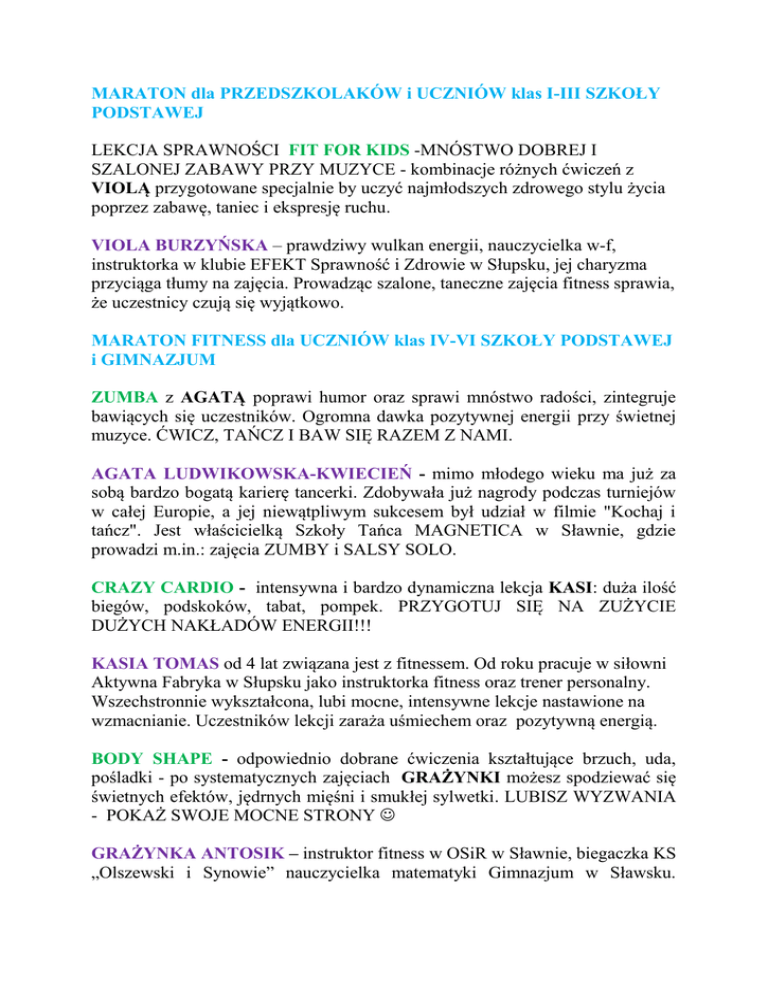 MARATON dla PRZEDSZKOLAKÓW i UCZNIÓW klas I-III SZKOŁY PODSTAWEJ LEKCJA SPRAWNOŚCI FIT FOR KIDS -MNÓSTWO DOBREJ I SZALONEJ ZABAWY PRZY MUZYCE - kombinacje różnych ćwiczeń z VIOLĄ przygotowane specjalnie by uczyć najmłodszych zdrowego stylu życia poprzez zabawę, taniec i ekspresję ruchu. VIOLA BURZYŃSKA – prawdziwy wulkan energii, nauczycielka w-f, instruktorka w klubie EFEKT Sprawność i Zdrowie w Słupsku, jej charyzma przyciąga tłumy na zajęcia. Prowadząc szalone, taneczne zajęcia fitness sprawia, że uczestnicy czują się wyjątkowo. MARATON FITNESS dla UCZNIÓW klas IV-VI SZKOŁY PODSTAWEJ i GIMNAZJUM ZUMBA z AGATĄ poprawi humor oraz sprawi mnóstwo radości, zintegruje bawiących się uczestników. Ogromna dawka pozytywnej energii przy świetnej muzyce. ĆWICZ, TAŃCZ I BAW SIĘ RAZEM Z NAMI. AGATA LUDWIKOWSKA-KWIECIEŃ - mimo młodego wieku ma już za sobą bardzo bogatą karierę tancerki. Zdobywała już nagrody podczas turniejów w całej Europie, a jej niewątpliwym sukcesem był udział w filmie "Kochaj i tańcz". Jest właścicielką Szkoły Tańca MAGNETICA w Sławnie, gdzie prowadzi m.in.: zajęcia ZUMBY i SALSY SOLO. CRAZY CARDIO - intensywna i bardzo dynamiczna lekcja KASI: duża ilość biegów, podskoków, tabat, pompek. PRZYGOTUJ SIĘ NA ZUŻYCIE DUŻYCH NAKŁADÓW ENERGII!!! KASIA TOMAS od 4 lat związana jest z fitnessem. Od roku pracuje w siłowni Aktywna Fabryka w Słupsku jako instruktorka fitness oraz trener personalny. Wszechstronnie wykształcona, lubi mocne, intensywne lekcje nastawione na wzmacnianie. Uczestników lekcji zaraża uśmiechem oraz pozytywną energią. BODY SHAPE - odpowiednio dobrane ćwiczenia kształtujące brzuch, uda, pośladki - po systematycznych zajęciach GRAŻYNKI możesz spodziewać się świetnych efektów, jędrnych mięśni i smukłej sylwetki. LUBISZ WYZWANIA - POKAŻ SWOJE MOCNE STRONY GRAŻYNKA ANTOSIK – instruktor fitness w OSiR w Sławnie, biegaczka KS „Olszewski i Synowie” nauczycielka matematyki Gimnazjum w Sławsku. Podczas swoich zajęć porządnie daje w kość, mimo to wszyscy choć mocno zmęczeni wychodzą radości i uśmiechnięci. MARATON FITNESS DLA DOROSŁYCH I UCZNIÓW SZKÓŁ ŚREDNICH Dance4Fun –taniec dla wszystkich!!! Ciekawa lekcja z MARTĄ łącząca taniec i fitness. Klasyczne elementy aerobiku połączone z energicznym tańcem i dobrą muzyka dadzą niesamowite połączenie. SPALANIE KALORII I DOBRA ZABAWA W CZASIE ZAJĘĆ - GWARANTOWANE!!! MARTA STĘPIEŃ - instruktorka i właścicielka Klub Fitness FunFit działającego na terenie miasta Sławno. Wykwalifikowana instruktorka aerobiku i tańca sportowego. W każdą lekcję wkłada całe serce, zaangażowanie i maksimum profesjonalizmu, a wszystko po to, by ćwiczącym dać radość i zadowolenie. Na sali czuje, że żyje i robi to, co kocha. AFRO – w czasie tej lekcji podstawowe kroki fitness niepostrzeżenie zmieniają się w taneczny szał prosto z Afryki. Klasyczne afro z NATALIĄ zabierze cie w szaloną podróż w głąb Twego serca. Daj się porwać hipnotyzującym afrykańskim rytmom i pozwól swemu ciału płynąć! POKAŻ SWOJE DZIKIE OBLICZE I BAW SIĘ W RYTM AFRYKAŃSKICH BĘBNÓW. NATALIA STACHOWICZ - nauczyciel wychowania fizycznego w ZSA w Sławnie i instruktor fitness od 5 lat. Uwielbia dynamiczny taniec wyzwalający ukryte pokłady energii. Fitness jest jej pasją, którą chce zarażać innych. ZUMBA - ćwicz, tańcz i baw się razem z AGATĄ to wybuchowa mieszanka elementów zaczerpniętych z tańców latynoamerykańskich. Wszystko skonstruowane w atrakcyjną, dostępną dla każdego choreografię, którą zechcesz powtarzać bez końca... Dzięki tym zajęciom poprawisz świadomość swojego ciała a DUŻA DAWKA ENDORFIN POPRAWI CI NASTRÓJ NA DŁUGIE GODZINY. AGATA LUDWIKOWSKA-KWIECIEŃ - mimo młodego wieku ma już za sobą bardzo bogatą karierę tancerki. Zdobywała już nagrody podczas turniejów w całej Europie, a jej niewątpliwym sukcesem był udział w filmie "Kochaj i tańcz". Jest właścicielką Szkoły Tańca MAGNETICA w Sławnie, gdzie prowadzi m.in.: zajęcia ZUMBY i SALSY SOLO AEROBOX - INTENSYWNY TRENING INSPIROWANY SZTUKAMI WALKI KICKBOXINGU I BOKSU. Te szaleństwa z EWELINĄ poprawią Twoją koordynację ruchową, wydolność organizmu czy kondycję fizyczną. Techniki stosowane podczas zajęć pomogą ukształtować i wzmocnić mięśnie oraz spalać tkankę tłuszczową. EWELINA CHOŁODY- instruktor rekreacji ruchowej ze specjalnością fitness- nowoczesne formy gimnastyki. Ze sportem związana przez całe życie, z fitnessem od 5 lat. Jej największą pasją są zajęcia choreograficzne, wzmacniające, a także formy body&mind. Duży nacisk kładzie na kondycje i wytrzymałość ludzkiego ciała. Nieustannie pogłębia swoją wiedzę na licznych szkoleniach, warsztatach i konwencjach. W swojej pracy ceni kontakt z ludźmi, a ich zadowolenie jest jej największa satysfakcją. BODY SCULPT - kompleksowy zestaw ćwiczeń MARTY modelujący i rzeźbiący sylwetkę. Niezbyt szybkie tempo sprzyjać będzie koncentracji na technice, bezpieczeństwie i dokładności wykonywanych ćwiczeń, więc … ODKRYJ W SOBIE SIŁĘ, WYKORZYSTAJ SWOJĄ MOC, by … na zakończenie móc się wyciszyć, rozciągnąć i zrelaksować. MARTA WACHHOLZ – niezwykle utalentowana młoda instruktorka aerobiku i jednocześnie trener osobisty. Prowadzi zajęcia w firmie MarActiv i szkole tańca Magnetica. W swoje zajęcia wkłada całe serce, czego efektem jest radość i ogromne zadowolenie uczestniczek.