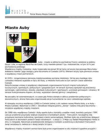 Portal Miasta Miasta Czeladź http://www.czeladz.pl/miasto/miasto_auby/printpdf Miasto Auby Auby - miasto w północno-wschodniej Francji, położone w pobliżu Douai i Lille, w regionie Nord-Pas-de-Calais. Liczy niewiele ponad 7 tys. mieszkańców, w tym 10 % jest pochodzenia polskiego. Współpraca między Czeladzią i Auby rozpoczęła się ponad 30 lat temu od wizyty ówczesnego Mera AubyAldeberta Valette i jego zastępcy Jana Kaczmarka w Czeladzi (1973). Efektem wizyty była pierwsza umowa o współpracy miast partnerskich. W 1976 r. zorganizowano pierwszą międzynarodową wymianę młodzieży. Od tej pory każdego roku czeladzka młodzież wyjeżdża w lipcu do Auby, a młodzież francuska w tym samym czasie odwiedza Czeladź. Dotychczasowe umowy o współpracy obejmowały organizowanie licznych imprez kulturalnych, turystycznych, sportowych, politycznych i gospodarczych. W ramach wymiany spotykali się pracownicy samorządu i administracji, oświaty, placówek kulturalnych i sportowych, uczniowie gimnazjum i strażacy. W okresie funkcjonowania kopalni, do Auby, wyjeżdżali również górnicy i związkowcy. Na początku lat osiemdziesiątych, w czasie gdy Polska stanęła w obliczu problemów politycznych i ekonomicznych, strona francuska organizowała akcje humanitarne na rzecz czeladzkiego szpitala. W dziesiątą rocznicę współpracy (1983) w Czeladzi jednej z ulic nadano nazwę Miasta Auby, a w Auby – Miasta Czeladzi. Natomiast w 2001 r. Ośrodkowi Integracyjnemu „Senior” nadano imię Jana Kaczmarka – inicjatora współpracy między miastami. Do 1990 roku współpraca Czeladzi i Auby oparta była o kontakty urzędów miast, komitety partyjne i TPPF. Lata po przełomie przyniosły większe ożywienie w kontaktach polsko – francuskich. Szczególną rolę przypisano wymianie kulturalnej, sportowej a także samorządowej. Możliwe stało się uczestnictwo delegacji francuskich w obchodach polskich świąt narodowych – z okazji 1 i 3 Maja czy Święta Niepodległości Polski w dniu 11 listopada. Natomiast przedstawiciele delegacji z Czeladzi uczestniczą w obchodach francuskich świąt narodowych, zwłaszcza z okazji święta 14 Lipca. Współpraca między miastami wzmacniana była przez organizowane w obu miastach tygodnie przyjaźni i kultury oraz działalność Towarzystw Przyjaźni Polsko – Francuskiej. Czeladzkie Koło Towarzystwa zarejestrowano w grudniu 1976 roku. W swoich planach działania członkowie Towarzystwa wpisali współpracę z Towarzystwem Francusko – Polskim w Auby, wymianę młodzieży szkolnej i sportowców, promocję i upowszechnianie kultury polskiej, a także prasy i wydawnictw polskich we Francji i francuskich w Polsce, wystawy fotograficzne dokumentujące pobyty delegacji polskich we Francji. Komitet Lokalny Towarzystwa Nord Pas de Calais – Polska powstał w 1976 roku. Zasadniczym celem Komitetu jest rozwijanie przyjaźni francusko – polskiej, integracja wspólnoty polskiej ze społeczeństwem francuskim, propagowanie polskiej kultury i sztuki, organizacja spotkań okolicznościowych, festynów, obchodów świąt narodowych oraz współpraca z czeladzkim Towarzystwem Przyjaźni Polsko – Francuskiej. Od wielu lat Prezesem Komitetu Lokalnego Towarzystwa Nord-Pas-de-Calais – Polska jest Pani Halina Normand, która w 1999 roku (po 25 latach działalności w stowarzyszeniu) została uhonorowana przez prezydenta RP Krzyżem Oficerskim za Zasługi dla Rzeczypospolitej Polskiej. Sześciu Francuzów otrzymało tytuł „Honorowego Obywatela Miasta Czeladź” za działalność na rzecz rozwijania partnerstwa między miastami. Należeli do nich: Jean Kaczmarek, Aldebert Valette, Pierre Cucheval, Michel Flacheron, Daniel Normand i Bernard Briez. Główne formy współpracy partnerskiej to wymiana samorządowa, sportowa, kulturalna, wymiana młodzieży gimnazjalnej oraz delegacji strażaków z OSP w Czeladzi i Auby. Mer Miasta Auby - Freddy Kaczmarek Dane kontaktowe urzędu miasta: Hotel de Ville 25 rue Leon Blum 59950 Auby http://www.auby.fr/