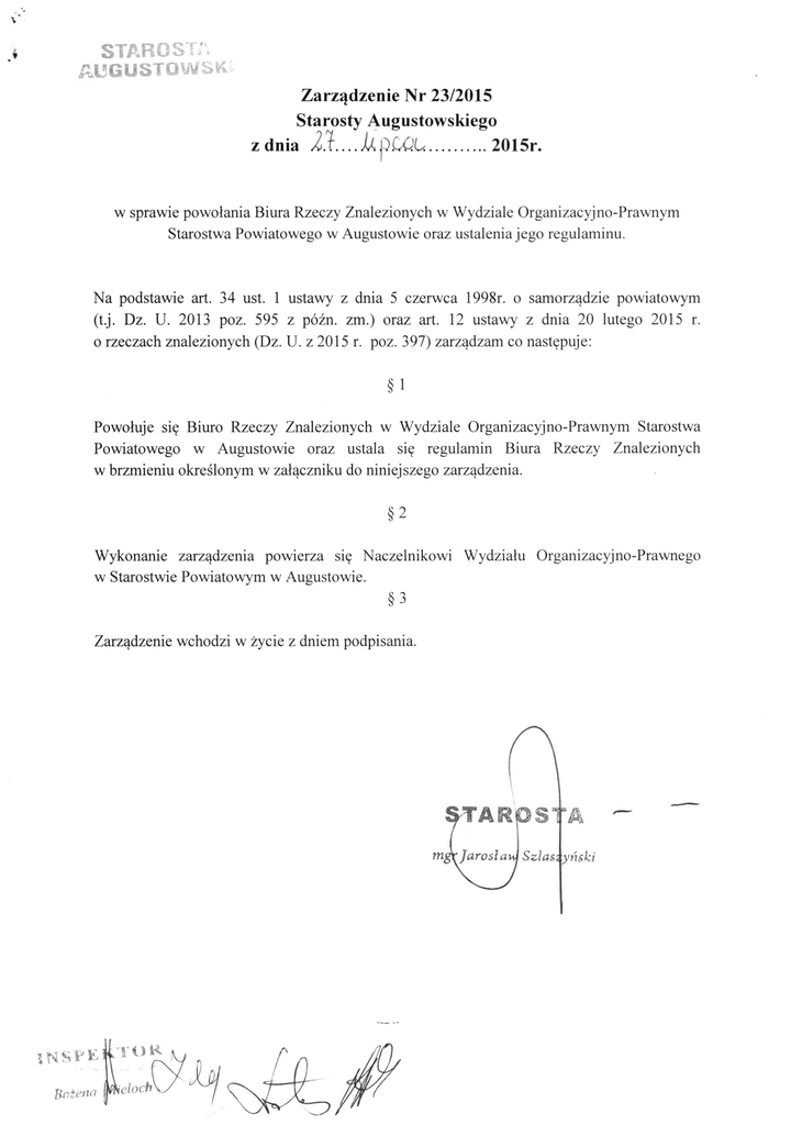 Zarządzenie Nr 23/2015 Starosty Augustowskiego z dnia 27 lipca