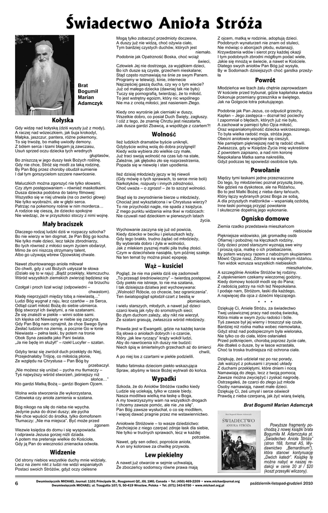 Świadectwo Anioła Stróża Brat Bogumił Marian Adamczyk Kołyska Gdy widzę nad kołyską (dziś wyszły już z mody), A raczej nad wózeczkiem, jak buja krokodyl, Małpka, jaszczur, pantera, różne pokemony, To się trwożę, bo matkę uwiodły demony. Z bólem serca i łzami błagam ją zawczasu, Usuń sprzed oczu dziecka tych wrednych głuptasów, Bo zniszczą w jego duszy łask Bożych roślinę. Gdy nie chce, Stróż się modli za taką rodzinę, By Pan Bóg przez choroby obudził sumienie I dał tym gorszycielom szczere nawrócenie. Maluczkich można zgorszyć nie tylko słowami, Czy złym postępowaniem – również maskotkami. Dusza dziecka podobna do taśmy filmowej: Wszystko się w niej utrwala (na co zwróci głowę) Nie tylko wyobraźni, ale w głębi serca. Patrząc na pokemony rośnie w nim morderca… A rodzice się cieszą, że dziecko spokojne Nie wiedząc, że w przyszłości stoczy z nimi wojnę. Mały braciszek Dlaczego rodzaj ludzki dziś w rozpaczy szlocha? Bo nie wierzy w ten dogmat, że Pan Bóg go kocha. Nie tylko małe dzieci, lecz także zbrodniarzy, Bo tych również z miłości swym życiem obdarzył, Mimo że oni niszczą otrzymany talent, Albo go używają wbrew Ojcowskiej chwale. Nawet zbuntowanego anioła miłował Do chwili, gdy z ust Bożych usłyszał te słowa (Działo się to w raju): „Bądź przeklęty, kłamczuchu. Wśród wszystkich ziemskich zwierząt będziesz się na brzuchu Czołgał i proch lizał wciąż (odpowiedni – chwastom). Kładę nieprzyjaźń między tobą a niewiastą…” Ludzi Bóg wygnał z raju, lecz czartów – ze Serca, Odtąd czart miłość Bożą do siebie uśmierca. Bóg stworzył ich świętymi, a nie szatanami. Że się znaleźli w piekle – winni sobie sami. Ich klęska od Niewiasty w niebie się zaczyna. Gdy Pan Bóg nam oznajmił, że chce Swego Syna Zesłać ludziom na ziemię, a pocznie Go w łonie Niewiasta – pełna łaski, by potem na tronie Obok Syna zasiadła jako Pani świata. „Ja nie będę im służył!” – rzekł Lucyfer – szatan. Gdyby teraz się zwrócił duch przeklęty do Niej, Przejednałaby Trójcę, co miłością płonie, Ze względu na Chrystusa – Pan Bóg by przebaczył. „Nie możesz się uniżać – pycha mu tłumaczy – Tyś najwyższy wśród stworzeń, jaśniejszy niż słońce…” Kto gardzi Matką Bożą – gardzi Bogiem Ojcem. Wolna wola stworzenia źle wykorzystana, Człowieka czy anioła zamienia w szatana. Bóg nikogo na siłę do nieba nie wpycha. Jedynie puka do drzwi duszy; ale pycha Nie chce wpuścić do środka, tylko domofonem Tłumaczy: „Nie ma miejsca”. Być może przed zgonem Wezwie księdza do domu i się wyspowiada. I odprawia Jezusa gorzej niźli dziada. A potem ma pretensje wielkie do Kościoła, Gdy ją Pan do wieczności znienacka odwoła. Widzenie Od strony niebios wszystkie duchy mnie widziały, Lecz na ziemi nikt z ludzi nie widzi wspaniałych Postaci swoich Stróżów, gdyż oczy cielesne Mogą tylko zobaczyć przedmioty doczesne, A duszy już nie widzą, choć ożywia ciało, Tym bardziej czystych duchów, których jest niemało. Podobnie jak Opatrzność Boska, choć wciąż świeci, Człowiek Jej nie dostrzega, za wyjątkiem dzieci, Bo ich dusze są czyste, grzechem nieskalane; Stąd często rozmawiają na śnie ze swym Panem. Programy w telewizji, kinie, internecie Najczęściej gaszą ducha, czy wy o tym wiecie? Już od małego dziecka (dawniej tak nie było) Tuczy się pornografią, twierdząc, że to miłość. To jest wstrętny egoizm, który nic wspólnego Nie ma z cnotą miłości, jest nasieniem Złego. Z ojcem, matką w rodzinie, adoptują dzieci. Podobnych wynaturzeń nie znam od stuleci, Nie mówiąc o aborcjach płodu, eutanazji, Krzywdzenia wdów i sierot przy każdej okazji I tym podobnych zbrodni mógłbym podać wiele, Jakie się mnożą w świecie, a nawet w Kościele. Dlatego swych aniołów Pan Bóg już wysyła, By w Sodomach dzisiejszych choć garstka przeżyła Kiedy ono wyrośnie jak cierniaki w duszy, Wszelkie dobro, co posiał Duch Święty, zagłuszy. I cóż z tego, że znamię Chrztu jest niezatarte, Jak dusza gardzi Zbawcą, a współżyje z czartem?! Podobnie jak Pan Jezus, co odpuścił grzechy, Kapłan – Jego zastępca – doznał też pociechy I zapomniał o błędach, których już nie było, A zachował w pamięci tylko Ojca miłość, Oraz wspaniałomyślność dziecka wskrzeszonego. To była wielka radość moja, stróża jego. Obecni aniołowie wspólnie się cieszyli, Nie pamiętam piękniejszej nad tę radość chwili. Zwłaszcza, gdy w Księdze Życia imię wykreślone Z powrotem zapisano, a nad nim koronę Niepokalana Matka sama nakreśliła, Gdyż podczas tej spowiedzi osobiście była. Wolność Ileż ludzkich dramatów byście uniknęli, Gdybyście wolną wolą do dobra przylgnęli! Kiedy wola wybiera zło wielkie czy małe, Już traci swoją wolność na czas lub na stałe, Zależnie, jak głęboko zło się rozprzestrzenia, Popada się w niewolę i stan upodlenia. Ileż dzisiaj młodzieży jęczy w tej niewoli (Gdy mówię o tych sprawach, to serce mnie boli) Narkotyków, rozpusty i innych zdrożności, Choć uważa – o zgrozo! – że to szczyt wolności. Skąd się to zwyrodnienie bierze u młodzieży, Chociaż jest wykształcona i w Chrystusa wierzy? To nie przychodzi nagle, nie spada z księżyca. Z mego punktu widzenia wina tkwi w rodzicach: Nie czuwali nad dzieckiem w pierwszych latach życia. Wychowanie zaczyna się już od powicia, Kiedy dziecko w beciku i pieluszkach leży. Gdy tego brakło, trudno żądać od młodzieży, By wybierała dobro i żyła w wolności, Jak z mlekiem pysznej matki piła trutkę złości. Czym w dzieciństwie nasiąkła, tym później szaleje. Na ten temat by można pisać epopeję. Wąż – kusiciel Pogląd, że nie ma piekła dziś się zadomowił: „To przesąd średniowieczny” – twierdzą postępowi. Gdy piekło nie istnieje, to nie ma sz