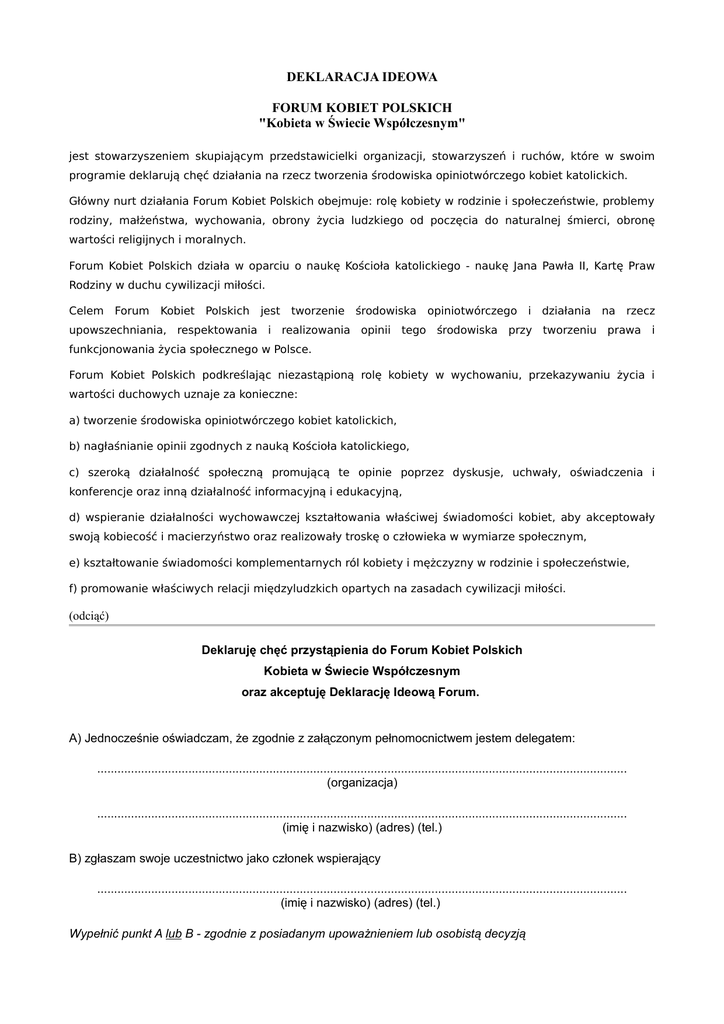 DEKLARACJA IDEOWA FORUM KOBIET POLSKICH "Kobieta w Świecie Współczesnym" jest stowarzyszeniem skupiającym przedstawicielki organizacji, stowarzyszeń i ruchów, które w swoim programie deklarują chęć działania na rzecz tworzenia środowiska opiniotwórczego kobiet katolickich. Główny nurt działania Forum Kobiet Polskich obejmuje: rolę kobiety w rodzinie i społeczeństwie, problemy rodziny, małżeństwa, wychowania, obrony życia ludzkiego od poczęcia do naturalnej śmierci, obronę wartości religijnych i moralnych. Forum Kobiet Polskich działa w oparciu o naukę Kościoła katolickiego - naukę Jana Pawła II, Kartę Praw Rodziny w duchu cywilizacji miłości. Celem Forum Kobiet Polskich jest tworzenie środowiska opiniotwórczego i działania na rzecz upowszechniania, respektowania i realizowania opinii tego środowiska przy tworzeniu prawa i funkcjonowania życia społecznego w Polsce. Forum Kobiet Polskich podkreślając niezastąpioną rolę kobiety w wychowaniu, przekazywaniu życia i wartości duchowych uznaje za konieczne: a) tworzenie środowiska opiniotwórczego kobiet katolickich, b) nagłaśnianie opinii zgodnych z nauką Kościoła katolickiego, c) szeroką działalność społeczną promującą te opinie poprzez dyskusje, uchwały, oświadczenia i konferencje oraz inną działalność informacyjną i edukacyjną, d) wspieranie działalności wychowawczej kształtowania właściwej świadomości kobiet, aby akceptowały swoją kobiecość i macierzyństwo oraz realizowały troskę o człowieka w wymiarze społecznym, e) kształtowanie świadomości komplementarnych ról kobiety i mężczyzny w rodzinie i społeczeństwie, f) promowanie właściwych relacji międzyludzkich opartych na zasadach cywilizacji miłości. (odciąć) Deklaruję chęć przystąpienia do Forum Kobiet Polskich Kobieta w Świecie Współczesnym oraz akceptuję Deklarację Ideową Forum. A) Jednocześnie oświadczam, że zgodnie z załączonym pełnomocnictwem jestem delegatem: ............................................................................................................................................................. (organizacja) ............................................................................................................................................................. (imię i nazwisko) (adres) (tel.) B) zgłaszam swoje uczestnictwo jako członek wspierający ............................................................................................................................................................. (imię i nazwisko) (adres) (tel.) Wypełnić punkt A lub B - zgodnie z posiadanym upoważnieniem lub osobistą decyzją