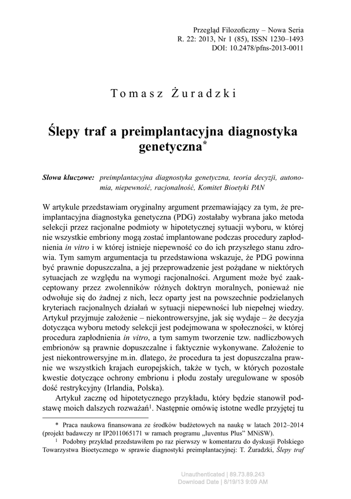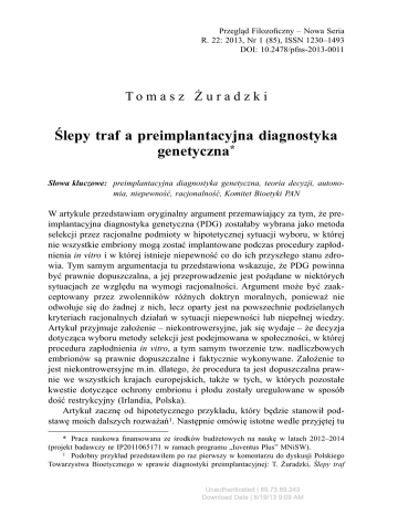Przegląd Filozoficzny – Nowa Seria R. 22: 2013, Nr 1 (85), ISSN 1230–1493 DOI: 10.2478/pfns-2013-0011 To m a s z Ż u r a d z k i Ślepy traf a preimplantacyjna diagnostyka genetyczna* Słowa kluczowe: preimplantacyjna diagnostyka genetyczna, teoria decyzji, autonomia, niepewność, racjonalność, Komitet Bioetyki PAN W artykule przedstawiam oryginalny argument przemawiający za tym, że preimplantacyjna diagnostyka genetyczna (PDG) zostałaby wybrana jako metoda selekcji przez racjonalne podmioty w hipotetycznej sytuacji wyboru, w której nie wszystkie embriony mogą zostać implantowane podczas procedury zapłodnienia in vitro i w której istnieje niepewność co do ich przyszłego stanu zdrowia. Tym samym argumentacja tu przedstawiona wskazuje, że PDG powinna być prawnie dopuszczalna, a jej przeprowadzenie jest pożądane w niektórych sytuacjach ze względu na wymogi racjonalności. Argument może być zaakceptowany przez zwolenników różnych doktryn moralnych, ponieważ nie odwołuje się do żadnej z nich, lecz oparty jest na powszechnie podzielanych kryteriach racjonalnych działań w sytuacji niepewności lub niepełnej wiedzy. Artykuł przyjmuje założenie – niekontrowersyjne, jak się wydaje – że decyzja dotycząca wyboru metody selekcji jest podejmowana w społeczności, w której procedura zapłodnienia in vitro, a tym samym tworzenie tzw. nadliczbowych embrionów są prawnie dopuszczalne i faktycznie wykonywane. Założenie to jest niekontrowersyjne m.in. dlatego, że procedura ta jest dopuszczalna prawnie we wszystkich krajach europejskich, także w tych, w których pozostałe kwestie dotyczące ochrony embrionu i płodu zostały uregulowane w sposób dość restrykcyjny (Irlandia, Polska). Artykuł zacznę od hipotetycznego przykładu, który będzie stanowił podstawę moich dalszych rozważań1. Następnie omówię istotne wedle przyjętej tu * Praca naukowa finansowana ze środków budżetowych na naukę w latach 2012–2014 (projekt badawczy nr IP2011065171 w ramach programu „Iuventus Plus” MNiSW). 1 Podobny przykład przedstawiłem po raz pierwszy w komentarzu do dyskusji Polskiego Towarzystwa Bioetycznego w sprawie diagnostyki preimplantacyjnej: T. Żuradzki, Ślepy traf Unauthenticated | 89.73.89.243 Download Date | 8/19/13 9:09 AM 32 Tomasz Żuradzki perspektywy fragmenty Stanowiska Komitetu Bioetyki przy Prezydium PAN nr 2/2012 z dnia 8 czerwca 2012 r. w sprawie preimplantacyjnej diagnostyki genetycznej2 oraz zdań odrębnych zgłoszonych do tego dokumentu. Uzasadnię moją interpretację podanego poniżej przykładu oraz przywołam kilka wiążących się z nim kwestii filozoficznych, a także problemów odnoszących się do decyzji podejmowanych przez złożone z naukowców ciała doradcze na temat regulacji prawnych dotyczących osiągnięć naukowo-technicznych w sytuacji pluralizmu światopoglądów. Przykład Wyobraźmy sobie, że Anna i Jan, rodzeństwo w średnim wieku, bez wątpienia mające pełny status moralny wedle każdej doktryny normatywnej, znalazło się w niefortunnej sytuacji, która nie została przez nie sprowokowana. Zostali porwani przez grupę terrorystów, która wkrótce zamierza zabić jedno z nich. Terroryści nie żartują: ich grupa znana jest z regularnego porywania par turystów, zabijania jednego z nich i uwalniania drugiego. Przeprowadzili wiele takich akcji, o których głośno było na całym świecie. Co więcej, grupa jest tak perfidna, że decyzję o tym, kto ma zginąć, pozostawia samym porwanym: to Anna i Jan mają podjąć decyzję, które z nich zginie, a które zostanie przy życiu. Jeśli sami jej nie podejmą, terroryści zdecydują na podstawie losowania. Jedno z porwanych jest nosicielem łatwo wykrywalnej, ale nieuleczalnej choroby jednogenowej i z całą pewnością umrze w ciągu roku. Drugie nie jest na nic chore i można rozsądnie oczekiwać, że przeżyje kolejnych 40 lat. Problem w tym, że nikt nie wie, które z nich jest zdrowe, a które chore. Tak się jednak szczęśliwie składa, że porwani mają możliwość wykonania testu, którego wynik jednoznacznie wskaże chorobę. Czy w takiej sytuacji Anna i Jan, podejmując decyzję o tym, kto przeżyje, a kto nie, powinni zdać się na ślepy traf i pozwolić wybrać terrorystom? Czy też powinni się umówić, że zginie ten, kto po wykonaniu testu okaże się chory? Uważam, że w tak przedstawionej sytuacji wyboru każdy racjonalny podmiot powinien wybrać przeprowadzenie testu przesądzającego jednocześnie o tym, że przeżyje osoba zdrowa. nie jest bardziej moralny niż selekcja oparta na powszechnie podzielanych kryteriach, Kraków 2012, http://www.ptb.org.pl/pdf/zuradzki_klauzula_1.pdf [07.12.2012]. 2 Komitet Bioetyki przy Prezydium PAN, Stanowisko nr 2/2012 z dnia 8 czerwca 2012 r. w sprawie preimplantacyjnej diagnostyki genetycznej, Warszawa 2012, stanowisko i zdania odrębne dostępne na stronie: http://www.bioetyka.pan.pl/index.php?option=com_content&view=article&id=100:stanowisko-komitetu-bioetyki-przy-prezydium-pan-nr-22012-z-dnia6-czerwca-2012-r-w-sprawie-preimplantacyjnej-diagnostyki-genetycznej&catid=45:stanowiskakomitetu&Itemid=50 [07.12.2012]. Unauthenticated | 89.73.89.243 Download Date | 8/19/13 9:09 AM Ślepy traf a preimplantacyjna diagnostyka genetyczna 33 Z jednej strony, na przeprowadzeniu testu żadna z obu osób nic nie traci: bez względu na to, czy rzuca się monetą, czy przeprowadza test, prawdopodobieństwo przeżycia jest identyczne i wynosi 0,5. Z drugiej strony, jeśli założymy, że każdy racjonalny podmiot chce żyć jak najdłużej (w ramach obecnej ludzkiej skali), a w sytuacji niepewności stosuje standardowo rozumianą teorię decyzji, to powinien preferować przeprowadzenie testu. Zobaczmy, dlaczego. Załóżmy, że każdy rok życia to jednostka jakiejś miary. W przypadku wyboru na podstawie ślepego trafu oczekiwana wartość wyrażona w latach życia to 10,25 [0,5 × (1+40)/2]; w przypadk