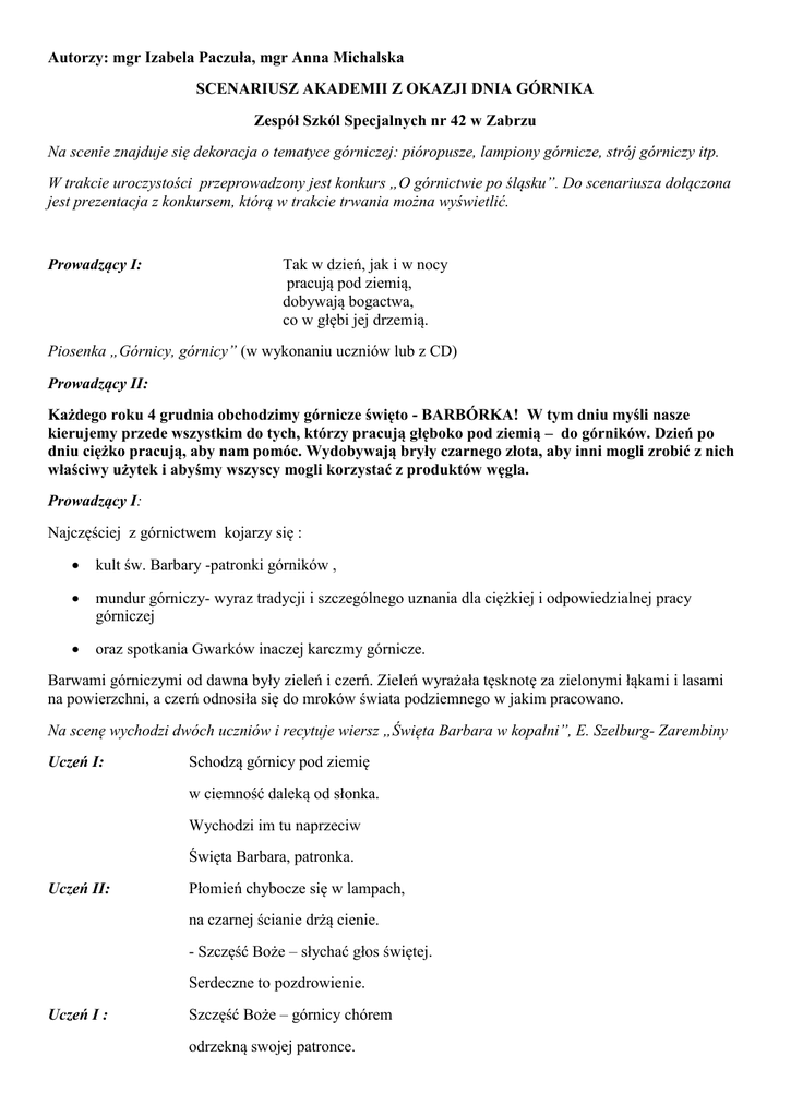 Autorzy: mgr Izabela Paczuła, mgr Anna Michalska SCENARIUSZ AKADEMII Z OKAZJI DNIA GÓRNIKA Zespół Szkól Specjalnych nr 42 w Zabrzu Na scenie znajduje się dekoracja o tematyce górniczej: pióropusze, lampiony górnicze, strój górniczy itp. W trakcie uroczystości przeprowadzony jest konkurs „O górnictwie po śląsku”. Do scenariusza dołączona jest prezentacja z konkursem, którą w trakcie trwania można wyświetlić. Prowadzący I: Tak w dzień, jak i w nocy pracują pod ziemią, dobywają bogactwa, co w głębi jej drzemią. Piosenka „Górnicy, górnicy” (w wykonaniu uczniów lub z CD) Prowadzący II: Każdego roku 4 grudnia obchodzimy górnicze święto - BARBÓRKA! W tym dniu myśli nasze kierujemy przede wszystkim do tych, którzy pracują głęboko pod ziemią – do górników. Dzień po dniu ciężko pracują, aby nam pomóc. Wydobywają bryły czarnego złota, aby inni mogli zrobić z nich właściwy użytek i abyśmy wszyscy mogli korzystać z produktów węgla. Prowadzący I: Najczęściej z górnictwem kojarzy się : kult św. Barbary -patronki górników , mundur górniczy- wyraz tradycji i szczególnego uznania dla ciężkiej i odpowiedzialnej pracy górniczej oraz spotkania Gwarków inaczej karczmy górnicze. Barwami górniczymi od dawna były zieleń i czerń. Zieleń wyrażała tęsknotę za zielonymi łąkami i lasami na powierzchni, a czerń odnosiła się do mroków świata podziemnego w jakim pracowano. Na scenę wychodzi dwóch uczniów i recytuje wiersz „Święta Barbara w kopalni”, E. Szelburg- Zarembiny Uczeń I: Schodzą górnicy pod ziemię w ciemność daleką od słonka. Wychodzi im tu naprzeciw Święta Barbara, patronka. Uczeń II: Płomień chybocze się w lampach, na czarnej ścianie drżą cienie. - Szczęść Boże – słychać głos świętej. Serdeczne to pozdrowienie. Uczeń I : Szczęść Boże – górnicy chórem odrzekną swojej patronce. I jasno w czarnej kopalni, jak gdyby wzeszło tu słońce. Prowadzący II: O tym, jakie produkty otrzymujemy z węgla, uczycie się na lekcjach, robicie doświadczenia i z pewnością słyszeliście wiele razy. Prowadzący I: Dziś sprawdzimy jakie macie wiadomości na temat górników i tego, co się z nimi wiąże w gwarze śląskiej. Zapraszamy do udziału w konkursie dwie drużyny składające się z dwóch uczniów i nauczyciela. [Z widowni wyłaniane są drużyny w w/w składzie, następnie prowadzący przeprowadzają z członkami krótki wywiad: skąd pochodzą?, gdzie się urodzili?] Prowadzący I: [przedstawia skład drużyn, kapitanów oraz ich członków, oraz zaprasza do prac wcześniej umówionych członków jury] Zatem Kapitanem pierwszej drużyny jest…. A drugiej drużyny …………………………………….. Do jury poprosimy …………. ………………….. [Prowadzący rozpoczynają konkurs wiedzy „O górnictwie po śląsku”, zadają na przemian pytania i możliwe odpowiedzi do wyboru, w tle widownia ogląda prezentację z zadawanymi pytaniami i odpowiedziami. Po każdym pytaniu jury przyznaje punkty 0 lub 1. Na koniec jeden z prowadzących podlicza ilość punktów i przyznaje miejsca. Jury wręcza drobne upominki wygranym.] Prowadzący I: Zatem zaczynamy konkurs wiedzy „O górnictwie po śląsku” Pytanie numer 1: 1.Gruba to: A. GÓRNIK B. KOPALNIA C. KANAPKA GÓRNIKA DO PRACY D. WINDA W KOPALNI [odp.B] Prowadzący II: Pytanie drugie: 2. Jak nazywano dawniej górnika? A. Górnik B. Gwarek C. Gondolier D. Grabarz [odp. A] Prowadzący I: Pytanie trzecie: 3. Jak nazywa się górnik, który jest na kierowniczym stanowisku i zajmuje się dozorem technicznym w kopalni? A. Skarbek B. Sztygar C. Boss D. Pryncypał [odp. B] Prowadzący II: Pytanie czwarte: 4. Jak nazywa się zmiana w pracy górnika? A. Szychta B. Zmiana C. Czas pracy D. Młocka [odp. B] Prowadzący I: Pytanie piąte: 5.Co robi górnik w kopalni-odpowiedz w gwarze. A. FEDRUJE B. KNEBLUJE C. SZUKA D. SERFUJE [odp. A] Prowadzący II: 6. Jak nazywa się poziomy korytarz w kopalni? A. DYWAN B. ŚCIEŻKA C. ULICA D. CHODNIK [odp. D] Prowadzący I: Pytanie siódme: 7. W jaki sposób górnik dostaje się na swoje miejsce pracy w kopalni? (pod ziemię) A. NA KOLE B. PO GELENDRZE C. JEDZIE BANĄ D. JEDZIE SZOLĄ [odp. D] Prowadzący II: Pytanie ósme: 8. Kto jest patronem górników? A. ŚWIĘTY ANTONI B. ŚWIĘTA GERTRUDA C. ŚWIĘTA JADWIGA D. ŚWIĘTA BARBARA [odp. D] Prowadzący I: Pytanie dziewiąte: 9. Jak nazywa się górnicza czapka? A. CZOPKA B. CZAKO C. MYCA D. CZEPEK [odp. B] Prowadzący II: 10. Jakie są możliwe kolory kogucich piór na czaku górniczym? A. Białe, fioletowe, czerwone, zielone, biało-czerwone B. Zielone, niebieskie, białe, czarne, czerwone C. Białe, czarne, czerwone, brązowe, biało-czerwone D. Białe, czarne, czerwone, zielone, biało-czerwone [odp. D] Prowadzący I: Pytanie jedenaste: 11. Hałda to: A. SZCZYT W GÓRACH B. GÓRA Z KAMIENIA ODPADOWEGO C. WYSYPISKO ŚMIECI D. WĘGLOWA GÓRA [odp. B] Prowadzący II: 12. Ceremonia przyjmowania nowicjuszy do stanu górniczego to: A. Skok przez skórę B. Skok przez płot C. Skok przez kanał D. Skok przez konia [odp. A] Prowadzący I: 13. Jak nazywają górnicy legendarnego ducha kopalni? A. SKARBNIK B. LICZYRZEPA C. KACPER D. BIAŁA DAMA [odp. A] Prowadzący II: 14. Jak pozdrawiają się górnicy? A. SZCZĘŚĆ BOŻE B. DZIEŃ DOBRY C. POWITAĆ, POWITAĆ D. CZOŁEM PRACY [odp. A] Prowadzący I: 15. Jakie narzędzia górnicze są przedstawione na czaku górniczym i guzikach munduru? A. PYRLIK I MŁOTEK B. ŻELAZKO I MŁOTEK C. PYRLIK I ŻELAZKO D. KILOF I ŻELAZKO [odp. C] Prowadzący II: 16. Jak w gwarze nazywa się górnika ? A. HAJER B. HAKER C. BOSS D. RZOMP [odp. A] Prowadzący I: Oto wyniki konkursu: pierwsze miejsce:…………………………………………….. Drugie miejsce………………………………………………………………………………….. O wręczenie nagród poprosimy człon