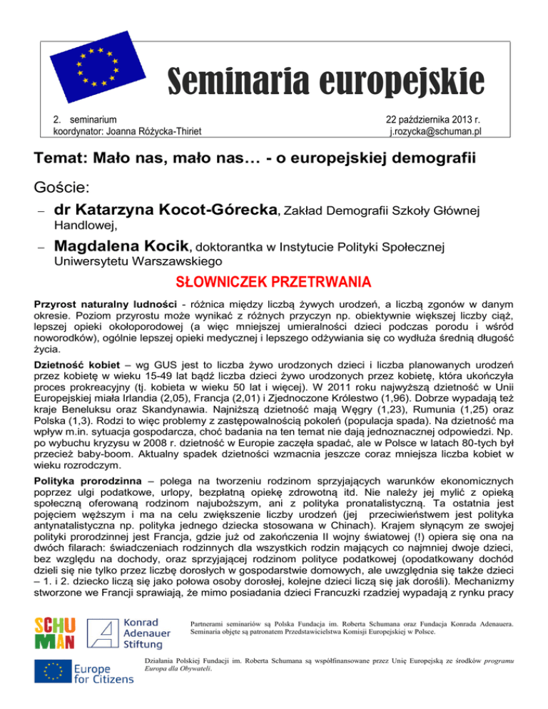 Seminaria europejskie 2. seminarium koordynator: Joanna Różycka-Thiriet 22 października 2013 r. [email protected] Temat: Mało nas, mało nas… - o europejskiej demografii Goście: dr Katarzyna Kocot-Górecka, Zakład Demografii Szkoły Głównej Handlowej, Magdalena Kocik, doktorantka w Instytucie Polityki Społecznej Uniwersytetu Warszawskiego SŁOWNICZEK PRZETRWANIA Przyrost naturalny ludności - różnica między liczbą żywych urodzeń, a liczbą zgonów w danym okresie. Poziom przyrostu może wynikać z różnych przyczyn np. obiektywnie większej liczby ciąż, lepszej opieki okołoporodowej (a więc mniejszej umieralności dzieci podczas porodu i wśród noworodków), ogólnie lepszej opieki medycznej i lepszego odżywiania się co wydłuża średnią długość życia. Dzietność kobiet – wg GUS jest to liczba żywo urodzonych dzieci i liczba planowanych urodzeń przez kobietę w wieku 15-49 lat bądź liczba dzieci żywo urodzonych przez kobietę, która ukończyła proces prokreacyjny (tj. kobieta w wieku 50 lat i więcej). W 2011 roku najwyższą dzietność w Unii Europejskiej miała Irlandia (2,05), Francja (2,01) i Zjednoczone Królestwo (1,96). Dobrze wypadają też kraje Beneluksu oraz Skandynawia. Najniższą dzietność mają Węgry (1,23), Rumunia (1,25) oraz Polska (1,3). Rodzi to więc problemy z zastępowalnością pokoleń (populacja spada). Na dzietność ma wpływ m.in. sytuacja gospodarcza, choć badania na ten temat nie dają jednoznacznej odpowiedzi. Np. po wybuchu kryzysu w 2008 r. dzietność w Europie zaczęła spadać, ale w Polsce w latach 80-tych był przecież baby-boom. Aktualny spadek dzietności wzmacnia jeszcze coraz mniejsza liczba kobiet w wieku rozrodczym. Polityka prorodzinna – polega na tworzeniu rodzinom sprzyjających warunków ekonomicznych poprzez ulgi podatkowe, urlopy, bezpłatną opiekę zdrowotną itd. Nie należy jej mylić z opieką społeczną oferowaną rodzinom najuboższym, ani z polityka pronatalistyczną. Ta ostatnia jest pojęciem węższym i ma na celu zwiększenie liczby urodzeń (jej przeciwieństwem jest polityka antynatalistyczna np. polityka jednego dziecka stosowana w Chinach). Krajem słynącym ze swojej polityki prorodzinnej jest Francja, gdzie już od zakończenia II wojny światowej (!) opiera się ona na dwóch filarach: świadczeniach rodzinnych dla wszystkich rodzin mających co najmniej dwoje dzieci, bez względu na dochody, oraz sprzyjającej rodzinom polityce podatkowej (opodatkowany dochód dzieli się nie tylko przez liczbę dorosłych w gospodarstwie domowych, ale uwzględnia się także dzieci – 1. i 2. dziecko liczą się jako połowa osoby dorosłej, kolejne dzieci liczą się jak dorośli). Mechanizmy stworzone we Francji sprawiają, że mimo posiadania dzieci Francuzki rzadziej wypadają z rynku pracy Partnerami seminariów są Polska Fundacja im. Roberta Schumana oraz Fundacja Konrada Adenauera. Seminaria objęte są patronatem Przedstawicielstwa Komisji Europejskiej w Polsce. Działania Polskiej Fundacji im. Roberta Schumana są współfinansowane przez Unię Europejską ze środków programu Europa dla Obywateli. (w 2009 roku we Francji pracowało 76% kobiet z jednym dzieckiem na utrzymaniu i 50,4% z trojgiem lub większą ilością dzieci; w Niemczech 73,5% z jednym dzieckiem i 42,5% z trójką lub więcej). Francuska dzietność idzie w górę i pozostaje na czele rankingu (po lewej ilość dzieci na kobietę we Francji, po prawej ewolucja od 2000 roku – Francja, Niemcy, USA i UE 27. DOBRZE POWIEDZIANE – FRAZA DNIA Kinder, Kirche, Küche (Dziecko, kościół, kuchnia) - ta XIX-wieczna zasada 3 K miała określać w Niemczech miejsce kobiet w społeczeństwie. W efekcie Niemki, które same nie zajmują się swoimi małymi dziećmi, są często traktowane jak wyrodne matki (skądinąd problem ten nie istnieje w płodnej Francji). Aktualnie jednak w obliczu spadającej dzietności (w 2011 roku 1,36) i starzejącej się populacji władze Niemiec próbują zmienić nastawienie do opieki nad małymi dziećmi i zachęcić kobiety do posiadania potomstwa, umożliwiając im łączenie życia zawodowego z pracą. 1 sierpnia br. w życie weszła ustawa, na mocy której każde 2 i 3-letnie dziecko ma prawo do miejsca w żłobku. Tym rodzicom, którzy zdecydują się na opiekę w domu, przysługuje pomoc finansowa – aktualnie 100, a od sierpnia przyszłego roku 150 euro. Ustawa przegłosowana została pięć lat temu przez wielką koalicję CDU/CSU/SPD i postawiła samorządy lokalne w stan gotowości (musiały przygotować odpowiednią liczbę miejsce w placówkach oraz znaleźć wyszkolonych opiekunów). Rodzice, których dzieci nie zostaną przyjęte do żłobka z braku miejsc, mogą dochodzić swoich praw na drodze sądowej. Niemcy są światowej czołówce jeśli chodzi o odsetek bezdzietnych kobiet. INTERNET, CZYLI CO W TRWIE PISZCZY ec.europa.eu/eurostat - strona urzędu statystycznego Unii Europejskiej z siedzibą w Luksemburgu. Z formalnego punktu widzenia Eurostat jest częścią struktur Komisji Europejskiej. Jego celem jest dostarczanie statystyk obrazujących europejskie zjawiska i umożliwiających dokonywanie porównań między państwami. Eurostat współpracuje z instytucjami krajów członkowskich. Oprócz wskaźników takich jak poziom inflacji, bezrobocia czy PKB Eurostat publikuje dane na temat ludności czy unijnych polityk. Publikując dane Eurostat sugeruje się kalendarzem – dane na temat nauczania języków obcych w szkołach opublikował z okazji Europejskiego Dnia Języków, statystyki na temat kontaktów z krajami spoza Unii publikuje przy okazji szczytów z tymi państwami itd. Niestety strona działa tyko w 3 językach – po angielsku, niemiecku i francusku. Mnogość dostępnych statystyk powoduje, że strona wydaje się mało przejrzysta, ale na szczęście jest wyszukiwarka… Partnerami seminariów są Polska Fundacja im. Roberta Schumana oraz Fundacja Ko