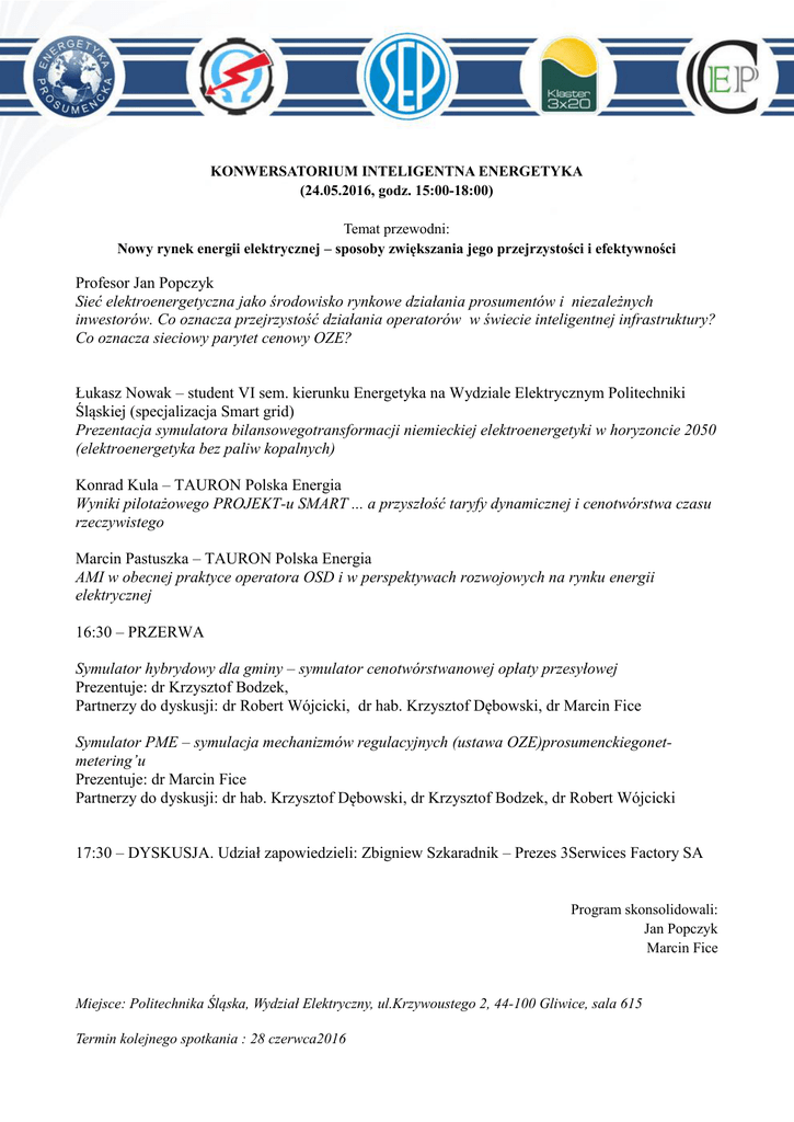KONWERSATORIUM INTELIGENTNA ENERGETYKA (24.05.2016, godz. 15:00-18:00) Temat przewodni: Nowy rynek energii elektrycznej – sposoby zwiększania jego przejrzystości i efektywności Profesor Jan Popczyk Sieć elektroenergetyczna jako środowisko rynkowe działania prosumentów i niezależnych inwestorów. Co oznacza przejrzystość działania operatorów w świecie inteligentnej infrastruktury? Co oznacza sieciowy parytet cenowy OZE? Łukasz Nowak – student VI sem. kierunku Energetyka na Wydziale Elektrycznym Politechniki Śląskiej (specjalizacja Smart grid) Prezentacja symulatora bilansowegotransformacji niemieckiej elektroenergetyki w horyzoncie 2050 (elektroenergetyka bez paliw kopalnych) Konrad Kula – TAURON Polska Energia Wyniki pilotażowego PROJEKT-u SMART ... a przyszłość taryfy dynamicznej i cenotwórstwa czasu rzeczywistego Marcin Pastuszka – TAURON Polska Energia AMI w obecnej praktyce operatora OSD i w perspektywach rozwojowych na rynku energii elektrycznej 16:30 – PRZERWA Symulator hybrydowy dla gminy – symulator cenotwórstwanowej opłaty przesyłowej Prezentuje: dr Krzysztof Bodzek, Partnerzy do dyskusji: dr Robert Wójcicki, dr hab. Krzysztof Dębowski, dr Marcin Fice Symulator PME – symulacja mechanizmów regulacyjnych (ustawa OZE)prosumenckiegonetmetering’u Prezentuje: dr Marcin Fice Partnerzy do dyskusji: dr hab. Krzysztof Dębowski, dr Krzysztof Bodzek, dr Robert Wójcicki 17:30 – DYSKUSJA. Udział zapowiedzieli: Zbigniew Szkaradnik – Prezes 3Serwices Factory SA Program skonsolidowali: Jan Popczyk Marcin Fice Miejsce: Politechnika Śląska, Wydział Elektryczny, ul.Krzywoustego 2, 44-100 Gliwice, sala 615 Termin kolejnego spotkania : 28 czerwca2016 Komunikat do Konwersatorium z dnia 26kwietnia 2016 r. Przebieg kwietniowego spotkania konwersatoryjnego, łącznie z przeprowadzoną dyskusją, upoważniają do trzech ważnych konkluzji. Po pierwsze, ciągle potrzebne jest zderzanie bardzo różnych wymiarów dokonującej się przebudowy energetyki: wymiaru globalnego i lokalnego; makro- i mikro-ekonomicznego; technicznego, ekonomicznego i społecznego; profesorskiego, ministerialnego, prezesowskiego i studenckiego. Te zderzenia są warunkiem nowej konsolidacji kompetencji, nowego języka do opisu energetyki, ale także nowych metod badawczych i nowych potrzeb edukacyjnych. Jednocześnie widoczny jest coraz bardziej przełom w zakresie percepcji nieuchronności głębokiej przebudowy energetyki. Konsekwencje tego są wielorakie. Najpoważniejszą jest nowa postawa tych, którzy są najbardziej zaangażowani w zmiany. Widzą oni, że nie ma już ryzyka błędu w wypadku zaangażowania się po stronie przebudowy energetyki, rosną natomiast koszty związane z jej petryfikacją. To pociąga za sobą konsekwencje. Mianowicie utrwala się coraz szerzej przekonanie, że przekonywanie nieprzekonanych jest już mało efektywne. Potrzebne są za to coraz bardziej odważne koncepcje (dotyczące nowej ekonomii, nowych rynków energii, nowych modeli biznesowych, nowych narzędzi badawczych). Po drugie, na pewno jedną z najbardziej palących potrzeb jestopracowanie koncepcji całkowicie nowego rynku energii elektrycznej, koncepcji zmniejszającej już bardzo silne napięcie między nadbudową i bazą, czyli zmniejszającej nieadekwatność rządowej polityki energetycznej i modelu biznesowego energetyki WEK względem nowego środowiska technologicznego, ekonomicznego i społecznego (w szczególności względem energetyki NI oraz EP). Koncepcja taka została zarysowana w [Raporcie BŹEP] Popczyk J.MODEL INTERAKTYWNEGO RYNKU ENERGII ELEKTRYCZNEJ. Od rynku grup interesów do cenotwórstwa czasu rzeczywistego.Zaproponowany model jest modelem postulatywnym autora. To oznacza, że za modelem nie stoi rząd, żadna inna instytucja odpowiedzialna za bezpieczeństwo energetyczne w Polsce (URE, OSP-PSE), ani też żadne środowisko posiadające stosowny mandat społeczny (środowisko naukowe – np. PAN, środowisko gospodarcze – np. Krajowa Izba Gospodarcza, środowisko inżynierskie – np. SEP, czy jeszcze inne). Czyli za modelem nie stoi żadna realna siła decyzyjna ani realna siła lobbystyczna.Z drugiej strony, autor wyraża przekonanie, że model ma duży potencjał w zakresie kształtowania nowej świadomości/mentalności i nowego układu sił związanego z zaspakajaniem gospodarki w energię elektryczną. W tym kontekście model może przyspieszać pełzające zmiany, które i tak są nieuchronne. Po trzecie, symulator hybrydowy wykorzystujący środowisko programistyczne LabVIEW za pomocą którego są realizowane w CEP badania (dr inż. K. Bodzek, dr inż. M. Fice, dr inż. R. Wójcicki) związane z koncepcją nowego rynku energii elektrycznej okazał się już bardzo silnym narzędziem badawczym. Obiecujące są w szczególności wyniki (uzyskane przez dr inż. K. Bodzka) w zakresie przełamywania bariery związanej z 5-minutowym bilansowaniem energii w referencyjnej gminie wiejskiej przebudowującej gospodarkę elektroenergetyczną w kierunku autonomicznej gospodarki bezemisyjnej, i jeszcze znacznie ważniejsze wyniki w zakresie daleko idącego uzmiennienia opłaty przesyłowej/dystrybucyjnej. W tym zakresie stosuje się w symulatorze w dużym stopniu heurystyczną technikę naśladowania procedur/zasad stosowanych na rzeczywistym rynku energii elektrycznej przez operatorów dystrybucyjnych. Dotychczasowe wyniki pokazują użyteczność narzędzia analityczno-prognostyczne, jakim jest symulator hybrydowy,w efektywnym kształtowaniumechanizmów nowego rynku. Funkcjonalność symulatora pozwala na realizację szerokiego programu badawczego przebudowy rynku energetycznego, począwszy od odbiorców indywidualnych (w szczególności PME), przez wyspy energetyczne (gminy), po cenotwórstwo czasu rzeczywistego (możliwość powiązaniazróżnicowanych zagadnień we wspólny łańcuch wartości). Kwietniowe spotkanie konwersatoryjne w praktycznym aspekcie przeło