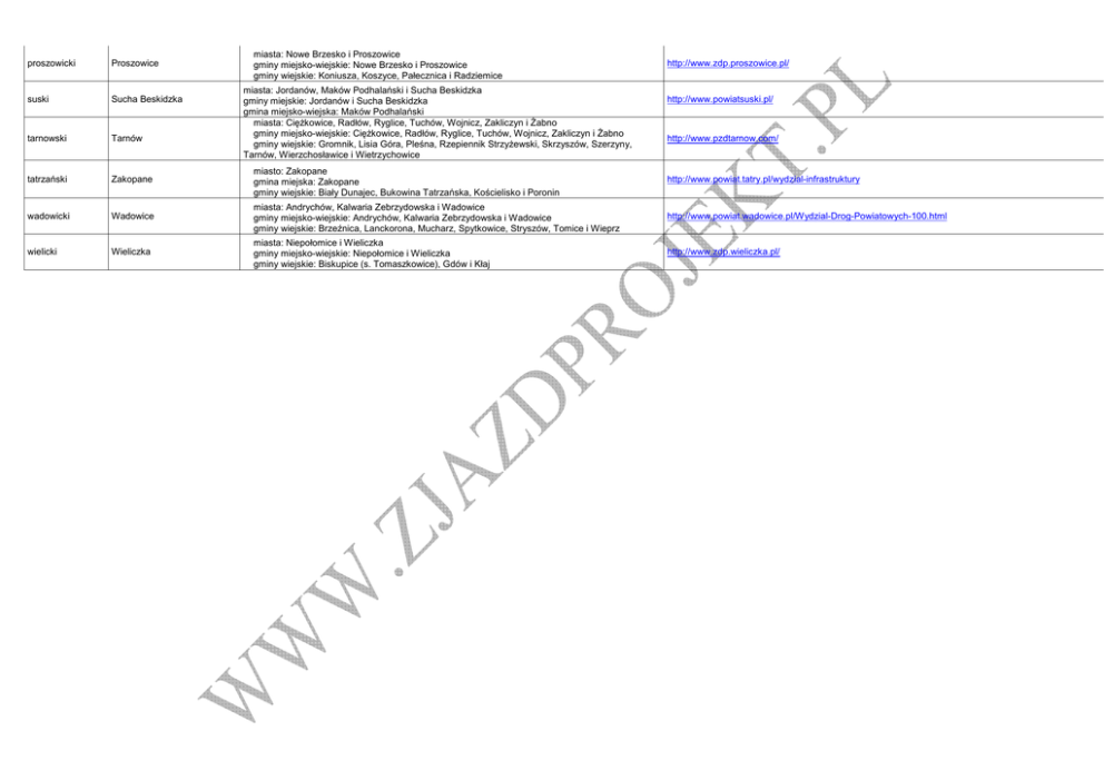 miasta: Nowe Brzesko i Proszowice gminy miejsko-wiejskie: Nowe Brzesko i Proszowice gminy wiejskie: Koniusza, Koszyce, Pałecznica i Radziemice proszowicki Proszowice suski Sucha Beskidzka tarnowski Tarnów tatrzański Zakopane miasto: Zakopane gmina miejska: Zakopane gminy wiejskie: Biały Dunajec, Bukowina Tatrzańska, Kościelisko i Poronin http://www.powiat.tatry.pl/wydzial-infrastruktury wadowicki Wadowice miasta: Andrychów, Kalwaria Zebrzydowska i Wadowice gminy miejsko-wiejskie: Andrychów, Kalwaria Zebrzydowska i Wadowice gminy wiejskie: Brzeźnica, Lanckorona, Mucharz, Spytkowice, Stryszów, Tomice i Wieprz http://www.powiat.wadowice.pl/Wydzial-Drog-Powiatowych-100.html wielicki Wieliczka miasta: Niepołomice i Wieliczka gminy miejsko-wiejskie: Niepołomice i Wieliczka gminy wiejskie: Biskupice (s. Tomaszkowice), Gdów i Kłaj http://www.zdp.wieliczka.pl/ miasta: Jordanów, Maków Podhalański i Sucha Beskidzka gminy miejskie: Jordanów i Sucha Beskidzka gmina miejsko-wiejska: Maków Podhalański miasta: Ciężkowice, Radłów, Ryglice, Tuchów, Wojnicz, Zakliczyn i Żabno gminy miejsko-wiejskie: Ciężkowice, Radłów, Ryglice, Tuchów, Wojnicz, Zakliczyn i Żabno gminy wiejskie: Gromnik, Lisia Góra, Pleśna, Rzepiennik Strzyżewski, Skrzyszów, Szerzyny, Tarnów, Wierzchosławice i Wietrzychowice http://www.zdp.proszowice.pl/ http://www.powiatsuski.pl/ http://www.pzdtarnow.com/ Zarządy Dróg Powiatowych - Małopolska Powiaty Kraków Nowy Sącz Tarnów krakowski http://zikit.krakow.pl/ http://www.mzd.nowysacz.pl/ https://www.bip.gov.pl/subjects/26962,Tarnowski+Zarz%C4%85d+Dr%C3%B3g+Miejskich.html grodzki grodzki grodzki Kraków miasta: Krzeszowice, Skała, Skawina, Słomniki i Świątniki Górne gminy miejsko-wiejskie: Krzeszowice, Skała, Skawina, Słomniki i Świątniki Górne gminy wiejskie: Czernichów, Igołomia-Wawrzeńczyce (s. Wawrzeńczyce), Iwanowice, Jerzmanowice-Przeginia (s. Jerzmanowice), Kocmyrzów-Luborzyca (s. Luborzyca), Liszki, Michałowice, Mogilany, Sułoszowa, Wielka Wieś, Zabierzów i Zielonki http://zdpk.krakow.pl/zdpk/ bocheński Bochnia miasta: Bochnia i Nowy Wiśnicz gmina miejska: Bochnia gmina miejsko-wiejska: Nowy Wiśnicz gminy wiejskie: Bochnia, Drwinia, Lipnica Murowana, Łapanów, Rzezawa, Trzciana i Żegocina brzeski Brzesko miasta: Brzesko i Czchów gminy miejsko-wiejskie: Brzesko i Czchów gminy wiejskie: Borzęcin, Dębno, Gnojnik, Iwkowa i Szczurowa http://www.zdp.okay.pl/web/index.php chrzanowski Chrzanów miasta: Alwernia, Chrzanów, Libiąż i Trzebinia gminy miejsko-wiejskie: Alwernia, Chrzanów, Libiąż i Trzebinia gmina wiejska: Babice http://pzd-chrzanow.pl/ bąbrowski Dąbrowa Tarnowska miasta: Dąbrowa Tarnowska i Szczucin gminy miejsko-wiejskie: Dąbrowa Tarnowska i Szczucin gminy wiejskie: Bolesław, Gręboszów, Mędrzechów, Olesno i Radgoszcz http://www.powiatdabrowski.pl/jednostki-powiatowe.html gorlicki Gorlice limanowski Limanowa miechowski Miechów myślenicki Myślenice nowosądecki Nowy Sącz nowotarski olkuski oświęcimski Nowy Targ miasta: Biecz, Bobowa i Gorlice gmina miejska: Gorlice gminy miejsko-wiejskie: Biecz i Bobowa gminy wiejskie: Gorlice, Lipinki, Łużna, Moszczenica, Ropa, Sękowa i Uście Gorlickie miasta: Limanowa i Mszana Dolna gminy miejskie: Limanowa i Mszana Dolna gminy wiejskie: Dobra, Jodłownik, Kamienica, Laskowa, Limanowa, Łukowica, Mszana Dolna, Niedźwiedź, Słopnice i Tymbark miasto: Miechów gmina miejsko-wiejska: Miechów gminy wiejskie: Charsznica, Gołcza, Kozłów, Książ Wielki, Racławice i Słaboszów miasta: Dobczyce, Myślenice i Sułkowice gminy miejsko-wiejskie: Dobczyce, Myślenice i Sułkowice miasta: Grybów, Krynica-Zdrój, Muszyna, Piwniczna-Zdrój i Stary Sącz gmina miejska: Grybów gminy miejsko-wiejskie: Krynica-Zdrój, Muszyna, Piwniczna-Zdrój i Stary Sącz gminy wiejskie: Chełmiec, Gródek nad Dunajcem, Grybów, Kamionka Wielka, Korzenna, Łabowa, Łącko, Łososina Dolna, Nawojowa, Podegrodzie i Rytro miasta: Nowy Targ, Rabka-Zdrój i Szczawnica gmina miejska: Nowy Targ gminy miejsko-wiejskie: Rabka-Zdrój i Szczawnica gminy wiejskie: Czarny Dunajec, Czorsztyn (s. Maniowy), Jabłonka, Krościenko nad Dunajcem, Lipnica Wielka, Łapsze Niżne, Nowy Targ, Ochotnica Dolna, Raba Wyżna, Spytkowice i Szaflary http://www.pzd.bochnia.pl/ http://www.pzdgorlice.pl/ http://www.pzd.limanowa.pl/ http://www.zdpm.pl/ http://www.zdp-myslenice.pl/ http://www.pzd.nowy-sacz.pl/index.htm http://www.pzd.nowotarski.pl/ Olkusz miasta: Bukowno, Olkusz i Wolbrom gmina miejska: Bukowno gminy miejsko-wiejskie: Olkusz i Wolbrom gminy wiejskie: Bolesław, Klucze i Trzyciąż http://www.olkusz.pzd.net.pl/ Oświęcim miasta: Brzeszcze, Chełmek, Kęty, Oświęcim i Zator gmina miejska: Oświęcim gminy miejsko-wiejskie: Brzeszcze, Chełmek, Kęty i Zator gminy wiejskie: Osiek, Oświęcim, Polanka Wielka i Przeciszów http://powiat.oswiecim.pl/index.php/strony/10133