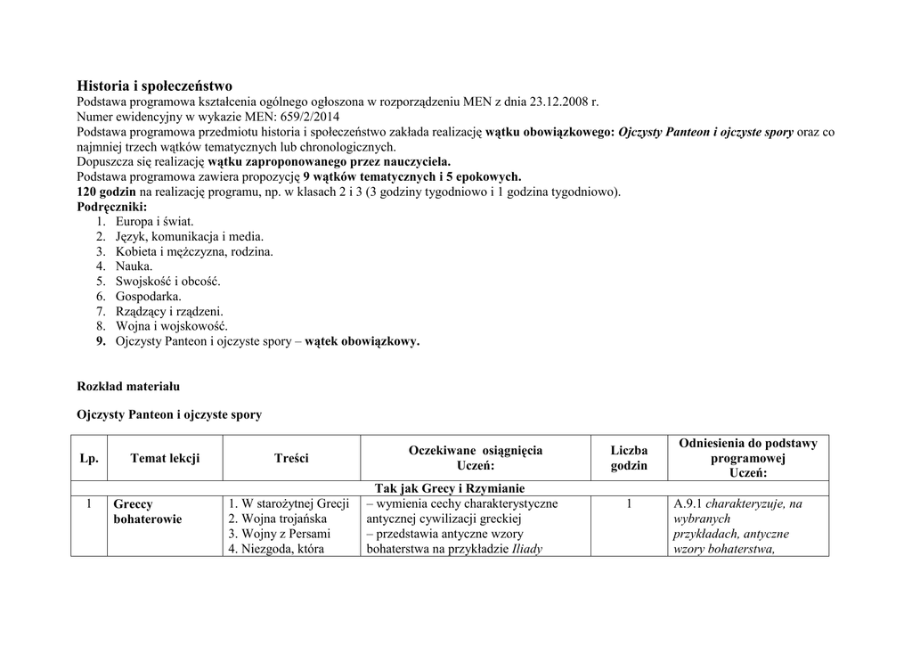 Historia i społeczeństwo Podstawa programowa kształcenia ogólnego ogłoszona w rozporządzeniu MEN z dnia 23.12.2008 r. Numer ewidencyjny w wykazie MEN: 659/2/2014 Podstawa programowa przedmiotu historia i społeczeństwo zakłada realizację wątku obowiązkowego: Ojczysty Panteon i ojczyste spory oraz co najmniej trzech wątków tematycznych lub chronologicznych. Dopuszcza się realizację wątku zaproponowanego przez nauczyciela. Podstawa programowa zawiera propozycję 9 wątków tematycznych i 5 epokowych. 120 godzin na realizację programu, np. w klasach 2 i 3 (3 godziny tygodniowo i 1 godzina tygodniowo). Podręczniki: 1. Europa i świat. 2. Język, komunikacja i media. 3. Kobieta i mężczyzna, rodzina. 4. Nauka. 5. Swojskość i obcość. 6. Gospodarka. 7. Rządzący i rządzeni. 8. Wojna i wojskowość. 9. Ojczysty Panteon i ojczyste spory – wątek obowiązkowy. Rozkład materiału Ojczysty Panteon i ojczyste spory Lp. 1 Temat lekcji Greccy bohaterowie Treści 1. W starożytnej Grecji 2. Wojna trojańska 3. Wojny z Persami 4. Niezgoda, która Oczekiwane osiągnięcia Uczeń: Tak jak Grecy i Rzymianie – wymienia cechy charakterystyczne antycznej cywilizacji greckiej – przedstawia antyczne wzory bohaterstwa na przykładzie Iliady Liczba godzin 1 Odniesienia do podstawy programowej Uczeń: A.9.1 charakteryzuje, na wybranych przykładach, antyczne wzory bohaterstwa, rujnuje 2 Polskie Termopile 1. Polski Leonidas 2. Bitwa pod Zadwórzem 3. Bohaterowie spod Wizny i Monte Cassino 3 1. Republika rzymska Republika 2. Rzymski obywatel – rzymska – państwo obywateli patriota 3. Kryzys republiki 4. Upadek republiki. Homera – charakteryzuje postawy antycznego żołnierza i obrońcy ojczyzny na przykładzie wojen grecko-perskich – omawia skutki wojny peloponeskiej dla świata greckiego – opisuje recepcję bitew pod Maratonem i Termopilami w kulturze – wyjaśnia, kto i dlaczego zyskał miano polskiego Leonidasa – przedstawia motyw Termopil i jego znaczenie w polskiej literaturze – opisuje przebieg i znaczenie bitwy pod Zadwórzem oraz wyjaśnia jej symbolikę – przedstawia bitwy pod Wizną i Monte Cassino jako symboliczne oraz historyczne nawiązania do greckich Termopil – omawia i ocenia znaczenie popularyzowania wiedzy o wydarzeniach historycznych za pomocą współczesnych środków przekazu – przedstawia cechy charakterystyczne republiki rzymskiej – omawia cechy rzymskiego obywatela – patrioty na przykładzie Cyncynata – wyjaśnia zależności między kryzysem republiki rzymskiej a upadkiem cnót obywatelskich – analizuje możliwość zastosowania obywatelskich wzorców obowiązujących w starożytnej republice rzymskiej w żołnierza i obrońcy ojczyzny oraz ich recepcję w polskiej myśli politycznej, tradycji literackiej oraz edukacyjnej późniejszych epok. 1 A.9.1 charakteryzuje, na wybranych przykładach, antyczne wzory bohaterstwa, żołnierza i obrońcy ojczyzny oraz ich recepcję w polskiej myśli politycznej, tradycji literackiej oraz edukacyjnej późniejszych epok. 1 A.9.2 charakteryzuje antyczny wzorzec obywatela oraz jego recepcję w polskiej myśli i praktyce politycznej późniejszych epok. 4 Polski patriotyzm na przestrzeni wieków 1 Jak rządzili pierwsi Piastowie 2 Ostatni Piastowie dzisiejszych czasach 1. Patriotyzm w – przedstawia zmiany w rozumieniu przeszłości pojęcia patriotyzm w Polsce na 2. Święta narodowe przestrzeni dziejów 3. Patriotyzm dziś – wskazuje wydarzenia, które miały wpływ na rozwój polskiego patriotyzmu – charakteryzuje postawy patriotyczne w Polsce na przestrzeni dziejów – omawia mity związane z polskim patriotyzmem – wymienia polskie święta narodowe – wyjaśnia, czym charakteryzuje się współczesny patriotyzm i podaje jego przykłady Za panowania Piastów i Jagiellonów 1. Dynastia Piastów – lokalizuje w czasie panowanie dynastii 2. Pierwszy król Polski piastowskiej 3. Spory o tron i kryzys – wyjaśnia, jakie przesłanki umożliwiły państwa Piastów Bolesławowi Chrobremu sięgnięcie po 4. Od odbudowy do koronę królewską podziału państwa – omawia sytuację wewnętrzną w Piastów państwie piastowskim w XI w. i jej wpływ na pozycję władcy – przedstawia cechy charakterystyczne panowania Kazimierza Odnowiciel, Bolesława Śmiałego i Bolesława Krzywoustego – porównuje oraz ocenia koncepcje polityczne Bolesława Chrobrego, Bolesława Śmiałego i Bolesława Krzywoustego 1. Drogi do – przedstawia cechy charakterystyczne 1 A.9.2 charakteryzuje antyczny wzorzec obywatela oraz jego recepcję w polskiej myśli i praktyce politycznej późniejszych epok. 1 B.9.1 charakteryzuje, na wybranych przykładach, koncepcje polityczne władców z dynastii piastowskiej. 1 B.9.1 charakteryzuje, na 3 na tronie polskim zjednoczenia 2. Metropolia na straży jedności 3. Panowanie Kazimierza Wielkiego 4. Zmiana dynastii w Polsce Polska częścią Europy łacińskiej 1. Chrzest Mieszka I 2. Zjazd w Gnieźnie. 3. Katoliccy patroni Polsce 4. Kultura i sztuka chrześcijańska 5. Wartości i obyczajowość chrześcijańska 6. Architektura i sztuka polska w średniowieczu 7. Kronikarze dziejów Polski 8. Laicyzacja i chrześcijaństwo w czasach współczesnych rozbicia dzielnicowego w Polsce piastowskiej – omawia przyczyny i etapy jednoczenia ziem polskich – opisuje i ocenia rolę Kościoła w jednoczeniu państwa polskiego – charakteryzuje i ocenia panowanie Kazimierza Wielkiego – prezentuje okoliczności przejęcia władzy w Polsce przez Andegawenów i Jagiellonów – omawia i ocenia skutki przyjęcia chrześcijaństwa przez Mieszka I – opisuje postanowienia zjazdu w Gnieźnie i wymienia jego konsekwencje – przedstawia na wybranych przykładach rolę, jaką w średniowiecznym państwie i społeczeństwie odgrywali święci patroni – prezentuje cechy charakterystyczne sztuki i kultury chrześcijańskiej w Polsce – określa, na które obszary kultury chrześcijaństwo 