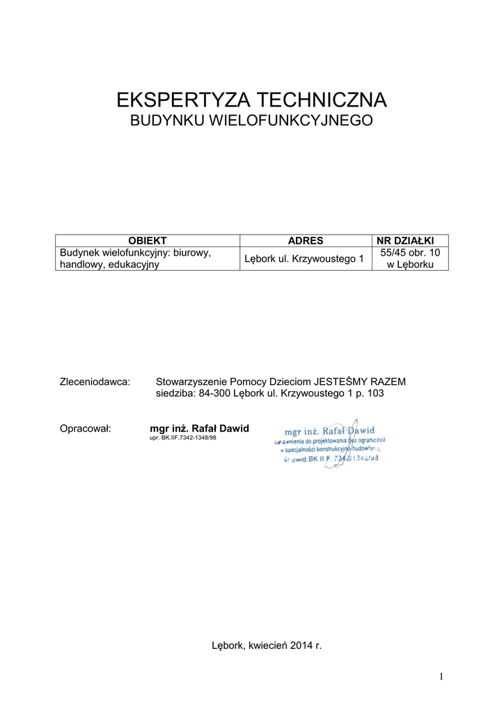 EKSPERTYZA TECHNICZNA BUDYNKU WIELOFUNKCYJNEGO OBIEKT Budynek wielofunkcyjny: biurowy, handlowy, edukacyjny Zleceniodawca: Opracował: ADRES Lębork ul. Krzywoustego 1 NR DZIAŁKI 55/45 obr. 10 w Lęborku Stowarzyszenie Pomocy Dzieciom JESTEŚMY RAZEM siedziba: 84-300 Lębork ul. Krzywoustego 1 p. 103 mgr inż. Rafał Dawid upr. BK.IIF.7342-1348/98 Lębork, kwiecień 2014 r. 1 1.0. DANE FORMALNO-PRAWNE. 1.1 Zleceniodawca. Podstawą formalną opracowania jest zlecenie przez inwestora. 1.2 Przedmiot opracowania. Przedmiotem opracowania jest wykonanie ekspertyzy technicznej pomieszczeń w budynku wielofunkcyjnym na potrzeby zmiany sposobu użytkowania pomieszczeń biurowych na funkcję terapii zajęciowej dla osób niepełnosprawnych oraz wykonania robót konstrukcyjnych – otwory drzwiowe w Ekspertyza dotyczy tych części budynku które będą podlegały przebudowie oraz zmianie sposobu użytkowania oraz części bezpośrednio sąsiadujących. Brane jest również pod uwagę oddziaływanie zmian na całość budynku. 1.3 Cel opracowania. Celem niniejszego opracowania jest sprawdzenie, czy przedmiotowy obiekt jest w stanie technicznym umożliwiającym dokonanie w nich zmian w konstrukcji oraz czy możliwa jest zmiana sposobu użytkowania przedmiotowych pomieszczeń na funkcję terapii zajęciowej. 1.4 Stan prawny nieruchomości. Budynek jest własnością Gminy Miejskiej Lębork oddany w użyczenie stowarzyszeniom pozarządowym działającym na terenie miasta Lęborka. 1.5 Źródła informacji. • Wizja lokalna w kwietniu 2014r. • Informacje uzyskane od właściciela. • Oględziny elementów konstrukcyjnych budynku. 1.6. Podstawy prawne opracowania. 1.6.1. Ustawa Prawo budowlane. 1.6.2. Oględziny i pomiary własne. 1.6.3. Rozporządzenie Ministra Infrastruktury warunki techniczne jakim powinny odpowiadać budynki i ich usytuowanie. 1.6.4. Polskie Normy. 1.6.5. Literatura techniczna. 1.6.6. Publikacja: Zużycie obiektów budowlanych „WACETOB”, Warszawa 1998. 2.0. DANE TECHNICZNE. 2.1. Dane ogólne. Obiekt został wykonany w latach 70-tych XX wieku na potrzeby biura zakładu produkcyjnego. W wyniku przekształceń własnościowych stał się własnością miasta Lębork. W budynku jest prowadzona różnoraka działalność – od sklepów i hurtowni w przyziemiu, poprzez siedziby stowarzyszeń – biura po sale konferencyjne i działalność dydaktyczną. Zmiany funkcji pomieszczeń wiązały się z licznymi przebudowami układu funkcjonalnego oraz instalacji wewnętrznych. Obiekt został w roku 2010 wyposażony w windę osobową przystosowaną do obsługi osób niepełnosprawnych. Wysokość kondygnacji z adaptowanymi pomieszczeniami – 3,0m. Budynek jest wyposażony w schody żelbetowe spełniające obowiązujące przepisy, wszystkie kondygnacje budynku są dostępne poprzez windę dla osób niepełnosprawnych. 2.2. Szczegółowy opis elementów konstrukcyjnych: fundamenty i ściany fundamentowe: nie były badane; ściany zewnętrzne: wykonane z pustaków ceramicznych na zaprawie wapiennej z obustronnym tynkiem cem.-wapiennym. Budynek został „docieplony” warstwą zewnętrzną styropianu z tynkiem lekkim systemowym. ściany wewnętrzne konstrukcyjne: wykonane z pustaków ceramicznych na zaprawie wapiennej z obustronnym tynkiem cem.-wapiennym 2 ściany działowe: z drobnowymiarowych elementów ceramicznych na zaprawie wapiennej; kominy: z drobnowymiarowych elementów ceramicznych – cegły pełnej na zaprawie wapiennej; - stropy: płyty kanałowe. 3.0. OCENA STANU TECHNICZNEGO. Stan techniczny elementów konstrukcyjnych oceniono na podstawie: Publikacji technicznej: Zużycie obiektów budowlanych „WACETOB”, Warszawa 1998 Fundamenty. Nie zostały przebadane. Ściany wewnętrzne. Pod względem konstrukcyjnym ściany znajdują się w stanie b. dobrym. Brak jest śladów świadczących o niewłaściwej pracy ścian konstrukcyjnych lub ich przeciążeniu. Ściany zewnętrzne. Pod względem konstrukcyjnym ściany znajdują się w stanie b. dobrym. Odchylenie od pionu na pełnej wysokości nie przekracza 5 cm. Nie występują spękania, odchylenia od pionu i zawilgocenia. Stropy. 3 Pod względem konstrukcyjnym stan techniczny konstrukcji stropu nad piwnicą jest b. dobrym. Nie stwierdzono zarysowań względnie odkształceń świadczących o przeciążeniu lub wadliwej pracy konstrukcyjnej. Brak widocznych ugięć lub wykrzywień. Stolarka okienna i drzwiowa. Stan techniczny średni. WNIOSKI Stan budynku określono, jako: STAN TECHNICZNY KONSTRUKCYJNY bardzo dobry W elementach budynków występują uszkodzenia i ubytki, niezagracające bezpieczeństwu. Elementy konstrukcyjne są utrzymane w sposób należyty. Budynek jest w stanie technicznych umożliwiającym wykonanie projektowanych prac budowlanych (wykucie dwóch otworów drzwiowych. Projektowane roboty, nie wpłyną na pogorszenie warunków konstrukcyjnych obiektu (nie zostaną przekroczone stany graniczne nośności i użytkowania konstrukcji). Planowane przebudowy elementów konstrukcyjnych polegają na wykuciu w ścianach nośnych otworów drzwiowych z zastosowaniem odpowiednich belek nadprożowych zamontowanych przed wykuciem otworów jest bezpieczne dla konstrukcji budynku. Warunkiem bezpieczeństwa jest wykonywanie prac pod nadzorem osoby uprawnionej zgodnie z niniejszym projektem budowlanym oraz bezwzględne przestrzeganie przepisów BHP. 4.0. OCENA MOŻLIWOŚCI ZMIANY SPOSOBU UŻYTKOWANIA. ASPEKT KONSTRUKCYJNY. Analizowane elementy konstrukcyjne części budynków przeznaczonych na funkcję terapii zajęciowej – strop, ściany nośne są w stanie przenieść obciążenia wynikające z funkcji dydaktycznej. ASPET WPŁYWU ZMIANY FUNKCJI NA ŚRODOWISKO. Ochrona pożarowa Zmiana funkcji z biurowej na zajęcia terapii osób niepełnosprawnych nie zmienia uwarunkowań ppożarowych. Zachowane są wymagane odległości dróg pożarowych w ciągach korytarzy oraz do klatek schodowych – dotychczasowy układ ochrony p-po