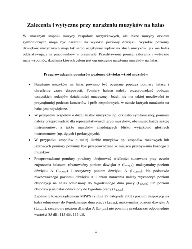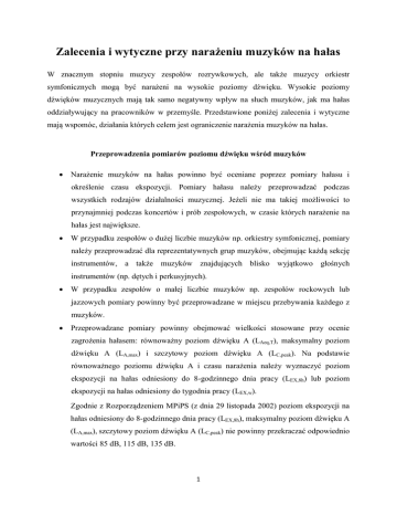 Zalecenia i wytyczne przy narażeniu muzyków na hałas W znacznym stopniu muzycy zespołów rozrywkowych, ale także muzycy orkiestr symfonicznych mogą być narażeni na wysokie poziomy dźwięku. Wysokie poziomy dźwięków muzycznych mają tak samo negatywny wpływ na słuch muzyków, jak ma hałas oddziaływujący na pracowników w przemyśle. Przedstawione poniżej zalecenia i wytyczne mają wspomóc, działania których celem jest ograniczenie narażenia muzyków na hałas. Przeprowadzenia pomiarów poziomu dźwięku wśród muzyków Narażenie muzyków na hałas powinno być oceniane poprzez pomiary hałasu i określenie czasu ekspozycji. Pomiary hałasu należy przeprowadzać podczas wszystkich rodzajów działalności muzycznej. Jeżeli nie ma takiej możliwości to przynajmniej podczas koncertów i prób zespołowych, w czasie których narażenie na hałas jest największe. W przypadku zespołów o dużej liczbie muzyków np. orkiestry symfonicznej, pomiary należy przeprowadzać dla reprezentatywnych grup muzyków, obejmując każdą sekcję instrumentów, a także muzyków znajdujących blisko wyjątkowo głośnych instrumentów (np. dętych i perkusyjnych). W przypadku zespołów o małej liczbie muzyków np. zespołów rockowych lub jazzowych pomiary powinny być przeprowadzane w miejscu przebywania każdego z muzyków. Przeprowadzane pomiary powinny obejmować wielkości stosowane przy ocenie zagrożenia hałasem: równoważny poziom dźwięku A (LAeq,T), maksymalny poziom dźwięku A (LA,max) i szczytowy poziom dźwięku A (LC,peak). Na podstawie równoważnego poziomu dźwięku A i czasu narażenia należy wyznaczyć poziom ekspozycji na hałas odniesiony do 8-godzinnego dnia pracy (LEX,8h) lub poziom ekspozycji na hałas odniesiony do tygodnia pracy (LEX,w). Zgodnie z Rozporządzeniem MPiPS (z dnia 29 listopada 2002) poziom ekspozycji na hałas odniesiony do 8-godzinnego dnia pracy (LEX,8h), maksymalny poziom dźwięku A (LA,max), szczytowy poziom dźwięku A (LC,peak) nie powinny przekraczać odpowiednio wartości 85 dB, 115 dB, 135 dB. 1 Prawidłowa technika pomiaru wymaga, aby mikrofon pomiarowy był umieszczony w pobliżu wejścia do przewodu słuchowego ucha w odległości około 0,1 m od głowy muzyka. W organizacji pomiarów należy uwzględnić zróżnicowanie repertuaru, przeprowadzając pomiary zarówno w trakcie bardziej jak i mniej dynamicznych utworów. Pomiary hałasu należy powtarzać przynajmniej co dwa lata lub częściej w zależności od stopnia narażenia muzyków na hałas. W przypadku wystąpienia przekroczeń wartości dopuszczalnych poziomu dźwięku należy podjąć działania prowadzące do ograniczania narażenia muzyków na hałas. Możliwe sposoby ograniczenia narażenia muzyków na dźwięki muzyczne o wysokim poziomie Ustawienie muzyków na estradzie W ustawieniu orkiestry należy stosować podesty, tak by instrumenty nie emitowały dźwięku bezpośrednio w kierunku muzyków siedzących w następnym rzędzie. Przykładowe ustawienie muzyków na podestach przedstawia rys. 1. Rys.1 Zalecane ustawienie muzyków na podestach Wystarczająca wysokość podestów zapewniająca, że dźwięk nie będzie kierowany na muzyka w następnym rzędzie wynosi 50 cm. W określonych przypadkach, z uwagi na złożone uwarunkowania ustawienia estrady, właściwa wysokość podestu może być ustalona w sposób eksperymentalny. 2 Ustawienie podestów powinno być takie by krawędzie podestów były wystarczająco widoczne z zachowaniem wygodnego dostępu muzyków do miejsca gry. Przy braku możliwości zastosowania podestów należy zachować większą przestrzeń pomiędzy muzykami. Stosowanie ekranów akustycznych Ograniczenie niekorzystnego wzajemnego oddziaływania dźwięku wśród muzyków zespołu może być uzyskane przez zastosowanie ekranów akustycznych. Ustawienie ekranów wśród muzyków należy przeprowadzać w sposób uwzględniający właściwości akustyczne ekranów. Ekran o małych rozmiarach mocowany do krzesła na którym siedzi muzyk lub na niezależnym statywie powinien być ustawiany bezpośrednio za głową muzyka. Ekran akustyczny w nieznacznym stopniu ogranicza ekspozycje na hałas, tłumiąc głównie dźwięki instrumentów znajdujących się bezpośrednio za ekranem. Ekran obniża poziom dźwięków instrumentów o wysokim stroju tj. trąbki, fletu, fletu piccolo, oboju, skrzypiec, natomiast nie ma zastosowania w przypadku instrumentów o niskim stroju tj. rogu, tuby, fagotu, wiolonczeli, kontrabasu. Należy wzięć pod uwagę, że w szczególnych przypadkach ekran akustyczny może powodować wzrost poziomu dźwięku poprzez odbicia. Dla izolacji dźwięku instrumentów perkusyjnych należy stosować ekrany o dużej powierzchni. Ekrany mocowane do krzeseł muzyków nie tłumią dźwięków instrumentów perkusyjnych. Wyjątek stanowi dźwięk talerzy (czyneli), który zawiera dużo składowych o wysokiej częstotliwości. Ekranów nie zaleca się stosować, gdy istnieje niebezpieczeństwo odbicia dźwięku własnego instrumentu, co może prowadzić do wzrostu poziomu dźwięku przy uchu. Taka sytuacja może wystąpić, przy grze na instrumentach promieniujących dźwięk do tyłu takich, jak flet, róg, skrzypce, altówka i fagot. Stosowanie wkładek przeciwhałasowych Wkładki przeciwhałasowe mają zastosowanie jako ochrona przed hałasem wtedy, kiedy inne metody ograniczenia narażenia na hałas okazują się nie wystarczające. 3 Muzycy powinni stosować wkładki przeciwhałasowe specjalnie dla nich opracowane o płaskiej charakterystyce tłumienia. Zaleca się stosowanie wkładek formowanych indywidualnie dla użytkownika (Rys.2). Takie wkładki są wygodniejsze i mniej widocznie. Wkładki formowane indywidualnie to wkładki, które wykonuje się dla konkretnej osoby na podstawie wycisku ucha. Jako wkładki dla muzyków występują także mniej wygodne wkładki uniwersalne. Rys.2 Wkładki formowane indywidualnie przeznacz