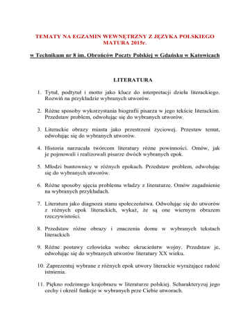 TEMATY NA EGZAMIN WEWN TRZNY Z J ZYKA POLSKIEGO MATURA 2015r. w Technikum nr 8 im. Obro ców Poczty Polskiej w Gda sku w Katowicach LITERATURA 1. Tytu , podtytu i motto jako klucz do interpretacji dzie a literackiego. Rozwi na przyk adzie wybranych utworów. 2. Ró ne sposoby wykorzystania biografii pisarza w jego tek cie literackim. Przedstaw problem, odwo uj c si do wybranych utworów. 3. Literackie obrazy miasta jako przestrzeni odwo uj c si do wybranych utworów. yciowej. Przestaw temat, 4. Historia narzuca a twórcom literatury ró ne powinno ci. Omów, jak je pojmowali i realizowali pisarze dwóch wybranych epok. 5. odzi buntownicy w ró nych epokach. Przedstaw problem, odwo uj c si do wybranych utworów. 6. Ró ne sposoby uj cia problemu w adzy z literaturze. Omów zagadnienie na wybranych przyk adach. 7. Literatura jako diagnoza stanu spo ecze stwa. Odwo uj c si do utworów z ró nych epok literackich, wyka , e s one wiernym obrazem rzeczywisto ci. 8. Przedstaw ró ne obrazy i znaczenia domu w wybranych tekstach literackich 9. Ró ne postawy cz owieka wobec okrucie stw wojny. Przedstaw je, odwo uj c si do wybranych utworów literatury XX wieku. 10. Zaprezentuj wybrane z ró nych epok utwory literackie wyra aj ce rado istnienia. 11. Pi kno rodzimego krajobrazu w literaturze polskiej. Scharakteryzuj jego cechy i okre l funkcje w wybranych prze Ciebie utworach. ZWI ZKI LITERATURY Z INNYMI DZIEDZINAMI SZTUKI 1. Wizje ko ca wiata w literaturze i malarstwie XX wieku. Okre l ich istot i funkcje, odwo uj c si do wybranych dzie . 2. Funkcje brzydoty w literaturze i innych dziedzinach sztuki. Przedstaw je, odwo uj c si do wybranych przyk adów. 3. Porównaj sposoby przedstawiania wa nych wydarze w historii narodu w literaturze, malarstwie lub filmie na wybranych przyk adach. 4. Motywy katastroficzne w kulturze XIX i XX wieku. Omów, analizuj c wybrane dzie a literackie i filmowe. 5. Ró ne sposoby przedstawiania postaci ojca w literaturze i sztuce. Przedstaw problem na podstawie wybranych przyk adów. 6. Smutek, pesymizm, melancholia…- jako sposób prze ywania i opisywania wiata. Omów problem na przyk adzie wybranych dzie literackich i malarskich. 7. Omów problem funkcji sztuki i roli artysty w odwo aniu do wybranych dzie literackich i malarskich oraz deklaracji programowych poszczególnych autorów. 8. Pojedynek jako temat literacki na wybranych przyk adach. i filmowy. Omów zagadnienie 9. Literackie i malarskie symbole przemijania. Omów wykorzystuj c odpowiednio dobrane teksty kultury. 10. Sceny batalistyczne w literaturze, malarstwie, filmie. Omów wybrane przyk ady i porównaj sposoby ich kreowania. 11. Polskie obrz dy ludowe jako inspiracja artystyczna. Omów na wybranych przyk adach z ró nych dziedzin sztuki ZYK 1. Komizm s owny i sposoby jego realizacji Omów na wybranych przyk adach literackich. w utworach. 2. Omów na wybranych przyk adach pochodzenie nazw miejscowych Twojego regionu. 3. Wieloznaczno wyrazów i jej konsekwencje dla procesu komunikacji. Omów zagadnienie na wybranym materiale j zykowym. 4. zyk jako rodek manipulacji odbiorc . wykorzystuj c przyk ady z literatury i prasy. Przedstaw problem, 5. Wypowiedzi polityków. Na podstawie wybranego materia u dokonaj kwalifikacji najcz ciej pojawiaj cych si b dów j zykowych. 6. Na wybranych przyk adach scharakteryzuj s ownictwo internetowe. Oce jego poprawno w kontek cie kultury j zyka. 7. zyk prasy, radia i telewizji oraz jego wp yw na wspó czesne s ownictwo. Omów problem, odwo uj c si do zebranych przyk adów. 8. rodki poetyckiego obrazowania Omów je na wybranych przyk adach. w literaturze XX wieku.