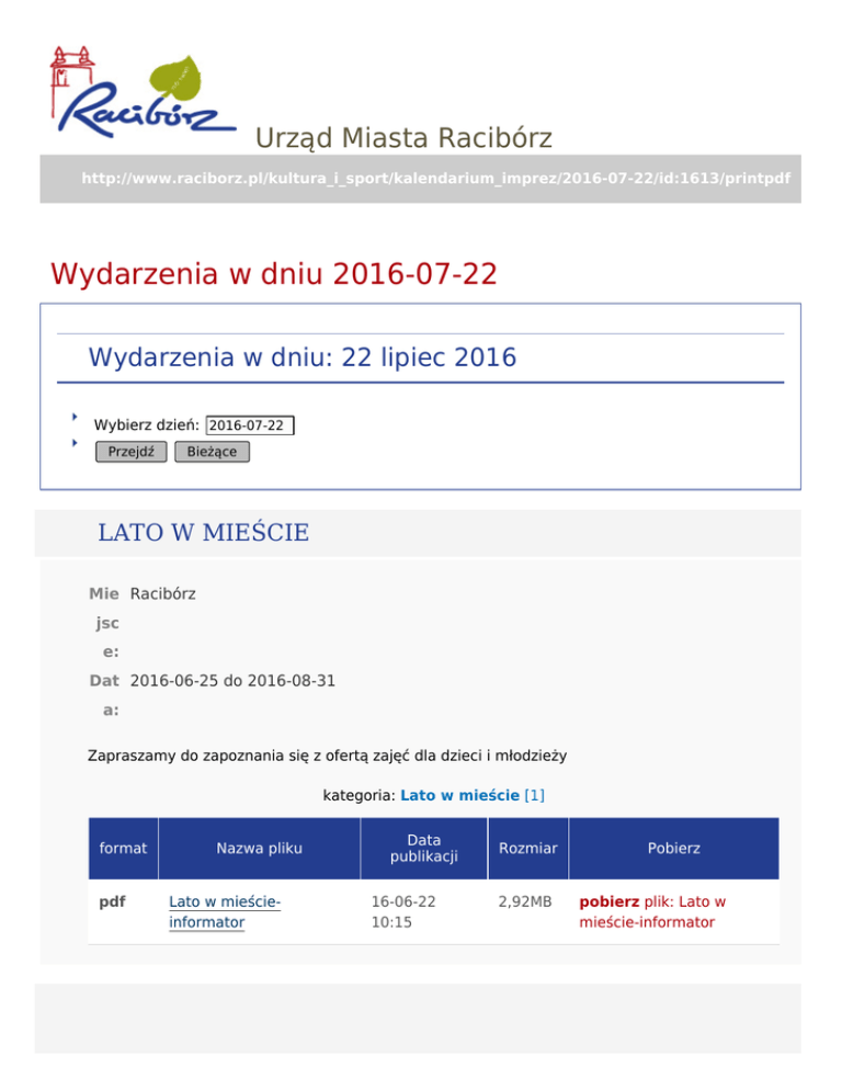 Urząd Miasta Racibórz http://www.raciborz.pl/kultura_i_sport/kalendarium_imprez/2016-07-22/id:1613/printpdf Wydarzenia w dniu 2016-07-22 Wydarzenia w dniu: 22 lipiec 2016 Wybierz dzień: 2016-07-22 Przejdź Bieżące LATO W MIEŚCIE Mie Racibórz jsc e: Dat 2016-06-25 do 2016-08-31 a: Zapraszamy do zapoznania się z ofertą zajęć dla dzieci i młodzieży kategoria: Lato w mieście [1] format pdf Nazwa pliku Lato w mieścieinformator Data publikacji 16-06-22 10:15 Rozmiar 2,92MB Pobierz pobierz plik: Lato w mieście-informator ŚDM: KONCERT KLUBU PIOSENKI POETYCKIEJ I AKTORSKIEJ "ATLANTYDA" Mie Parafia Najświętszego Serca Pana Jezusa w Raciborzu jsc e: Go 20:30 dzi na: Dat 2016-07-22 do 2016-07-22 a: W ramach Światowych Dni Młodzieży w kościele pw. NSPJ usłyszymy koncert w wykonaniu Klubu Piosenki Poetyckiej i Aktorskiej "ATLANTYDA", pod kierunkiem Ireny Hlubek. W styczniu 1996 roku w Domu Kultury "Strzecha” w Raciborzu powstał Klub Poezji Śpiewanej "ATLANTYDA”. Skupiał od swoich początków młodzież licealną, a z czasem gimnazjalną i studencką. Nowością tego klubu było tworzenie żywej muzyki. Na zajęcia młodzież przynosiła i w dalszym ciągu przynosi swoje instrumenty muzyczne: najczęściej gitary, ale były też flety poprzeczne, skrzypce, harmonijka ustna, wiolonczela. Młodzi grali na pianinie, kongu czy instrumencie deszczowym i innych "przeszkadzajkach”. Klub Poezji Śpiewanej skupiał od zawsze instrumentalistów i wokalistów, ale często były to osoby grające, a zarazem śpiewające. Tu odnajdywali swoje miejsce recytatorzy.