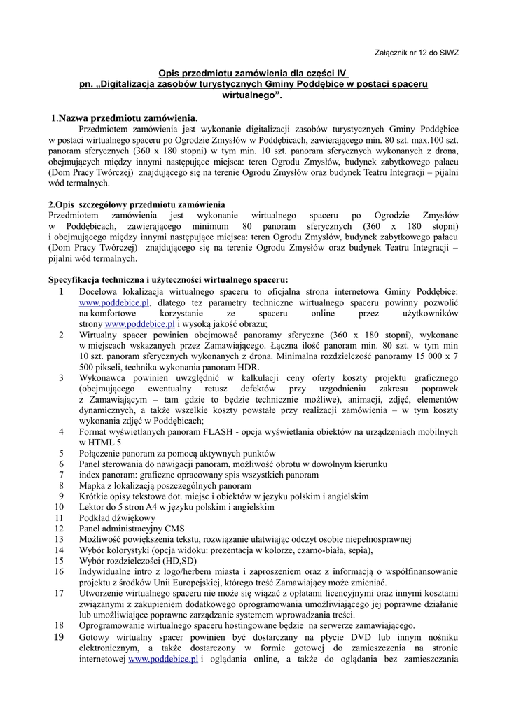 Załącznik nr 12 do SIWZ Opis przedmiotu zamówienia dla części IV pn. „Digitalizacja zasobów turystycznych Gminy Poddębice w postaci spaceru wirtualnego”. 1.Nazwa przedmiotu zamówienia. Przedmiotem zamówienia jest wykonanie digitalizacji zasobów turystycznych Gminy Poddębice w postaci wirtualnego spaceru po Ogrodzie Zmysłów w Poddębicach, zawierającego min. 80 szt. max.100 szt. panoram sferycznych (360 x 180 stopni) w tym min. 10 szt. panoram sferycznych wykonanych z drona, obejmujących między innymi następujące miejsca: teren Ogrodu Zmysłów, budynek zabytkowego pałacu (Dom Pracy Twórczej) znajdującego się na terenie Ogrodu Zmysłów oraz budynek Teatru Integracji – pijalni wód termalnych. 2.Opis szczegółowy przedmiotu zamówienia Przedmiotem zamówienia jest wykonanie wirtualnego spaceru po Ogrodzie Zmysłów w Poddębicach, zawierającego minimum 80 panoram sferycznych (360 x 180 stopni) i obejmującego między innymi następujące miejsca: teren Ogrodu Zmysłów, budynek zabytkowego pałacu (Dom Pracy Twórczej) znajdującego się na terenie Ogrodu Zmysłów oraz budynek Teatru Integracji – pijalni wód termalnych. Specyfikacja techniczna i użyteczności wirtualnego spaceru: 1 Docelowa lokalizacja wirtualnego spaceru to oficjalna strona internetowa Gminy Poddębice: www.poddebice.pl, dlatego tez parametry techniczne wirtualnego spaceru powinny pozwolić na komfortowe korzystanie ze spaceru online przez użytkowników strony www.poddebice.pl i wysoką jakość obrazu; 2 Wirtualny spacer powinien obejmować panoramy sferyczne (360 x 180 stopni), wykonane w miejscach wskazanych przez Zamawiającego. Łączna ilość panoram min. 80 szt. w tym min 10 szt. panoram sferycznych wykonanych z drona. Minimalna rozdzielczość panoramy 15 000 x 7 500 pikseli, technika wykonania panoram HDR. 3 Wykonawca powinien uwzględnić w kalkulacji ceny oferty koszty projektu graficznego (obejmującego ewentualny retusz defektów przy uzgodnieniu zakresu poprawek z Zamawiającym – tam gdzie to będzie technicznie możliwe), animacji, zdjęć, elementów dynamicznych, a także wszelkie koszty powstałe przy realizacji zamówienia – w tym koszty wykonania zdjęć w Poddębicach; 4 Format wyświetlanych panoram FLASH - opcja wyświetlania obiektów na urządzeniach mobilnych w HTML 5 5 Połączenie panoram za pomocą aktywnych punktów 6 Panel sterowania do nawigacji panoram, możliwość obrotu w dowolnym kierunku 7 index panoram: graficzne opracowany spis wszystkich panoram 8 Mapka z lokalizacją poszczególnych panoram 9 Krótkie opisy tekstowe dot. miejsc i obiektów w języku polskim i angielskim 10 Lektor do 5 stron A4 w języku polskim i angielskim 11 Podkład dźwiękowy 12 Panel administracyjny CMS 13 Możliwość powiększenia tekstu, rozwiązanie ułatwiając odczyt osobie niepełnosprawnej 14 Wybór kolorystyki (opcja widoku: prezentacja w kolorze, czarno-biała, sepia), 15 Wybór rozdzielczości (HD,SD) 16 Indywidualne intro z logo/herbem miasta i zaproszeniem oraz z informacją o współfinansowanie projektu z środków Unii Europejskiej, którego treść Zamawiający może zmieniać. 17 Utworzenie wirtualnego spaceru nie może się wiązać z opłatami licencyjnymi oraz innymi kosztami związanymi z zakupieniem dodatkowego oprogramowania umożliwiającego jej poprawne działanie lub umożliwiające poprawne zarządzanie systemem wprowadzania treści. 18 Oprogramowanie wirtualnego spaceru hostingowane będzie na serwerze zamawiającego. 19 Gotowy wirtualny spacer powinien być dostarczany na płycie DVD lub innym nośniku elektronicznym, a także dostarczony w formie gotowej do zamieszczenia na stronie internetowej www.poddebice.pl i oglądania online, a także do oglądania bez zamieszczania 20 go na stronie internetowej w trybie offline bez potrzeby instalacji w systemie Windows i Mac . Wykonawca powinien dostarczyć także Zamawiającemu wszystkie zdjęcia i materiały zrobione na potrzeby wirtualnego spaceru na płycie DVD lub innym nośniku elektronicznym i zamieścić spacer wirtualny na stronie www.poddebice.pl. Wykonawca przekaże Zamawiającemu prawa autorskie do powstałych materiałów do dowolnego wykorzystania. Wykonawca w swojej ofercie winien ująć koszt czynności, robót, lub innego rodzaju detali nieobjętych niniejszą dokumentacją przetargową, jeśli są one niezbędne z punktu widzenia poprawności wykonania niniejszego zamówienia i celu jakiemu mają służyć. Wymagania Zamawiającego w zakresie zatrudnienia pracowników przy realizacji przedmiotu zamówienia. Wykonawca oraz jego podwykonawcy w ramach realizacji niniejszego zamówienia obejmującego usługi fotograficzne są zobowiązani do zatrudnienia pracowników na podstawie umowy o pracę, których wykonywanie pracy zostało ustalone w sposób zgodny z art. 22 §1 ustawy z dnia 26 czerwca 1974r. Kodeks pracy. Sposób dokumentowania zatrudnienia osób przez Wykonawcę oraz jego dalszych podwykonawców nastąpi poprzez złożenie stosownego wykazy osób zatrudnionych na podstawie umowy o pracę (imię i nazwisko, stanowisko pracy, zakres obowiązków) przy realizacji zamówienia w terminie 10 dni od dnia podpisania umowy. W przypadku przedsiębiorców będących osobami fizycznymi dopuszcza się, aby osobiście wykonywali czynności związane z realizacją zamówienia w ust.1. Każda zmiana wskazanych w wykazie pracowników zobowiązuje Wykonawcę oraz jego Podwykonawców do poinformowania Zamawiającego na piśmie. Zamawiający ma prawo w każdym momencie trwania realizacji zamówienia przeprowadzić kon trolę na miejscu wykonywania zamówienia w celu weryfikacji, czy osoby wykonujące czynności są osobami wskazanymi przez Wykonawcę lub Podwykonawcę zatrudnionymi na podstawie umowy o pracę. Oso ba kontrolowana powinna wylegitymować się dokumentem stwierdzającym jej tożsamość. W przypadku braku takiego dokumentu lub stwierdzenia niezgodności osób wykonujących us