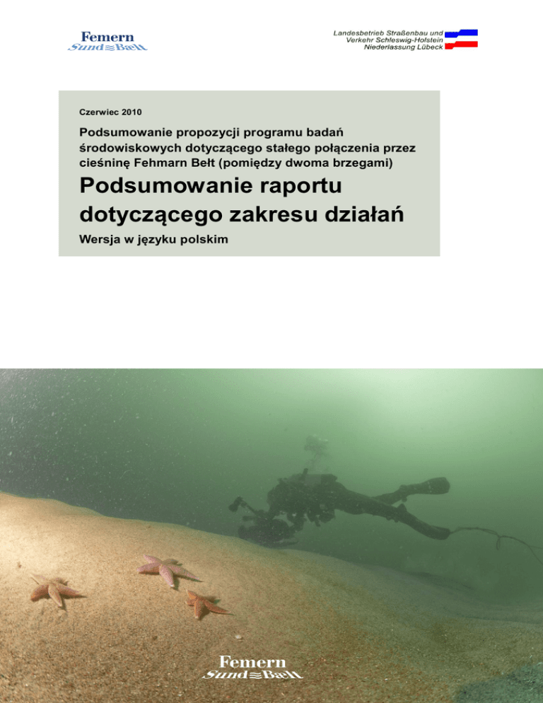 Czerwiec 2010 Podsumowanie propozycji programu badań środowiskowych dotyczącego stałego połączenia przez cieśninę Fehmarn Bełt (pomiędzy dwoma brzegami) Podsumowanie raportu dotyczącego zakresu działań Wersja w języku polskim Czerwiec 2010 Podsumowanie propozycji programu badań środowiskowych dotyczącego stałego połączenia przez cieśninę Fehmarn Bełt (pomiędzy dwoma brzegami) Podsumowanie raportu dotyczącego zakresu działań Angielski tekst Podsumowania raportu dotyczącego zakresu działań został przetłumaczony na dziewięć języków krajów nadbałtyckich. W razie sprzeczności któregokolwiek z tłumaczeń z tekstem angielskim, tekst angielski ma charakter rozstrzygający. Tłumaczenia mają jedynie charakter informacyjny. Opracowanie: Anders Højgård Petersen (redaktor) Weryfikacja: Susanne Koss Zatwierdzenie: Anders Jensen Femern A/S – czerwiec 2010 Ilustracja i zdjecie: ISBN 978-87-92416-11-7 Femern A/S Podsumowanie raportu dotyczącego zakresu działań W niniejszym raporcie dotyczącym zakresu działań opisano rodzaj i zakres badań warunków środowiskowych, które należy przeprowadzić w związku z opracowaniem projektu stałego połączenia przez cieśninę Fehmarn Bełt. 1. Wstęp Dnia 3 września 2008 r. Dania i Niemcy podpisały traktat dotyczący budowy stałego połączenia przez cieśninę Fehmarn Bełt. Traktat został ratyfikowany przez obydwa kraje w 2009. Dania jest odpowiedzialna za planowanie, projektowanie, finansowanie, budowę i eksploatację połączenia Fehmarnbelt oraz poniesie koszty związane z tym sfinansowanym przez użytkowników połączeniem. Dania będzie jedynym właścicielem i operatorem tego stałego połączenia. Dania i Niemcy zaakceptują projekt osobno, w ramach swoich jurysdykcji. Stałe połączenie przez cieśninę Fehmarnbelt jest projektem o wysokim priorytecie, związanym z rozbudową transeuropejskiej sieci transportowej. Komisja Europejska ogłosiła już przyznanie środków unijnych — ponad 2,5 mld DKK w latach 2007–2013 — w ramach programu sieci transeuropejskich (TEN). Celem jest otwarcie stałego połączenia dla ruchu w 2018 r. W kwietniu 2009 r. Minister Transportu Danii powierzył będącej w 100% własnością państwa spółce Femern A/S odpowiedzialność za opracowanie projektu połączenia pomiędzy dwoma brzegami. Skutki projektu dla środowiska zostaną ocenione zgodnie z postanowieniami traktatu i przepisami krajowymi. W ocenie zostaną uwzględnione również przepisy międzynarodowe i mające zastosowanie praktyki. W celu uzyskania akceptacji dla stałego połączenia przez cieśninę Fehmarn Bełt w ocenie zostaną wzięte pod uwagę między innymi transgraniczne skutki projektu. Minister Transportu Danii zlecił spółce Femern A/S wykonanie badań środowiskowych, które pozwolą na określenie, opisanie i ocenę oddziaływania projektu na środowisko. Wyniki badań zostaną opisane w raporcie oceny oddziaływania na środowisko ( OOŚ), który zostanie sporządzony przez spółkę Femern A/S. W Niemczech plany ważnych projektów drogowych i kolejowych podlegają akceptacji obejmującej zatwierdzenie planów technicznych projektu, lokalizacji projektu oraz wpływu na wszystkie sektory i zainteresowane strony (obejmującego także skutki dla środowiska), zarówno podczas etapu budowy, jak i eksploatacji. Dlatego też raport OOŚ jest w Niemczech składnikiem wniosku projektowego, który zostanie oceniony przez właściwy organ. Podstawą oceny oddziaływania na środowisko będzie przeprowadzenie procesu określenia zakresu działań. Celem tego procesu jest wybranie metod, rodzaju i zakresu badań i ocen Strona 3/10 Podsumowanie raportu dotyczącego zakresu działań środowiskowych. W obecnym raporcie dotyczącym zakresu działań spółka Femern A/S przedstawia propozycję programu badań w celu jej akceptacji przez właściwe organy w Danii i w Niemczech. Zgodnie z konwencją z Espoo państwa z obszaru Morza Bałtyckiego zostaną również zaproszone do udziału w konsultacjach. W Danii za konsultacje odpowiada Ministerstwo Środowiska za pośrednictwem Agencji Planowania Przestrzennego i Środowiskowego. Raport dotyczący zakresu działań podlega jednoczesnym konsultacjom w Danii, Niemczech i pozostałych krajach nadbałtyckich. Konsultacje będą trwać 11 tygodni: rozpoczną się 21.06.2010 r., a zakończą 06.09.2010 r. Po zakończeniu konsultacji w Danii Minister Transportu w porozumieniu z Ministrem Środowiska sporządzi memorandum z konsultacji prezentujące opinie na temat odpowiedzi otrzymanych w trakcie konsultacji. Raport dotyczący zakresu działań oraz memorandum z konsultacji stanowią ostateczną podstawę programu badań środowiskowych, który ma zostać wykonany przez spółkę Femern A/S w związku z projektem. Wyniki badań środowiskowych zostaną przedstawione w raporcie OOŚ, który powinien zostać sporządzony po konsultacjach, przed końcem 2011 r. Po zakończeniu konsultacji Minister Transportu w porozumieniu z Ministrem Środowiska sporządzi memorandum z konsultacji prezentujące opinie na temat odpowiedzi otrzymanych w trakcie konsultacji. Następnie zostanie opublikowany raport końcowy OOŚ. Raport OOŚ zostanie dołączony jako element propozycji projektu budowy w Danii. W Niemczech raport OOŚ zostanie włączony do procesu akceptacji planu, który, jak to podano powyżej, jest niezbędny do uzyskania ogólnej akceptacji całego projektu. Rys. 1 Fehmarn Bełt i okolica Strona 4/10 Podsumowanie raportu dotyczącego zakresu działań Rys. 2 Fehmarn Bełt, Puttgarden i Rødbyhavn 2. Opis projektu Planowane jest zbudowanie stałego połączenia o długości 19 km przez cieśninę Fehmarnbelt pomiędzy miejscowościami Rodbyhavn (Lolland) i Puttgarden (Fehmarn). Połączenie będzie składać się z czteropasmowej autostrady i dwóch torów kolejowych. W studium wykonalności z 1999 r. określono kilka możliwych do realizacji modeli rozw