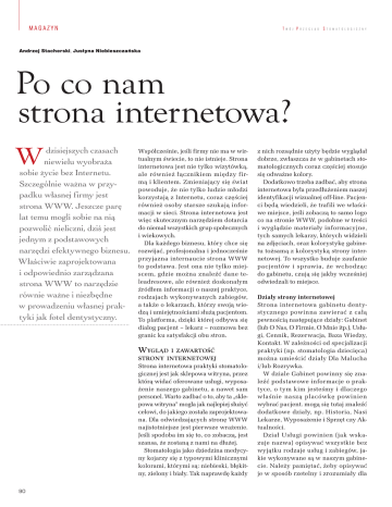 MAGAZYN T w ó j P r z e g l ą d S t o m a t o l o g i c z n y Andrzej Stacherski, Justyna Niebieszczańska Po co nam strona internetowa? W dzisiejszych czasach niewielu wyobraża sobie życie bez Internetu. Szczególnie ważna w przypadku własnej firmy jest strona WWW. Jeszcze parę lat temu mogli sobie na nią pozwolić nieliczni, dziś jest jednym z podstawowych narzędzi efektywnego biznesu. Właściwie zaprojektowana i odpowiednio zarządzana strona WWW to narzędzie równie ważne i niezbędne w prowadzeniu własnej praktyki jak fotel dentystyczny. Współcześnie, jeśli firmy nie ma w wirtualnym świecie, to nie istnieje. Strona internetowa jest nie tylko wizytówką, ale również łącznikiem między firmą i klientem. Zmieniający się świat powoduje, że nie tylko ludzie młodzi korzystają z Internetu, coraz częściej również osoby starsze szukają informacji w sieci. Strona internetowa jest więc skutecznym narzędziem dotarcia do niemal wszystkich grup społecznych i wiekowych. Dla każdego biznesu, który chce się rozwijać, profesjonalna i jednocześnie przyjazna internaucie strona WWW to podstawa. Jest ona nie tylko miejscem, gdzie można znaleźć dane teleadresowe, ale również doskonałym źródłem informacji o naszej praktyce, rodzajach wykonywanych zabiegów, a także o lekarzach, którzy swoją wiedzą i umiejętnościami służą pacjentom. To platforma, dzięki której odbywa się dialog pacjent – lekarz – rozmowa bez granic ku satysfakcji obu stron. Wygląd i zawartość strony internetowej Strona internetowa praktyki stomatologicznej jest jak sklepowa witryna, przez którą widać oferowane usługi, wyposażenie naszego gabinetu, a nawet sam personel. Warto zadbać o to, aby ta „sklepowa witryna” mogła jak najlepiej służyć celowi, do jakiego została zaprojektowana. Dla odwiedzających stronę WWW najistotniejsze jest pierwsze wrażenie. Jeśli spodoba im się to, co zobaczą, jest szansa, że zostaną z nami na dłużej. Stomatologia jako dziedzina medycyny kojarzy się z typowymi klinicznymi kolorami, którymi są: niebieski, błękitny, zielony i biały. Tak naprawdę każdy 90 z nich rozsądnie użyty będzie wyglądał dobrze, zwłaszcza że w gabinetach stomatologicznych coraz częściej stosuje się odważne kolory. Dodatkowo trzeba zadbać, aby strona internetowa była przedłużeniem naszej identyfikacji wizualnej off-line. Pacjenci będą wiedzieli, że trafili we właściwe miejsce, jeśli zobaczą to samo logo co na stronie WWW, podobne w treści i wyglądzie materiały informacyjne, tych samych lekarzy, których widzieli na zdjęciach, oraz kolorystykę gabinetu tożsamą z kolorystyką strony internetowej. To wszystko buduje zaufanie pacjentów i sprawia, że wchodząc do gabinetu, czują się jakby wcześniej odwiedzali to miejsce. Działy strony internetowej Strona internetowa gabinetu dentystycznego powinna zawierać z całą pewnością następujące działy: Gabinet (lub O Nas, O Firmie, O Mnie itp.), Usługi, Cennik, Rezerwacja, Baza Wiedzy, Kontakt. W zależności od specjalizacji praktyki (np. stomatologia dziecięca) można umieścić działy Dla Malucha i/lub Rozrywka. W dziale Gabinet powinny się znaleźć podstawowe informacje o praktyce, o tym kim jesteśmy i dlaczego właśnie naszą placówkę powinien wybrać pacjent. mogą się tutaj znaleźć dodatkowe działy, np. Historia, Nasi Lekarze, Wyposażenie i Sprzęt czy Aktualności. Dział Usługi powinien (jak wskazuje nazwa) opisywać wszystkie bez wyjątku rodzaje usług i zabiegów, jakie wykonywane są w naszym gabinecie. Należy pamiętać, żeby opisywać je w sposób rzetelny i zrozumiały dla MAGAZYN 6/2010 na temat sposobu, w jaki działa nasza praktyka, rezerwacjach, sposobach pielęgnacji uzębienia oraz innych tematach, które nie pasują do pozostałych działów naszej strony internetowej. Kontakt to dość oczywista sekcja na stronie WWW, podająca pełne dane kontaktowe, lokalizację i sposoby dojazdu z różnych części miasta (można np. umieścić odnośniki do rozkładu jazdy komunikacji miejskiej). Powinna być również opcja umożliwiająca wysłanie wiadomości przy pomocy formularza kontaktowego. Mam stronę co dalej? internetową, Strona internetowa powinna działać nieprzerwanie 24 godziny na dobę, przez cały rok. Dotyczy to nie tylko jej stanu technicznego, ale również zawartości. Wymaga uwagi i dbałości, które zapewniają jej „świeżość” i atrakcyjność dla pacjentów internautów. Dzisiaj większość stron internetowych jest tworzona na bazie systemów do samodzielnego zarządzania treścią stron internetowych (ang. CMS, Content Management System). Oczywiście strony tzw. statyczne są jeszcze dość częste. Strona oparta o system CMS jest nieco droższa w budowie, ale koszty zwracają się dość szybko. Jeśli pomyślimy o kosztach i czasie, jaki należy poświęcić na przygotowanie/aktualizację treści, wysłanie ich do naszego projektanta, oczekiwanie na realizację i zatwierdzenie zmian, to okaże się, że nieco droższa strona oparta na CMS jest w rzeczywistości tańsza w eksploatacji i zarządzaniu niż tzw. statyczna. Dzięki systemowi CMS możemy samodzielnie po pracy, w zaciszu własnego domu zalogować się na naszą stronę WWW i dodawać nowe treści, zdjęcia, strony, sprawdzać statystyki odwiedzin, a nawet samodzielnie zmieniać projekt graficzny (jeśli tylko mamy na to ochotę). Korzystanie z tego systemu jest w większości przypadków dość intuicyjne i wcale nie trudniejsze niż pisanie wiadomości e-mail. Odpowiednie przygotowanie do korzystania nie zajmie nam więcej niż godzinę i jest w zupełności wystarczające. terstock fot. Shut pacjenta. Powinniśmy poświęcić nieco czasu, aby przedstawić wszystkie zabiegi, które wykonujemy, i najlepiej wzbogacić opisy krótkim filmem wideo. Dobrze zorientowany pacjent jest znacznie bardziej świadomy procedur i sposobów rozwiązywani