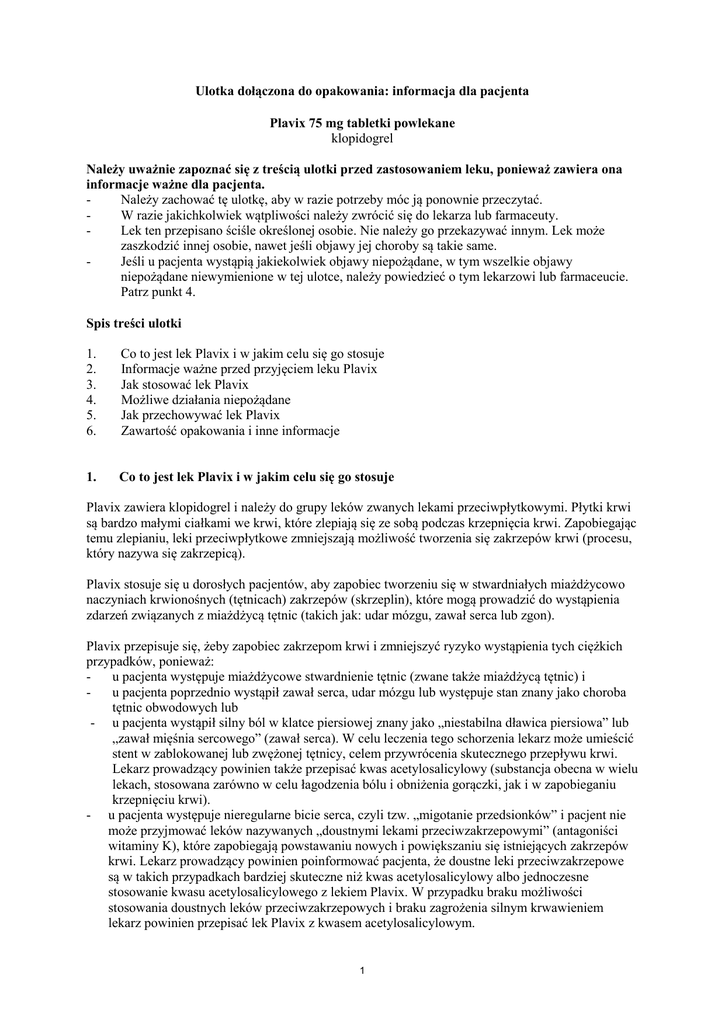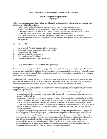 Ulotka dołączona do opakowania: informacja dla pacjenta Plavix 75 mg tabletki powlekane klopidogrel Należy uważnie zapoznać się z treścią ulotki przed zastosowaniem leku, ponieważ zawiera ona informacje ważne dla pacjenta. Należy zachować tę ulotkę, aby w razie potrzeby móc ją ponownie przeczytać. W razie jakichkolwiek wątpliwości należy zwrócić się do lekarza lub farmaceuty. Lek ten przepisano ściśle określonej osobie. Nie należy go przekazywać innym. Lek może zaszkodzić innej osobie, nawet jeśli objawy jej choroby są takie same. Jeśli u pacjenta wystąpią jakiekolwiek objawy niepożądane, w tym wszelkie objawy niepożądane niewymienione w tej ulotce, należy powiedzieć o tym lekarzowi lub farmaceucie. Patrz punkt 4. Spis treści ulotki 1. 2. 3. 4. 5. 6. Co to jest lek Plavix i w jakim celu się go stosuje Informacje ważne przed przyjęciem leku Plavix Jak stosować lek Plavix Możliwe działania niepożądane Jak przechowywać lek Plavix Zawartość opakowania i inne informacje 1. Co to jest lek Plavix i w jakim celu się go stosuje Plavix zawiera klopidogrel i należy do grupy leków zwanych lekami przeciwpłytkowymi. Płytki krwi są bardzo małymi ciałkami we krwi, które zlepiają się ze sobą podczas krzepnięcia krwi. Zapobiegając temu zlepianiu, leki przeciwpłytkowe zmniejszają możliwość tworzenia się zakrzepów krwi (procesu, który nazywa się zakrzepicą). Plavix stosuje się u dorosłych pacjentów, aby zapobiec tworzeniu się w stwardniałych miażdżycowo naczyniach krwionośnych (tętnicach) zakrzepów (skrzeplin), które mogą prowadzić do wystąpienia zdarzeń związanych z miażdżycą tętnic (takich jak: udar mózgu, zawał serca lub zgon). Plavix przepisuje się, żeby zapobiec zakrzepom krwi i zmniejszyć ryzyko wystąpienia tych ciężkich przypadków, ponieważ: u pacjenta występuje miażdżycowe stwardnienie tętnic (zwane także miażdżycą tętnic) i u pacjenta poprzednio wystąpił zawał serca, udar mózgu lub występuje stan znany jako choroba tętnic obwodowych lub - u pacjenta wystąpił silny ból w klatce piersiowej znany jako „niestabilna dławica piersiowa” lub „zawał mięśnia sercowego” (zawał serca). W celu leczenia tego schorzenia lekarz może umieścić stent w zablokowanej lub zwężonej tętnicy, celem przywrócenia skutecznego przepływu krwi. Lekarz prowadzący powinien także przepisać kwas acetylosalicylowy (substancja obecna w wielu lekach, stosowana zarówno w celu łagodzenia bólu i obniżenia gorączki, jak i w zapobieganiu krzepnięciu krwi). - u pacjenta występuje nieregularne bicie serca, czyli tzw. „migotanie przedsionków” i pacjent nie może przyjmować leków nazywanych „doustnymi lekami przeciwzakrzepowymi” (antagoniści witaminy K), które zapobiegają powstawaniu nowych i powiększaniu się istniejących zakrzepów krwi. Lekarz prowadzący powinien poinformować pacjenta, że doustne leki przeciwzakrzepowe są w takich przypadkach bardziej skuteczne niż kwas acetylosalicylowy albo jednoczesne stosowanie kwasu acetylosalicylowego z lekiem Plavix. W przypadku braku możliwości stosowania doustnych leków przeciwzakrzepowych i braku zagrożenia silnym krwawieniem lekarz powinien przepisać lek Plavix z kwasem acetylosalicylowym. 1 2. Informacje ważne przed przyjęciem leku Plavix Kiedy nie przyjmować leku Plavix jeśli u pacjenta stwierdzono uczulenie (nadwrażliwość) na klopidogrel lub którykolwiek z pozostałych składników tego leku (wymienionych w punkcie 6), jeśli u pacjenta występuje stan chorobowy, który obecnie powoduje krwawienie, taki jak: wrzód żołądka lub krwawienie wewnątrz mózgu, jeśli u pacjenta występuje ciężka choroba wątroby. Jeśli pacjent uważa, że dotyczy go którekolwiek z tych zaburzeń lub ma jakiekolwiek inne wątpliwości, powinien skonsultować się z lekarzem prowadzącym, zanim przyjmie lek Plavix. Ostrzeżenia i środki ostrożności Jeśli którakolwiek z sytuacji wymienionych poniżej dotyczy pacjenta, to przed przyjęciem leku Plavix powinien on poinformować o tym lekarza prowadzącego: jeśli występuje ryzyko krwawienia, takie jak: - stan chorobowy, który powoduje ryzyko wewnętrznego krwawienia (np. wrzód żołądka) zaburzenie krwi usposabiające do wewnętrznego krwawienia (krwawienie wewnątrz tkanek, narządów lub stawów ciała) - ostatnio doznany ciężki uraz - ostatnio przebyty zabieg chirurgiczny (włącznie z zabiegiem stomatologicznym) - planowany w następnych siedmiu dniach zabieg chirurgiczny (włącznie z zabiegiem stomatologicznym) jeśli u pacjenta stwierdzono zakrzep w tętnicy mózgu (udar niedokrwienny), który wystąpił w ciągu ostatnich siedmiu dni jeśli u pacjenta występuje choroba nerek lub wątroby jeśli pacjent miał w przeszłości alergię lub uczulenie na którykolwiek z leków stosowanych w leczeniu tej choroby. Podczas stosowania leku Plavix: Należy poinformować lekarza, jeśli u pacjenta planowany jest zabieg chirurgiczny (w tym stomatologiczny). Należy również niezwłocznie poinformować lekarza o występowaniu schorzenia (zwanego zakrzepową plamicą małopłytkową – ang. TTP – Thrombotic Thrombocytopenic Purpura), objawiającego się gorączką i podskórnymi wybroczynami krwawymi, o wyglądzie czerwonych, punktowych plamek występujących z lub bez nie dającego się wyjaśnić uczucia skrajnego zmęczenia, stanem dezorientacji, zażółceniem skóry lub oczu (żółtaczka) (patrz punkt 4 „Możliwe działania niepożądane”). W przypadku skaleczenia lub zranienia, czas jaki upłynie zanim krwawienie ustanie, może być nieco dłuższy niż zwykle. Jest to związane ze sposobem działania leku, ponieważ zapobiega powstawaniu zakrzepów krwi. Nie sprawia to zwykle kłopotów przy niewielkich skaleczeniach i zranieniach np. skaleczenia w czasie golenia. Tym niemniej, w przypadku wystąpienia krwawienia, należy niezwłocznie skontaktować się z
