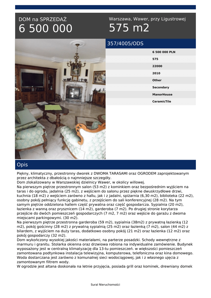 DOM na SPRZEDAŻ 6 500 000 Warszawa, Wawer, przy Ligustrowej 575 m2 357/4005/ODS 6 500 000 PLN 575 22000 2010 Other Secondary ManorHouse CeramicTile Opis Piękny, klimatyczny, przestronny dworek z DWOMA TARASAMI oraz OGRODEM zaprojektowanym przez architekta z dbałością o najmniejsze szczegóły. Dom zlokalizowany w Warszawskiej dzielnicy Wawer, w okolicy willowej. Na pierwszym piętrze przestronnym salon (53 m2) z kominkiem oraz bezpośrednim wyjściem na taras i do ogrodu, jadalnia (25 m2), z wejściem do salonu przez piękne dwuskrzydłowe drzwi, kuchnia (18 m2) z wejściem zarówno z hallu, jak i z jadalni, spiżarnia (6,30 m2), biblioteka (22 m2), osobny pokój pełniący funkcję gabinetu, z przejściem do sali konferencyjnej (28 m2). Na tym samym piętrze oddzielona hallem część prywatna oraz część gospodarcza. Sypialnia (20 m2), łazienka z wanną oraz prysznicem (14 m2), garderoba (7 m2). Po drugiej stronie korytarza przejście do dwóch pomieszczeń gospodarczych (7 m2, 7 m2) oraz wejście do garażu z dwoma miejscami parkingowymi. (30 m2). Na pierwszym piętrze przestronna garderoba (59 m2), sypialnia (38m2) z prywatną łazienką (12 m2), pokój gościnny (28 m2) z prywatną sypialnią (25 m2) oraz łazienką (7 m2), salon (44 m2) z bilardem, z wyjściem na duży taras, dodatkowo osobny pokój (21 m2) oraz łazienka (12 m2) oraz pokój gospodarczy (32 m2). Dom wykończony wysokiej jakości materiałami, na parterze posadzki. Schody wewnętrzne z marmuru i granitu. Stolarka okienna oraz drzwiowa robiona na indywidualne zamówienie. Budynek wyposażony jest w centralną klimatyzację dla 13-tu pomieszczeń. w większości pomieszczeń zamontowana podtynkowa instalacja telewizyjna, komputerowa, telefoniczna oraz kina domowego. Woda dostarczana jest zarówno z komunalnej sieci wodociągowej, jak i z własnego ujęcia z zamontowanym filtrem wody. W ogrodzie jest altana doskonała na letnie przyjęcia, posiada grill oraz kominek, drewniany domek Sural Nieruchomości gospodarczy, pomieszczenie na drewno do kominka oraz specjalne pomieszczenie dla ogrodnika. Przy altanie kaskada wodna. W ogrodzie zamontowano automatyczny system zraszania i nawadniania. Obiekt jest wyposażony w całości wewnątrz i na zewnątrz w urządzenia zabezpieczające, kamery, czujniki, urządzenia antywłamaniowe. Brama wjazdowa podgrzewana i automatyczna. Doskonała lokalizacja, dojazd do Centrum zajmuje 8 min. Bardzo spokojna, zielona okolica, w pobliżu Kanał Wawerski, jezioro Żabie. Biuro Sural tel. 536223377 tel. 224066750 email: [email protected] Sural Nieruchomości Powered by TCPDF (www.tcpdf.org)