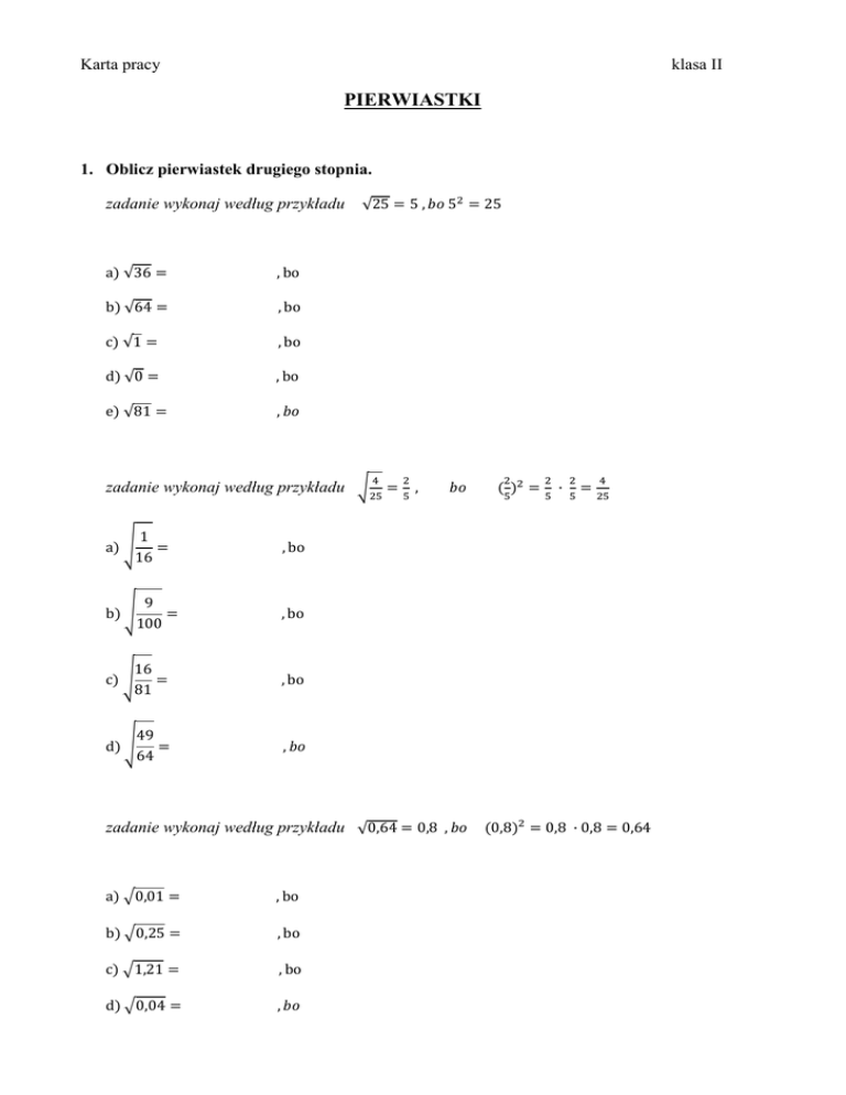 Karta pracy klasa II PIERWIASTKI 1. Oblicz pierwiastek drugiego stopnia. zadanie wykonaj według przykładu zadanie wykonaj według przykładu zadanie wykonaj według przykładu 2. Oblicz pierwiastek trzeciego stopnia. zadanie wykonaj według przykładu zwróć uwagę, że pierwiastki trzeciego stopnia można liczyć również z liczb ujemnych 3. Spróbuj obliczyć jeszcze pierwiastki. zadanie wykonaj według przykładu 4. Oblicz Pamiętaj, że : a) b) c) d) 5. Wykonaj działania na pierwiastkach zadanie wykonaj według przykładu: a) b) c) d) 81 : 49 e) 2 3 2 f) g) h) i) j) 6. Oblicz pamiętając o kolejności działań na liczbach: a) b) c) d) 7. Wyłącz czynnik przed znak pierwiastka zadanie wykonaj według przykładu: Zauważ, że : Zauważ, że : 50 5 5 2 25 2 24 2 2 2 3 8 3 a) b) c) d) = e) f) g) h) 8. Włącz czynnik pod znak pierwiastka zadanie wykonaj według przykładu: a) b) c) d) e) f) 33 10 Opracowała Anna Dziadkowiec- Plewko