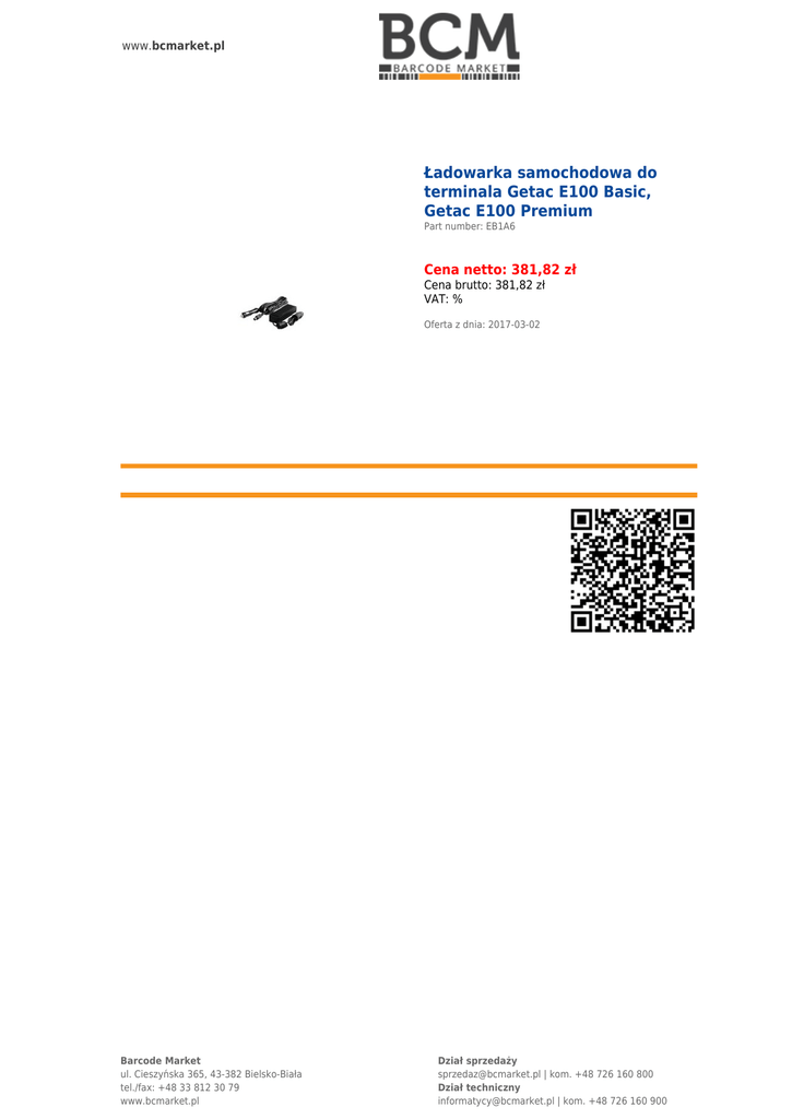 www.bcmarket.pl Ładowarka samochodowa do terminala Getac E100 Basic, Getac E100 Premium Part number: EB1A6 Cena netto: 381,82 zł Cena brutto: 381,82 zł VAT: % Oferta z dnia: 2017-03-02 Barcode Market ul. Cieszyńska 365, 43-382 Bielsko-Biała tel./fax: +48 33 812 30 79 www.bcmarket.pl Dział sprzedaży [email protected] | kom. +48 726 160 800 Dział techniczny [email protected] | kom. +48 726 160 900