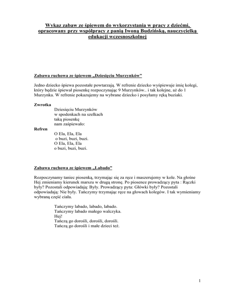 Wykaz zabaw ze śpiewem do wykorzystania w pracy z dziećmi, opracowany przy współpracy z panią Iwoną Budzińską, nauczycielką edukacji wczesnoszkolnej Zabawa ruchowa ze śpiewem „Dziesięciu Murzynków” Jedno dziecko śpiewa pozostałe powtarzają. W refrenie dziecko wyśpiewuje imię kolegi, który będzie śpiewał piosenkę rozpoczynając 9 Murzynków.. i tak kolejne, aŜ do 1 Murzynka. W refrenie pokazujemy na wybrane dziecko i posyłamy ręką buziaki. Zwrotka Dziesięciu Murzynków w spodenkach na szelkach taką piosenkę nam zaśpiewało: Refren O Ela, Ela, Ela o buzi, buzi, buzi. O Ela, Ela, Ela o buzi, buzi, buzi. Zabawa ruchowa ze śpiewem „Labado” Rozpoczynamy taniec piosenką, trzymając się za ręce i maszerujemy w kole. Na głośne Hej zmieniamy kierunek marszu w drugą stronę. Po piosence prowadzący pyta : Rączki były? Pozostali odpowiadają: Były. Prowadzący pyta: Główki były? Pozostali odpowiadają: Nie były. Tańczymy trzymając ręce na głowach kolegów. I tak wymieniamy wybraną część ciała. Tańczymy labado, labado, labado. Tańczymy labado małego walczyka. Hej! Tańczą go dorośli, dorośli, dorośli. Tańczą go dorośli i małe dzieci teŜ. 1 Zabawa „Owad w klatce” owad Na duŜej planszy narysowana siatka 3/3 lub 5/5, a w środku narysowany owad. Uczestnicy zgodnie z poleceniami: góra, dół, prawo, lewo wodzą oczami. Kiedy owad opuści klatkę naleŜy klasnąć w dłonie, tupnąć lub wstać(zaleŜy od inwencji prowadzącego) . Zabawa ruchowa na zapamiętanie kolejności i nazw miesięcy Wersja I Informujemy dzieci, Ŝe będziemy się bawić w mysią parę. KaŜde dziecko powinno pamiętać, w którym miesiącu się urodziło. Robimy koło i śpiewamy piosenkę na nazwę miesiąca. Dziecko idzie do środka (moŜe być kilkoro). Tańczy samo .W parze trzyma kolegę chwytem skrzyŜnym, tańczą cwałem bocznym na słowa mysia para. Kto się w styczniu się urodził niech wejdzie do koła ła, ła Niech parę sobie znajdzie I z nią zatańczy do społa Mysia para, mysia para, mysia para u-ha, ha Mysia para, mysia para, mysia para u-ha, ha Uczestnicy wyśpiewują w kolejności wszystkie miesiące. Wersja II Informujemy dzieci, Ŝe będziemy się bawić w mistrza wiatru. KaŜde dziecko powinno wiedzieć, w którym miesiącu się urodziło. Robimy koło i śpiewamy piosenkę na nazwę swego miesiąca dziecko idzie do środka (moŜe być kilkoro) bierze kartkę ułoŜoną na środku na krzesełku i dmucha w nią z całej siły trzymając ją w poprzek za rogi – kartka A3. I tak długo śpiewamy aŜ dośpiewamy do grudnia. Kto w styczniu się urodził ma wstać, ma wstać, ma wstać. Niech weźmie kartkę w rękę swą I dmucha w nią raz dwa. I dmucha w nią raz dwa. 2 Zabawa paluszkami Dzieci i siedzą przy stolikach i uderzają najpierw jednym paluszkiem, potem drugim, aŜ do 10. Później pomaga łokieć i pomaga ta część ciała, którą wymienimy. Bawiły, bawiły się dzieci paluszkami Jak jeden nie moŜe, to drugi mu pomoŜe (Jak łokieć nie moŜe to drugi mu pomoŜe, Jak łokieć nie moŜe to głowa mu pomoŜe itd.) Zabawa ruchowa „Ugi-bugi” Tańczymy w kole i wykonujemy ruchy wg instrukcji w piosence. Wymieniamy po kolei części ciała. Do przodu prawą rękę daj, do tyłu prawą rękę daj , do przodu prawa rękę daj i potrząśnij nia. Bo przy ugi-ugi-bugi trzeba ładnie kręcić się no i klaskać w dłonie swe raz, dwa, trzy Ugi-bugi ole Ugi-bugi ole Zabawa integracyjna Uczestnicy siedzą w kole. Jedziemy na wycieczkę w góry i kaŜdy weźmie jeden przedmiot, ale taki, który rozpoczyna się taką samą głoską co imię. Zabawę rozpoczynamy i kończymy na pierwszej osobie po lewej ręce prowadzącego. Przykład: Agatka mówi- Agatka agrafka Zosia mówi- Agatka agrafka, Zosia złoto Ania mówi – Agatka agrafka, Zosia złoto, Ania aparat Zabawa „Lewa-prawa Dziecko przynosi ulubioną maskotkę, sadza ją sobie na kolana tyłem do siebie. Polecenie: NałóŜ na swoją prawą rękę frotkę czerwoną i misiowi teŜ załóŜ. Wskazujemy róŜne części ciała. Polecenie: WskaŜ swoje prawe ucho, teraz prawe ucho misia. Następnie dziecko maskotkę ustawia przodem do siebie i powtarzamy czynności. Zabawa ruchowa przy piosence „Pingwinki” Ach, jak przyjemnie i jak wesoło w pingwinka bawić się, się. Raz nóŜka prawa, raz nóŜka lewa. Do przodu, do tyłu i raz, dwa, trzy 3 Zabawy z wykorzystaniem róŜnych przedmiotów- gazety „Rycerze” Szabla – z gazety zwijamy rulon od rogu bardzo ciasna Hełm – czapka wykonana techniką orgiami Nauka walki: W prawą rękę szablę uderzamy cztery razy na zewnątrz, teraz cztery razy wewnątrz. To samo trzymając szablę w lewej ręce. Szablę chowamy do pochwy z tyłu prawą ręką, a teraz lewą. Wskakujemy na konia – szablę trzymamy za końce i przeskakujemy. Szablę moŜemy wykorzystać do układania z niej róŜnych figur geometrycznych. Zabawa z wykorzystaniem balona i wytłaczanek od jajek „Badminton” Paletki to wytłaczanki, balon piłeczka i odbijamy raz prawą, raz lewą, z dołu, z góry. Dodawanie, odejmowanie, mnoŜenie z nietypowymi przyrządami Centymetr i klamerka Przypnij klamerkę na 12, a teraz dodaj 6, zaznacz drugą klamerką ile ci wyszło. Jesteś na liczbie 18 odejmij 9, zaznacz, gdzie się znalazłeś. Zapisz działanie Klamerki Przyczepiamy dziecku do prawej ręki ubrania klamerkę i prosimy aby ją odpiął. Postępujemy tak kilkakrotnie nazywając kolory klamerek. Zmiana dziecko nam przyczepia klamerki wg instrukcji. Następnie moŜemy przyczepić do rękawa lewego trzy i zapytać ile przyczepiono, do rękawa prawego przyczepiamy trzy ile przyczepiona, a ile razem (kolory, dodawanie, odejmowanie, prawa, lewa) Klamerki i wycięte z brystolu róŜne figury geometryczne Najpierw pokazujemy wyciętą figurę. Pytamy, co to za figura, ile ma boków. Następnie prosimy o przypięcie np. trzech klamerek do kaŜdego boku. Ile pr
