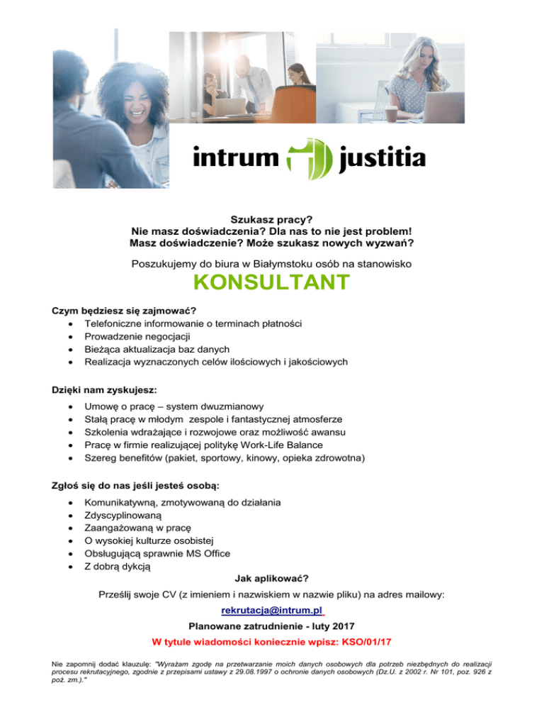 Szukasz pracy? Nie masz doświadczenia? Dla nas to nie jest problem! Masz doświadczenie? Może szukasz nowych wyzwań? Poszukujemy do biura w Białymstoku osób na stanowisko KONSULTANT Czym będziesz się zajmować? Telefoniczne informowanie o terminach płatności Prowadzenie negocjacji Bieżąca aktualizacja baz danych Realizacja wyznaczonych celów ilościowych i jakościowych Dzięki nam zyskujesz: Umowę o pracę – system dwuzmianowy Stałą pracę w młodym zespole i fantastycznej atmosferze Szkolenia wdrażające i rozwojowe oraz możliwość awansu Pracę w firmie realizującej politykę Work-Life Balance Szereg benefitów (pakiet, sportowy, kinowy, opieka zdrowotna) Zgłoś się do nas jeśli jesteś osobą: Komunikatywną, zmotywowaną do działania Zdyscyplinowaną Zaangażowaną w pracę O wysokiej kulturze osobistej Obsługującą sprawnie MS Office Z dobrą dykcją Jak aplikować? Prześlij swoje CV (z imieniem i nazwiskiem w nazwie pliku) na adres mailowy: [email protected] Planowane zatrudnienie - luty 2017 W tytule wiadomości koniecznie wpisz: KSO/01/17 Nie zapomnij dodać klauzulę: "Wyrażam zgodę na przetwarzanie moich danych osobowych dla potrzeb niezbędnych do realizacji procesu rekrutacyjnego, zgodnie z przepisami ustawy z 29.08.1997 o ochronie danych osobowych (Dz.U. z 2002 r. Nr 101, poz. 926 z poź. zm.)."