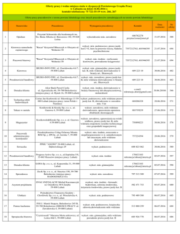 Oferty pracy i wolne miejsca stażu w dyspozycji Powiatowego Urzędu Pracy w Lubaniu na dzień 24.06.2016 r. kontakt telefoniczny 75 722-35-19 wew. 266, 267 Oferty pracy pracodawców z terenu powiatu lubańskiego oraz innych pracodawców zatrudniających na terenie powiatu lubańskiego Stanowisko 1 Opiekun Pracodawca Wymagania pracodawcy Kontakt Data ważności Nr oferty Przystań Schronisko dla bezdomnych im. Św. Brata Alberta ul. Baworowo 18f, 59-820 Leśna wykształcenie min. zawodowe 606782270 [email protected] 31.07.2016 308 wykszt. min. podstawowe, prawo jazdy "Rocar" Krzysztof Błaszczyk w Olszynie ul. kat.C+E, kurs na przewóz rzeczy, badania Wolności 30 psychtechniczne 7557212763, 601946395 21.07.2016 694 "Rocar" Krzysztof Błaszczyk w Olszynie ul. Wolności 30 wykszt. min. średnie - rozliczanie kierowców, prowadzenie księgowości 7557212763, 601946395 21.07.2016 694 BIURO-INFO FHU, ul. Zawidowska 4A/7, 59-800 Lubań wykszt. min. gimnazjalne, prawo jazdy kat. B, mile widziane doświadczenie w branży art.. Biurowych 609 223 10 30.06.2016 402 2 Kierowca samochodu ciężarowego 3 Pracowni biurowy 4 Kierowca 5 Przedstawiciel handlowy BIURO-INFO FHU, ul. Zawidowska 4A/7, wykszt. min. zawodowe, prawo jazdy kat. 59-800 Lubań B, mile widziane doświadczenie w branży art.. Biurowych 609 223 10 30.06.2016 402 6 Doradca klienta Alior Bank Paweł Cieśla wykszt. min. średnie, doświadczenie w ul. Zgorzelecka 46, 59-700 Bolesławiec branży finansowej lub ubezpieczeniowej, (miejsce pracy: ul. Rynek 16, 59-800 Lubań) niekaralność e-mail: [email protected] 30.06.20106 546 7 Technolog robót budowlanych Certus Jan Kozłowski ul. Sikorskiego 13 59- wykszt. podstawowe, mile widziane prawo 800 Lubań (miejsce pracy: teren Polski i jazdy kat. B, dświadczenie w zawodzie Niemiec) min. 5 lat 604206328 28.06.2016 571 8 Tokarz w metalu Kosikowski & Kresky Sp. z o. o., ul. Gazowa 4, 59-800 Lubań wykszt. zawodowe, mile widziane doświadczenie, uprawnienia operatora obrabiarek skrawających 885759239 27.06.2016 572 9 Magazynier Kosikowski&Kreski Sp. z o. o. ul. Gazowa 4 59-800 Lubań wykszt. zawodowe, uprawnienia na wózki widłowe, prawo jazdy kat. B, mile widziana znajomośc rysunku technicznego oraz gospodarki magazynowej 758890223 30.06.2016 574 10 Pracownik administracyjnykoordynator wykszt. min. średnie, orzeczenie o niepełnosprawności w st. umiarkowanym lub znacznym, mile widziane doświadczenie 757224394 28.06.2016 579 11 Szwaczka wykszt. podstawowe 608 023 062 30.06.2016 580 12 Przedstawiciel handlowy Progress Active Sp. z o. o., ul.Szpitalna 5/8, 35-065 Rzeszów (miejsce pracy: Lubań) wykszt. min. średnie 178633103 [email protected] 05.07.2016 597 13 Doradca klienta SAWA Sp. z o. o., ul. Kopeernika 31, 59-800 Lubań wykszt. min. gimnazjalne 178633103 [email protected] 05.07.2016 598 14 Sprzedawca Zecik Sp. z o. o., ul. Staszica 150, 59-700 Bolesławiec (miejsce pracy: RADOGOSZCZ 61) wykszt. min. zawodowe 797 513 589 07.07.2016 599 15 Asystent projektanta 502 471 753 05.07.2016 600 16 Ulotkarz Pośrednictwo Finansowe Kredyty Chwilówki Sp. z o. o., ul. Wrocławcka 4, 59-800 Lubań wykszt. min. podstawowe 795 489 588 06.07.2016 603 17 Pomoc kuchenna P.H.U. Marek Stopyra, Bolesławice 245 B, 59-700 Bolesławiec (MIEJSCE PRACY: ul. Zawidowska 4, 59-800 Lubań) wykszt. min. podstawowe, książeczka zdrowia,doświadczenie mile widziane 513 080 259 06.07.2016 604 18 Sprzątaczka biurowa 605 926 778 06.07.2016 606 Przedsiębiorstwo Usług Ochrony Mienia RIM Sp. j. ZPChr., ul. Izerska 7, 59-800 Lubań PPHU "ANOWI" 59-800 Lubań, ul. Dąbrowskiego 29 HVAC-INSTALACJE Michał Kaczmarczyk wyskszt. min. średnie - kierunek: ul. Osiedlowa 30/4 Zaręba budowlane, ochrona środowiska, 59-800 Lubań inżynieria środowiska, prawo jazdy kat. B "Czyścioszek" Marzena Merta urkiewicz, ul. wykszt. min. gimnazjalne, mile widziane Leśna 44d/3, 59-800 Lubań posiadanie prawa jazdy kat. B 19 Pracownik ochrony Agencja Ochrony Mienia i Osób, ul. Malczewskiego 13/13, 59-500 Jelenia Góra, (MIEJSCE PRACY: Hotel w Świeradowie Zdroju) wykszt.min. zawodowe 605 097 861 09.07.2016 607 20 Naprawa palet MARPOL Sylwia Wszelaki, ul. Młynarska 6, 59-800 Lubań wykszt. min. podstawowe, mile widziane uprawnienia na wózek widłowy 508 163 728 07.07.2016 617 21 Elektryk Novostrat Sp. z o.o. ul. Skłodowskiej 1 59-930 Olszyna wykszt. średnie techniczne, doświadczenie w zawodzie mile widziane, uprawnienia SEP - ważne 506 115 701 13.07.2016 622 22 kolntroler jakości Novostrat Sp. z o.o. ul. Skłodowskiej 1 59-930 Olszyna wykszt. średnie techniczne, obsługa komputera, doświadczenie mile widziane 506 115 701 13.07.2016 623 23 Spawacz ZAKMET s.c Kościelniki Średnie 33 59-820 Leśna (praca w Lubaniu) wykszt. zawodowe, uprawnienia spawalnicze, doświadczenie w zawodzie 757 214 343 11.07.2016 626 24 Mechanik pojazdów samochodowych PHU DAR-POL Dariusz Stępień Siekierczyn 266A 59-818 Siekierczyn wykszt. zawodowe, doświadczenie zawodowe mile widziane 501 225 156 13.07.2016 633 25 Operator wózka widłowego Randstad Polska Sp. z o. o. ul. Wrocławska 3 59-220 Legnica miejsce pracy: Lubań wykszt. podstawowe, uprawnienia operatora wózków widłowych, mile widziane doświadczenie 76 745 05 93 15.07.2016 644 26 Operator maszyn Randstad Polska Sp. z o. o. ul. Wrocławska 3 59-220 Legnica miejsce pracy: Lubań wykszt. podstawowe, mile widziane doświadczenie 77 745 05 93 15.07.2016 644 27 pakowacz 78 745 05 93 15.07.2016 644 28 Malarz ZAKMET s.c ul. Żwirowa 3 59-800 Lubań wykszt. zawodowe, mile widziana umiejętność posługiwania się urządzeniami do malowania 505 104 940 12.07.2016 645 29 Salowa NZOZ Łużyckie Centrum Medyczne ul. Zawidowska 4, 59-800 Lubań wykszt. podstawowe lub brak 757 213 920 14.07.2016 650 30 Sprzedawca Biuro Handlowo-Usługowe Beata Niebieszczańska Proszówka 36 59-620 Gryfów Śl (miejsce pracy: Olszyna) wykszt. zawodowe, książeczka do celów sanotarno epidemiologicznych 75 78 13 733 1