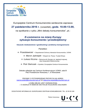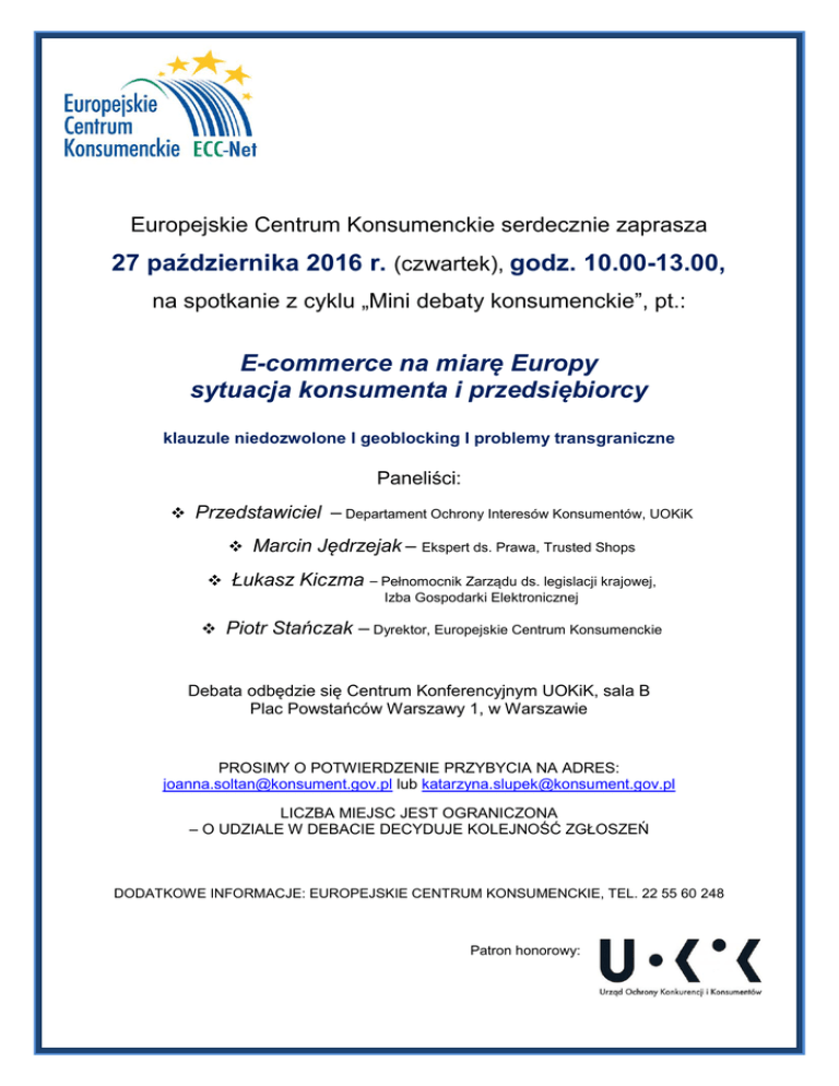 Europejskie Centrum Konsumenckie serdecznie zaprasza 27 października 2016 r. (czwartek), godz. 10.00-13.00, na spotkanie z cyklu „Mini debaty konsumenckie”, pt.: E-commerce na miarę Europy sytuacja konsumenta i przedsiębiorcy klauzule niedozwolone I geoblocking I problemy transgraniczne Paneliści: Przedstawiciel – Departament Ochrony Interesów Konsumentów, UOKiK Marcin Jędrzejak – Ekspert ds. Prawa, Trusted Shops Łukasz Kiczma – Pełnomocnik Zarządu ds. legislacji krajowej, Izba Gospodarki Elektronicznej Piotr Stańczak – Dyrektor, Europejskie Centrum Konsumenckie Debata odbędzie się Centrum Konferencyjnym UOKiK, sala B Plac Powstańców Warszawy 1, w Warszawie PROSIMY O POTWIERDZENIE PRZYBYCIA NA ADRES: [email protected] lub [email protected] LICZBA MIEJSC JEST OGRANICZONA – O UDZIALE W DEBACIE DECYDUJE KOLEJNOŚĆ ZGŁOSZEŃ DODATKOWE INFORMACJE: EUROPEJSKIE CENTRUM KONSUMENCKIE, TEL. 22 55 60 248 Patron honorowy: