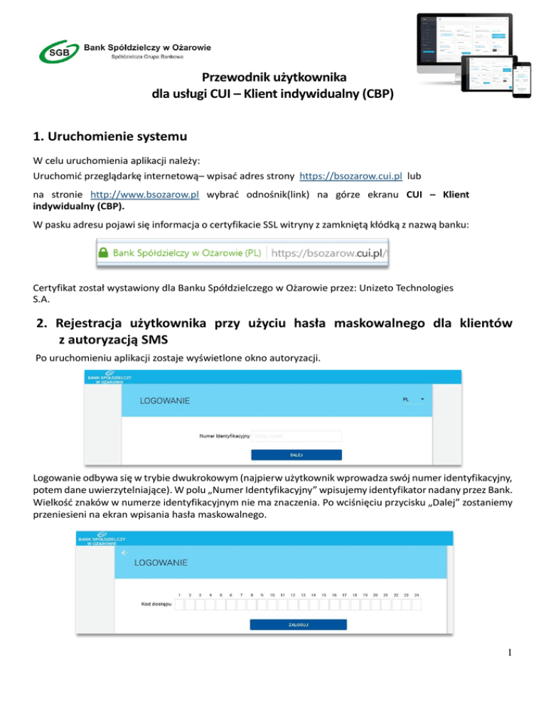 Przewodnik użytkownika dla usługi CUI – Klient indywidualny (CBP) 1. Uruchomienie systemu W celu uruchomienia aplikacji należy: Uruchomić przeglądarkę internetową– wpisać adres strony https://bsozarow.cui.pl lub na stronie http://www.bsozarow.pl wybrać odnośnik(link) na górze ekranu CUI – Klient indywidualny (CBP). W pasku adresu pojawi się informacja o certyfikacie SSL witryny z zamkniętą kłódką z nazwą banku: Certyfikat został wystawiony dla Banku Spółdzielczego w Ożarowie przez: Unizeto Technologies S.A. 2. Rejestracja użytkownika przy użyciu hasła maskowalnego dla klientów z autoryzacją SMS Po uruchomieniu aplikacji zostaje wyświetlone okno autoryzacji. Logowanie odbywa się w trybie dwukrokowym (najpierw użytkownik wprowadza swój numer identyfikacyjny, potem dane uwierzytelniające). W polu „Numer Identyfikacyjny” wpisujemy identyfikator nadany przez Bank. Wielkość znaków w numerze identyfikacyjnym nie ma znaczenia. Po wciśnięciu przycisku „Dalej” zostaniemy przeniesieni na ekran wpisania hasła maskowalnego. 1 Po wpisaniu hasła pierwszego logowania (startowego) system poprosi o ustawienie własnego hasła (kod dostępu)– należy podać najmniej 10 znaków i maksymalnie 24 i nie powinien zaczynać się od cyfry 0. Przy kolejnych logowaniach należy w jasnych kratkach (niewyszarzonych i bez •) wpisać tylko te znaki z hasła, na które wskazują cyfry. W przedstawionym poniżej przykładzie byłby to pierwszy, trzeci, szósty i piętnasty znak z naszego hasła. Przy wpisywaniu hasła maskowalnego, po wpisaniu znaku następuje automatyczne przeskoczenie do kolejnego pola. 3. Rejestracja użytkownika przy użyciu tokena RSA i hasła maskowalnego. 3.1 Ustawienie własnego hasła maskowalnego podczas pierwszego logowania. Po uruchomieniu aplikacji zostaje wyświetlone okno autoryzacji. 2 Logowanie odbywa się w trybie dwukrokowym (najpierw użytkownik wprowadza swój numer identyfikacyjny, potem dane uwierzytelniające). W polu „Numer Identyfikacyjny” wpisujemy identyfikator nadany przez Bank. Wielkość znaków w numerze identyfikacyjnym nie ma znaczenia. Po wciśnięciu przycisku „Dalej” zostaniemy przeniesieni na ekran wpisania hasła maskowalnego. Po wpisaniu hasła pierwszego logowania (startowego) system poprosi o ustawienie własnego hasła (kod dostępu) – należy podać najmniej 10 znaków i maksymalnie 24 i nie powinien zaczynać się od cyfry 0. Przy kolejnych logowaniach należy w jasnych kratkach (niewyszarzonych i bez •) wpisać tylko te znaki z hasła, na które wskazują cyfry. W przedstawionym poniżej przykładzie byłby to pierwszy, trzeci, szósty i piętnasty 3 znak z naszego hasła. Przy wpisywaniu hasła maskowalnego, po wpisaniu znaku następuje automatyczne przeskoczenie do kolejnego pola. 3.2 Ustalenie hasła do tokena RSA W celu ustalenia hasła do tokena RSA należy skorzystać z opcji USTAWIENIA->ZMIANA HASŁA TOKENA RSA. W polu „Obecny kod dostępu” należy podać aktualne wskazanie tokena a następnie wprowadzić i potwierdzić „Nowy kod dostępu”, który będzie stanowił hasło do tokena. Pojawi się prośba o wpisanie następnych wskazań tokena tzn. należy poczekać na zmianę wyświetlanych cyfr na tokenie i wpisać nowe wskazania tokena. 4 Od tego momentu ustalone hasło wraz z ustawieniami tokena będzie tworzyło klucz do potwierdzeń operacji w CUI. Podsumowując: Do logowania będzie potrzebny identyfikator i hasło maskowalne a do potwierdzeń wykonywanych operacji hasło do tokena i wskazania tokena. 4. Rejestracja użytkownika przy użyciu tokena RSA i hasła stałego. Po uruchomieniu aplikacji zostaje wyświetlone okno autoryzacji. W polu „Numer identyfikacyjny” wpisujemy nazwę użytkownika nadaną przez Bank. W przypadku identyfikatora nie ma znaczenia wielkość wprowadzanych znaków. Po wciśnięciu przycisku „Dalej” zostaniemy przeniesieni na ekran wpisania klucza. W polu „Klucz”: Podczas pierwszego logowania lub po resecie tokena wpisujemy aktualne wskazanie tokena. 5 W poniższym przykładzie kluczem będzie ciąg cyfr 159759. Po poprawnym wprowadzeniu ustawień tokena system zapyta o hasło. Użytkownik musi wpisać dowolne hasło składające się z 4 do 8 znaków i go potwierdzić. Wpisane hasło wraz z ustawieniami tokena będzie tworzyło klucz do wejścia do CUI i do potwierdzeń wszystkich operacji. Podczas kolejnego logowania przy pomocy tokena wpisujemy klucz czyli hasło oraz aktualne wskazanie tokena. Przykład klucza: abcdefgh661277 gdzie: abcdefgh – to zdefiniowane hasło, a 661277 – aktualne wskazanie tokena. Uwaga! Hasło musi zawierać od 4 do 8 dowolnych znaków. Dodatkowo hasło nie powinno zaczynać się od cyfry zero. 5. Zmiana sposobu logowania z klucza z tokenem RSA na hasło maskowalne. Dla klientów, którzy wystąpili z wnioskiem do banku o zmianę sposobu logowania na hasło maskowalne procedura nadania nowego hasła logowania wygląda jak w pkt. 3.1 niniejszego przewodnika. Kluczem do podpisu operacji w CUI pozostaje hasło stałe używane wcześniej i wskazania tokena. Jeśli użytkownik chciałby zmienić hasło do tokena RSA to należy skorzystać z opcji HASŁA->ZMIANA HASŁA TOKENA RSA. 6 Jako „Obecny kod dostępu” należy podać aktualne hasło stałe i wskazanie tokena a następnie wprowadzić i potwierdzić nowe hasło. Zmiana hasła zostanie potwierdzona odpowiednim komunikatem. 6. Rozpoczęcie pracy Po uruchomieniu systemu, wyświetlany jest pulpit z miniaplikacjami (widżetami). Układ miniaplikacji na pulpicie jest indywidualnie pamiętany dla użytkownika. Domyślny układ miniaplikacji na pulpicie można edytować za pomocą linku „EDYTUJ WYGLĄD” znajdującego się na pulpicie po prawej stronie nad widżetami miniaplikacji. Możliwe jest dodawanie, usuwanie, zmiana lokalizacji, a także zmiana rozmiaru widżetu. Uwaga! System automatycznie kończy sesję pracy użytkownika po upływie 10 minut bezc
