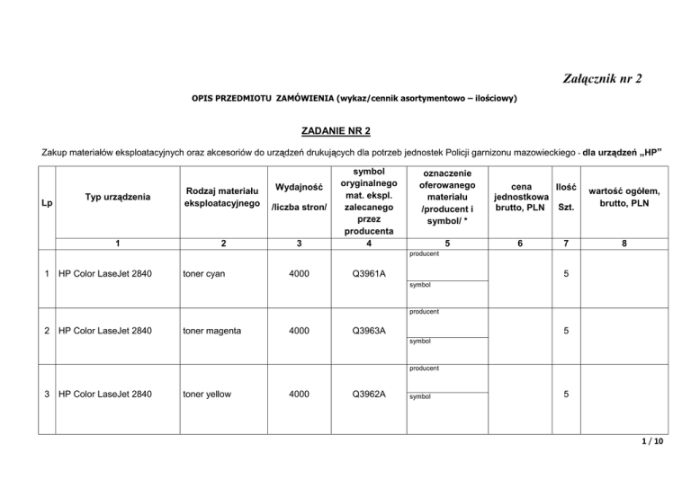 Załącznik nr 2 OPIS PRZEDMIOTU ZAMÓWIENIA (wykaz/cennik asortymentowo – ilościowy) ZADANIE NR 2 Zakup materiałów eksploatacyjnych oraz akcesoriów do urządzeń drukujących dla potrzeb jednostek Policji garnizonu mazowieckiego - dla urządzeń „HP” Lp Typ urządzenia 1 Wydajność Rodzaj materiału eksploatacyjnego /liczba stron/ 2 3 symbol oryginalnego mat. ekspl. zalecanego przez producenta 4 oznaczenie oferowanego materiału /producent i symbol/ * 5 cena Ilość jednostkowa brutto, PLN Szt. 6 7 wartość ogółem, brutto, PLN 8 producent 1 HP Color LaseJet 2840 toner cyan 4000 Q3961A 5 symbol producent 2 HP Color LaseJet 2840 toner magenta 4000 Q3963A 5 symbol producent 3 HP Color LaseJet 2840 toner yellow 4000 Q3962A symbol 5 1 / 10 1 2 3 4 5 6 7 8 producent 4 HP Color LaseJet 1600 toner czarny 2500 HP-Q6000A 3 symbol producent 5 HP Color LaseJet 1600 toner cyan 2000 HP-Q6001A 2 symbol producent 6 HP Color LaserJet 1600 toner magenta 2000 HP-Q6003A 2 symbol producent 7 HP Color LaserJet 1600 toner yellow 2000 HP-Q6002A symbol 2 producent 8 HP Color LaserJet 4550n Toner czarny 6000 C4194A symbol 4 2 / 10 1 2 3 4 5 6 7 8 producent 9 HP Color LaserJet CP1215/CM1312MFP toner cyan 1400 CB541A 10 symbol producent 10 HP Color LaserJet CP1215/CM1312MFP toner magenta 1400 CB543A 10 symbol producent 11 HP Color LaserJet CP1215/CM1312MFP toner yellow 1400 CB542A symbol 10 producent 12 HP DeskJet 3550/3650/3745 tusz kolor 28 190 (8 ml) C8728A symbol 3 producent 13 HP DeskJet 3550/3650/3745 tusz czarny 27 220 (10 ml) C8727A 3 symbol 3 / 10 1 HP DeskJet 450/5150/5550/OfficeJet 14 5610/PhotoSmart 7760/7350/PSC1110 HP DeskJet 450/5150/5550/OfficeJet 15 5610/PhotoSmart 7760/7350/PSC1110 2 3 4 5 6 7 8 producent tusz kolor 57 400 (17 ml) C6657AE 50 symbol producent tusz kolor 56 450 (19 ml) C6656AE 60 symbol producent HP DeskJet 460/5740/OfficeJet 16 100/H470/K7100/PhotoSmart 8150/PSC2355 symbol tusz kolor 344 14 ml C9363EE 20 producent 17 HP DeskJet 460/PhotoSmart 8150/PSC2355 tusz czarny 338 11 ml C8765EE symbol 40 4 / 10 1 HP DeskJet 6120/6122/710C/895cxi/930 18 C/959C/980cxi/G55/G85/122 0C 2 3 4 5 6 7 8 producent tusz czarny 45 833 (42 ml) 51645A 6 symbol producent HP DeskJet 6120/6122/920C/930C/940Ci 19 /959C/980cxi/G55/G85/1220 C tusz kolor 78 970 (38 ml) C6578A symbol 5 producent 20 HP DeskJet 840C/920C/940C tusz czarny 15 495 (25 ml) C6615D symbol 15 producent HP DeskJet 21 D1360/3920/3940/F4180/F38 0/PSC1410/F2180 tusz czarny 21 XL 475 C9351CE 50 symbol 5 / 10 1 2 3 4 5 6 7 8 producent HP DeskJet 22 D1360/3920/3940/F4180/F38 0/PSC1410/F2180 tusz kolor 22 XL 415 C9352CE 40 symbol producent 23 HP LaserJet 1000/1000W/1200/1220 HP LaserJet 1010/112/1018/1020/1022n/3 24 015/3020/3030/3050/3052/30 55/M1005mfp Toner 15A 2500 C7115A 40 symbol producent Toner 12 A 2000 Q2612A 372 symbol producent 25 HP LaserJet 1100/1100A/3200 Toner 92 A 2500 C4092A symbol 70 Producent 26 HP LaserJet 1160/1320 Toner 49 A 2500 Q5949A symbol 5 6 / 10 1 2 3 4 5 6 7 8 Producent 27 HP LaserJet 1200/1220 Toner 15 X 3500 C7115X 2 symbol producent 28 HP LaserJet 1300 Toner 13 X 4000 Q2613X 2 symbol producent 29 HP LaserJet 1320/3390 Toner 49 X 6000 Q5949X 100 symbol producent 30 HP LaserJet 2055d Toner 05X 6500 CE505X 2 symbol Producent 31 HP LaserJet 5L/6L/3100/3150 Toner 06A 2500 C3906A 3 symbol 7 / 10 1 2 3 4 5 6 7 8 producent 32 HP LaserJet P1005/P1006 Toner 35 A 1500 CB435A 500 symbol producent 33 HP LaserJet P1102/P1102W/M1132MFP Toner 85A 1600 CE285A 100 symbol producent 34 HP LaserJet P1505/P1505n/M1120MFP Toner 36 A 2000 CB436A symbol producent 15 5 35 HP LaserJet P1606dn Toner 78 A 2100 CE278A symbol producent 36 HP LaserJet P2035 Toner 05 A 2300 CE505A symbol 5 8 / 10 1 2 3 4 5 6 7 8 producent 37 HP OfficeJet 100/H470 tusz czarny 337 400 (11 ml) C9364EE symbol 10 producent 38 HP PhotoSmart Wireless B109n (Q8444B) Głowica CMYK 5500 CN643A 2 symbol producent 39 HP Color LaserJet 3600 toner black 6000 Q6470A 2 symbol producent 40 HP Color LaserJet 3600 toner cyan 4000 Q6471A 2 symbol producent 41 HP Color LaserJet 3600 toner yellow 4000 Q6472A 2 symbol 9 / 10 1 2 3 4 5 6 7 8 producent 42 HP Color LaserJet 3600 toner magenta 4000 Q6473A 2 symbol RAZEM wartość brutto, PLN ………………………………..………………………………… (podpis i pieczęć osoby upoważnionej do reprezentowania Wykonawcy) *) pod pojęciem oryginalnego materiału eksploatacyjnego rozumie się towar, którego producent wskazany jest w kolumnie 1 oraz posiadający symbol oryginalnego materiału eksploatacyjnego z kolumny 4; 10 / 10