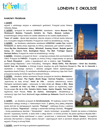 LONDYN I OKOLICE RAMOWY PROGRAM: 1 DZIEŃ wyjazd z ustalonego miejsca w umówionych godzinach. Przejazd przez Niemcy, Holandię, Belgię. 2 DZIEŃ Woskowych -przejazd do centrum LONDYNU, zwiedzanie : słynne Muzeum Figur Madame Tussaud’s, Katedra św. Pawła, Muzeum Londynu - przedstawiające dzieje miasta od czasów założenia aż do czasów współczesnych, Tower of London - słynne byłe więzienie, obecnie miejsce w którym można zobaczyć m.in. brytyjskie insygnia królewskie. Przejazd do rodzin na obiadokolację i nocleg. 3 DZIEŃ - po śniadnaniu całodzienne zwiedzanie LONDYNU: London Eye, budynki Parlamentu ze słynną wieżą zegarową na której zawieszony jest symbol Londynu – dzwon Big Ben, Westminster Abbey, Whitehall, Downing Street, Budynki gwardii konnej, St. James’s Park, Buckingham Palace, The Mall. Trafalgar Square, National Gallery. Przejazd do rodzin na obiadokolację i nocleg. 4 DZIEŃ – śniadanie, przejazd do Dover – przeprawa promowa (lub eurotunelem) do Calais. Przejazd do PARYŻA. Przygodę ze stolicą Francji rozpoczniemy od spaceru po Polach Elizejskich – jedna z największych alei w mieście, Łuk Triumfalny – symbol potęgi Napoleona i armii francuskiej. Następnie Wieża Eiffla, Pola Marsowe i Hotel des Invalides, kościół Dom des Invalides, w którego krypcie znajduje się grób Napoleona Bonaparte. Plac de la Concorde z obeliskiem z różowego marmuru i ośmioma posągami kobiet symbolizującymi największe miasta Francji. Po zwiedzaniu obiadokolacja w restauracji typu fast-food i przejazd na nocleg do hotelu typu F1 w okolicach Paryża. 5 DZIEŃ - śniadanie, dalsze zwiedzanie Paryża: przejazd do dzielnicy Montmartre Bazylika Sacre Coeur, Plac Pigalle, Moulin Rouge. Centrum Pompidou – budynek „wywrócony na lewą stronę”, Hotel de Ville – siedziba administracji miasta. Następnie zwiedzanie Luwru – zobaczymy tu takie dzieła jak: Wenus z Milo, Mona Lisę – Leonardo da Vinci czy Nike z Samotraki. Spacer po najstarszej części Paryża wyspie Ile de la Cite: Katedra Notre-Dame, Sainte Chapelle, Pont Neuf – najstarszy most Paryża, Palais de Justice, Conciergerie. Obiadokolacja w restauracji typu fast-food. Możliwość rejsu statkiem po Sekwanie. Powrót do hotelu na nocleg. 6 DZIEŃ - po śniadaniu przejazd do EuroDisneylandu. W bajkowej scenerii Parku Disneyland czekają atrakcje z różnorodnych krain. Z głównej ulicy pełnej sklepików można dotrzeć do następujących regionów: "Fantazji" - baśniowej krainy z zamkiem Śpiącej Królewny, "Pogranicza" - znanego z westernów Dzikiego Zachodu, "Przygody" - krainy poszukiwaczy skarbów i "Wynalazków" - świata technologii i przyszłości. Znaleźć się można w królestwie marzeń i najnowszej techniki, w domu lalek z całego świata i w krainie piratów. Na pewno spotkacie Myszkę Miki i Kaczora Donalda. Można podróżować w czasie i przestrzeni z bohaterami filmów Walta Disneya. Szczególnie polecamy skorzystanie z dużego wyboru karuzel i zapierających dech w piersiach kolejek górskich. Wieczorem wyjazd z Francji w stronę Polski. 7 DZIEŃ - powrót do kraju w godzinach popołudniowych. Cena wycieczki obejmuje: - przejazd autokarem w wc, klimatyzacją; - 2 noclegi u rodzin brytyjskich; 2 noclegi w hotelu typu F1 we Francji; - 4 śniadania kontynentalne, 2 packed lunche, 2 obiadokolacje u rodzin, 2 obiadokolacja w restauracjach typu Flunch we Francji; - ubezpieczenie NNW i KL; - przeprawy promowe Calais – Dover - Calais lub Eurotunel; - opieka pilota. UWAGA! Cena nie obejmuje: biletów wstępu do zwiedzanych obiektów i przejazdów komunikacją miejską Każdy z uczestników zobowiązany jest obligatoryjnie przygotować: 45 GBP + 45 EURO (osoby do 16 lat) lub 55 GBP + 55 EURO (osoby pow. 16 lat) - kwota ta obejmuje przejazdy autokarem w centrum miasta, bilety wstępu do zwiedzanych obiektów, przejazdy środkami komunikacji miejskiej (metro). Cena skalkulowana dla grupy: 45 os płatnych + 4 opiekunów. Biuro Turystyczne „TRAVEL ART” , ul. 1.Maja 3-5, 45-068 Opole tel/fax.077 4546065; tel. 4532277; e-mail: [email protected] www.travelart.pl NIP: 754-201-18-25 Konto: PKO BP I o/Opole 67 1020 3668 0000 5402 0013 9121