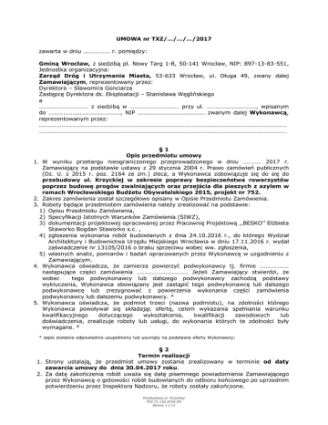 UMOWA nr TXZ/…/…/…/2017 zawarta w dniu ……………… r. pomiędzy: Gminą Wrocław, z siedzibą pl. Nowy Targ 1-8, 50-141 Wrocław, NIP: 897-13-83-551, Jednostka organizacyjna: Zarząd Dróg i Utrzymania Miasta, 53-633 Wrocław, ul. Długa 49, zwany dalej Zamawiającym, reprezentowany przez: Dyrektora – Sławomira Gonciarza Zastępcę Dyrektora ds. Eksploatacji – Stanisława Węglińskiego a …………………………… z siedzibą w …………………………… przy ul. ……………………………, wpisanym do …………………………………………, NIP ……………………………………… zwanym dalej Wykonawcą, reprezentowanym przez: ………………………………………………………………………………………………………………………………………………… ………………………………………………………………………………………………………………………………………………… §1 Opis przedmiotu umowy 1. W wyniku przetargu nieograniczonego przeprowadzonego w dniu ………… 2017 r. Zamawiający na podstawie ustawy z 29 stycznia 2004 r. Prawo zamówień publicznych (Dz. U. z 2015 r. poz. 2164 ze zm.) zleca, a Wykonawca zobowiązuje się do się do przebudowy ul. Krzyckiej w zakresie poprawy bezpieczeństwa rowerzystów poprzez budowę progów zwalniających oraz przejścia dla pieszych z azylem w ramach Wrocławskiego Budżetu Obywatelskiego 2015, projekt nr 752. 2. Zakres zamówienia został szczegółowo opisany w Opisie Przedmiotu Zamówienia. 3. Roboty będące przedmiotem zamówienia należy zrealizować na podstawie: 1) Opisu Przedmiotu Zamówienia, 2) Specyfikacji Istotnych Warunków Zamówienia (SIWZ), 3) dokumentacji projektowej opracowanej przez Pracownię Projektową ,,BESKO’’ Elżbieta Staworko Bogdan Staworko s.c. , 4) zgłoszenia wykonania robót budowlanych z dnia 24.10.2016 r., do którego Wydział Architektury i Budownictwa Urzędu Miejskiego Wrocławia w dniu 17.11.2016 r. wydał zaświadczenie nr 13105/2016 o braku sprzeciwu wobec ww. zgłoszenia, 5) własnych analiz, pomiarów i badań opracowanych przez Wykonawcę w uzgodnieniu z Zamawiającym. 4. Wykonawca oświadcza, że zamierza powierzyć podwykonawcy tj. firmie ………………. następujące części zamówienia ……………………………. Jeżeli Zamawiający stwierdzi, że wobec tego podwykonawcy lub dalszego podwykonawcy zachodzą podstawy wykluczenia, Wykonawca obowiązany jest zastąpić tego podwykonawcę lub dalszego podwykonawcę lub zrezygnować z powierzenia wykonania części zamówienia podwykonawcy lub dalszemu podwykonawcy. * 5. Wykonawca oświadcza, że podmiot trzeci (nazwa podmiotu), na zdolności którego Wykonawca powoływał się składając ofertę, celem wykazania spełniania warunku kwalifikacyjnego dotyczącego wykształcenia, kwalifikacji zawodowych lub doświadczenia, zrealizuje roboty lub usługi, do wykonania których te zdolności były wymagane. * * zapis zostanie odpowiednio uzupełniony lub usunięty na podstawie oferty Wykonawcy; §2 Termin realizacji 1. Strony ustalają, że przedmiot umowy zostanie zrealizowany w terminie od daty zawarcia umowy do dnia 30.04.2017 roku. 2. Za datę zakończenia robót uważa się datę pisemnego powiadomienia Zamawiającego przez Wykonawcę o gotowości robót budowlanych do odbioru końcowego po uprzednim potwierdzeniu przez Inspektora Nadzoru, że roboty zostały zakończone. Przebudowa ul. Krzyckiej TXZ.71.132.2016.OK Strona 1 z 11 §3 Obowiązki Zamawiającego 1. Do obowiązków Zamawiającego w trakcie realizacji przedmiotu umowy należy: 1) przekazanie Wykonawcy terenu budowy, 2) zapewnienie nadzoru inwestorskiego, 3) kontrola postępu i jakości prac wykonywanych w ramach przedmiotu umowy, 4) przeprowadzenie odbioru robót oraz zapłata za ich wykonanie. 2. Zamawiający nie ponosi odpowiedzialności za składniki majątkowe Wykonawcy znajdujące się na terenie budowy w trakcie realizacji przedmiotu umowy. 3. Zamawiający zastrzega obowiązek osobistego wykonania przez Wykonawcę kluczowych części zamówienia na roboty budowlane: roboty drogowe. §4 Obowiązki Wykonawcy 1. Wykonawca zobowiązuje się do realizacji robót budowlanych zgodnie z wytycznymi i obowiązkami zawartymi w Opisie Przedmiotu Zamówienia (dalej zwanym OPZ) będący załącznikiem do SIWZ; z postanowieniami umownymi oraz z obowiązującymi w tym zakresie przepisami i normami. 2. Wykonawca w dniu zawarcia niniejszej umowy dostarczył komplet dokumentów potwierdzających ubezpieczenie odpowiedzialności cywilnej z tytułu prowadzonej działalności gospodarczej odpowiadającej przedmiotowi zamówienia, w zakresie umożliwiającym pokrycie szkód, jakie mogą powstać w związku z wykonaniem i wykonywaniem przedmiotowego zamówienia na sumę ubezpieczenia wynoszącą co najmniej 300.000,00 zł lub 30.000,00 zł na każde zdarzenie bez ograniczania liczby zdarzeń. Przez komplet dokumentów ubezpieczeniowych Strony przyjmują m.in. polisę ubezpieczeniową odpowiadającą przedmiotowi niniejszego zamówienia (lub inny dokument wystawiony przez ubezpieczyciela potwierdzający zawarcie umowy ubezpieczenia odpowiadającej przedmiotowi zamówienia) wraz z załącznikami, uzupełnianą w każdym przypadku wypłaty należności z polisy (odszkodowanie lub inna należność) o wysokość wypłaconej polisy. W przypadku, gdy okres ubezpieczenia, na który zawarta jest umowa ubezpieczenia upływa w okresie realizacji przedmiotowego zamówienia, Wykonawca zobowiązany jest dostarczyć Zamawiającemu dokumenty potwierdzające przedłużenie ochrony ubezpieczeniowej, na co najmniej takich samych warunkach. W przypadku, gdy składka ubezpieczeniowa opłacana jest w ratach, których termin płatności upływa w okresie realizacji przedmiotowego zamówienia, Wykonawca zobowiązany jest dostarczyć Zamawiającemu, potwierdzenia zapł