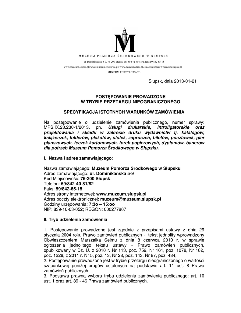 MUZEUM POMORZA ŚRODKOWEGO W SŁUPSKU ul. Dominikańska 5-9, 76-200 Słupsk, tel. 59 842-40-81/2, faks 59 842-65-18 www.muzeum.slupsk.pl; www.muzeum.swolowo.pl; www.muzeumkluki.pl;e-mail: [email protected] MUZEUM REJESTROWANE Słupsk, dnia 2013-01-21 POSTĘPOWANIE PROWADZONE W TRYBIE PRZETARGU NIEOGRANICZONEGO SPECYFIKACJA ISTOTNYCH WARUNKÓW ZAMÓWIENIA Na postępowanie o udzielenie zamówienia publicznego, numer sprawy: MPŚ.IX.23.230-1/2013, pn. Usługi drukarskie, introligatorskie oraz projektowania i składu w zakresie druku wydawnictw tj. katalogów, książeczek, folderów, plakatów, ulotek, zaproszeń, biletów, pocztówek, gier planszowych, teczek kartonowych, toreb papierowych, dyplomów, banerów dla potrzeb Muzeum Pomorza Środkowego w Słupsku. I. Nazwa i adres zamawiającego: Nazwa zamawiającego: Muzeum Pomorza Środkowego w Słupsku Adres zamawiającego: ul. Dominikańska 5-9 Kod Miejscowość: 76-200 Słupsk Telefon: 59/842-40-81/82 Faks: 59/842-65-18 Adres strony internetowej: www.muzeum.slupsk.pl Adres poczty elektronicznej: [email protected] Godziny urzędowania: 7:3o – 15:oo NIP: 839-10-03-052; REGON: 000277807 II. Tryb udzielenia zamówienia 1. Postępowanie prowadzone jest zgodnie z przepisami ustawy z dnia 29 stycznia 2004 roku Prawo zamówień publicznych - tekst jednolity wprowadzony Obwieszczeniem Marszałka Sejmu z dnia 8 czerwca 2010 r. w sprawie ogłoszenia jednolitego tekstu ustawy - Prawo zamówień publicznych, opublikowany w Dz. U. z 2010 r. Nr 113, poz. 759, Nr 161, poz. 1078, Nr 182, poz. 1228, z 2011 r. Nr 5, poz. 13, Nr 28, poz. 143, Nr 87, poz. 484, 2. Postępowanie prowadzone jest w trybie przetargu nieograniczonego o wartości szacunkowej poniżej progów ustalonych na podstawie art. 11 ust. 8 Prawa zamówień publicznych. 3. Podstawa prawna wyboru trybu udzielenia zamówienia publicznego: art. 10 ust. 1 oraz art. 39 - 46 Prawa zamówień publicznych. 4. W zakresie nieuregulowanym w niniejszej specyfikacji istotnych warunków zamówienia, zastosowanie mają przepisy ustawy Prawo zamówień publicznych. Lp. OPIS PRZEDMIOTU ZAMÓWIENIA III. Opis przedmiotu zamówienia 1. Opis przedmiotu zamówienia: Przedmiotem zamówienia są usługi drukarskie, introligatorskie oraz projektowania i składu w zakresie druku wydawnictw tj. katalogów, folderów, plakatów, ulotek, zaproszeń, biletów, pocztówek dla potrzeb Muzeum Pomorza Środkowego w Słupsk. Szczegółowy opis przedmiotu zamówienia przedstawiono poniżej w niniejszej specyfikacji. 1. 2. 3. 4. 5. 6. 7. 8. 9. Tytuł: Plakaty (projekt, skład, druk) Ogólny nakład: 5.850 egz. (22 wzory) Format: A2 (420 x 594mm) Papier: kreda błysk 135 g/m2 Kolor: pełny Tytuł: Plakaty „Dziecięca Zagroda” (druk) Ogólny nakład: 300 egz. Format: B2 Papier: kreda błysk 135 g/m2 Kolor: pełny Tytuł: Afisz MWS Kluki (projekt, skład, druk) Ogólny nakład: 400 egz. Format: A3 Papier: kreda błysk 135 g/m2 Kolor: pełny Tytuł: Plakaty (projekt, skład, druk) Ogólny nakład: 400 egz. (2 wzory) Format: A2 (420 x 594mm) Papier: papier offset 90 g/m2 Kolor: pełny Tytuł: Plakaty (projekt, skład, druk) Ogólny nakład: 400 egz. (2 wzory) Format: A3 Papier: papier offset 90 g/m2 Kolor: pełny Tytuł: Zaproszenia do wystaw i imprez (projekt, skład, druk) Ogólny nakład: 1.900 egz. (6 wzorów) Format: A4 składane do A5 Papier: kreda błysk 300 g/m2 Kolor: pełny Tytuł: Zaproszenia do wystaw i imprez (druk) Ogólny nakład: 300 egz. Format: A-4 składane do A5 Papier: karton biały błyszczący 250 g/m2 Kolor: 1 strona barwna, 1 strona czarno-biała Tytuł: Zaproszenia do wystawy poplenerowej (projekt, skład, druk) Ogólny nakład: 200 egz. Format: A-4 składane do A5 Papier: kreda mat 300 g/m2 Kolor: pełny dwustronny Tytuł: Zaproszenia do imprezy Jubileusz MWS Kluki (projekt, skład, druk) Ogólny nakład: 500 egz. Format: A4 składane do A5 2 10. 11. 12. 13. 14. 15. 16. 17. 18. 19. Papier: kreda mat 250 g/m2 Kolor: pełny dwustronny Tytuł: Zaproszenia do wystawy „Nazwano ich Słowińcami” (druk) Ogólny nakład: 1.000 szt. Format: 21x21cm (składane na pół) pełny kolor + 1 strona format 21 x 10,5cm druk czarno biały, papier kalka techniczna (doklejona brzegiem do kredy) Papier: kreda mat 300 g/m2 Tytuł: Zaproszenia do imprez (projekt, skład, druk) Ogólny nakład: 500 egz. (2 wzory) Format: 10,5 x 42cm (składane na pół) Papier: kreda mat 300 g/m2 Druk dwustronny kolorowy Tytuł: Zaproszenia do wystaw i imprez (druk) Ogólny nakład: 1750 egz. (7 wzorów) Format: 2 x DL Papier: kreda mat 250 g/m2 Kolor: pełny Tytuł: Ulotka reklamowa MWS Kluki (druk) Ogólny nakład: 10.000 egz. Format: 21 x 21 cm składane na pół Papier: kreda błysk 150 g/m2 Kolor: pełny, druk dwustronny Tytuł: Ulotka „Dziecięca Zagroda” (druk) Ogólny nakład: 6.000 ezg. Format: A4 składana do DL Papier: kreda mat 105 g/m2 Kolor: pełny Tytuł: Ulotka informacyjna Swołowo (druk) Ogólny nakład: 18.000 egz. - 12.000 egz. wersja w j. polskim - 6.000 egz. wersja w j. niemieckim Format: 4xDL składana Papier: kreda mat 115 g/m2 Kolor: pełny Tytuł: Ulotka przegląd filmowy (druk) Ogólny nakład: 2.000 egz. Format: DL Papier: kreda mat 105 g/m2 Kolor: pełny Tytuł: Ulotka – program imprez: Czarne Wesele i Pożegnanie lata (projekt, skład, łamanie, druk) Ogólny nakład: 1.000 egz. (2 wzory) Format: A4 składany na 3 części Papier: kreda błysk 150 g/m2 , druk dwustronny, kolorowy Tytuł: Folder do wystawy podsumowującej (druk) Ogólny nakład: 300 egz. Format: 56 x 30 cm składany na 4 Papier: karton biały 250 g/m2 Kolor: pełny Tytuł: Folder promocyjny (projekt, skład, łamanie, druk) Ogólny nakład: 120.000 egz. (w. polska 20.000 x 3 wzory, w. angielska 10.000 x 3 wzory, w. niemiecka 10.000 x 3 wzory) Format: A4 składane na 3 Papier: kreda błysk 150 g/m2 3 20. 21. 22. 23. 24. 25. 26. 27. 28. Kolor: pełny Tytuł: Folder Przewodnik MWS Kluki (projekt, skład, łamanie, druk) Ogólny nakład: 1.0