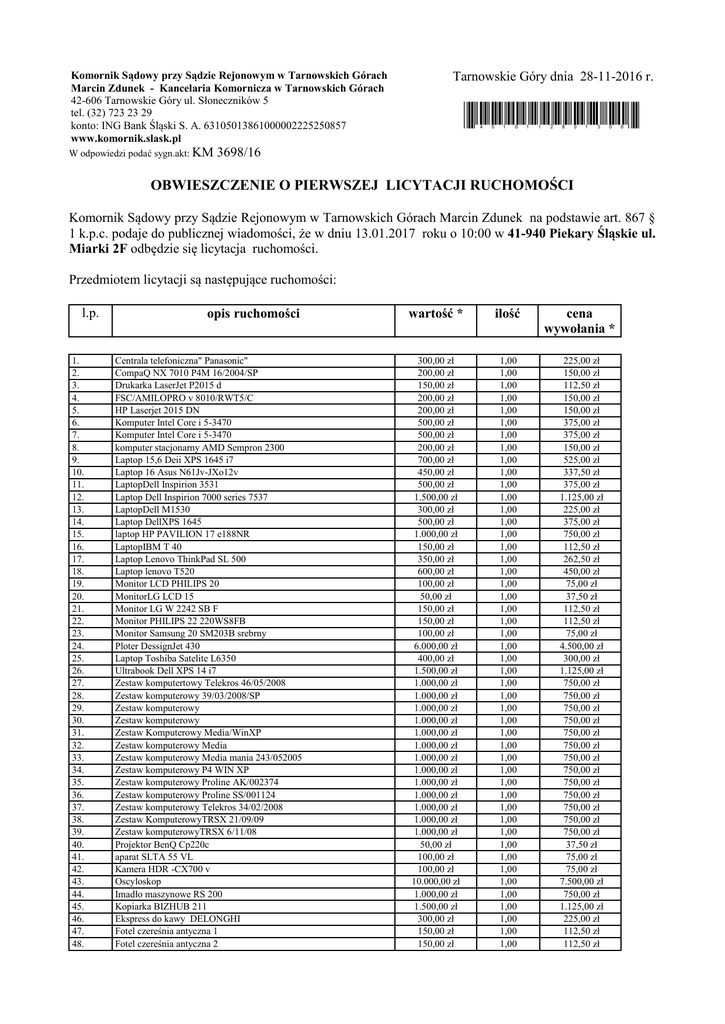 Komornik Sądowy przy Sądzie Rejonowym w Tarnowskich Górach Marcin Zdunek - Kancelaria Komornicza w Tarnowskich Górach 42-606 Tarnowskie Góry ul. Słoneczników 5 tel. (32) 723 23 29 konto: ING Bank Śląski S. A. 63105013861000002225250857 www.komornik.slask.pl W odpowiedzi podać sygn.akt: KM Tarnowskie Góry dnia 28-11-2016 r. *4016112801306* 3698/16 OBWIESZCZENIE O PIERWSZEJ LICYTACJI RUCHOMOŚCI Komornik Sądowy przy Sądzie Rejonowym w Tarnowskich Górach Marcin Zdunek na podstawie art. 867 § 1 k.p.c. podaje do publicznej wiadomości, że w dniu 13.01.2017 roku o 10:00 w 41-940 Piekary Śląskie ul. Miarki 2F odbędzie się licytacja ruchomości. Przedmiotem licytacji są następujące ruchomości: l.p. 1. 2. 3. 4. 5. 6. 7. 8. 9. 10. 11. 12. 13. 14. 15. 16. 17. 18. 19. 20. 21. 22. 23. 24. 25. 26. 27. 28. 29. 30. 31. 32. 33. 34. 35. 36. 37. 38. 39. 40. 41. 42. 43. 44. 45. 46. 47. 48. opis ruchomości Centrala telefoniczna" Panasonic" CompaQ NX 7010 P4M 16/2004/SP Drukarka LaserJet P2015 d FSC/AMILOPRO v 8010/RWT5/C HP Laserjet 2015 DN Komputer Intel Core i 5-3470 Komputer Intel Core i 5-3470 komputer stacjonarny AMD Sempron 2300 Laptop 15,6 Deii XPS 1645 i7 Laptop 16 Asus N61Jv-JXo12v LaptopDell Inspirion 3531 Laptop Dell Inspirion 7000 series 7537 LaptopDell M1530 Laptop DellXPS 1645 laptop HP PAVILION 17 e188NR LaptopIBM T 40 Laptop Lenovo ThinkPad SL 500 Laptop lenovo T520 Monitor LCD PHILIPS 20 MonitorLG LCD 15 Monitor LG W 2242 SB F Monitor PHILIPS 22 220WS8FB Monitor Samsung 20 SM203B srebrny Ploter DessignJet 430 Laptop Toshiba Satelite L6350 Ultrabook Dell XPS 14 i7 Zestaw komputertowy Telekros 46/05/2008 Zestaw komputerowy 39/03/2008/SP Zestaw komputerowy Zestaw komputerowy Zestaw Komputerowy Media/WinXP Zestaw komputerowy Media Zestaw komputerowy Media mania 243/052005 Zestaw komputerowy P4 WIN XP Zestaw komputerowy Proline AK/002374 Zestaw komputerowy Proline SS/001124 Zestaw komputerowy Telekros 34/02/2008 Zestaw KomputerowyTRSX 21/09/09 Zestaw komputerowyTRSX 6/11/08 Projektor BenQ Cp220c aparat SLTA 55 VL Kamera HDR -CX700 v Oscyloskop Imadło maszynowe RS 200 Kopiarka BIZHUB 211 Ekspress do kawy DELONGHI Fotel czereśnia antyczna 1 Fotel czereśnia antyczna 2 wartość * ilość cena wywołania * 300,00 zł 200,00 zł 150,00 zł 200,00 zł 200,00 zł 500,00 zł 500,00 zł 200,00 zł 700,00 zł 450,00 zł 500,00 zł 1.500,00 zł 300,00 zł 500,00 zł 1.000,00 zł 150,00 zł 350,00 zł 600,00 zł 100,00 zł 50,00 zł 150,00 zł 150,00 zł 100,00 zł 6.000,00 zł 400,00 zł 1.500,00 zł 1.000,00 zł 1.000,00 zł 1.000,00 zł 1.000,00 zł 1.000,00 zł 1.000,00 zł 1.000,00 zł 1.000,00 zł 1.000,00 zł 1.000,00 zł 1.000,00 zł 1.000,00 zł 1.000,00 zł 50,00 zł 100,00 zł 100,00 zł 10.000,00 zł 1.000,00 zł 1.500,00 zł 300,00 zł 150,00 zł 150,00 zł 1,00 1,00 1,00 1,00 1,00 1,00 1,00 1,00 1,00 1,00 1,00 1,00 1,00 1,00 1,00 1,00 1,00 1,00 1,00 1,00 1,00 1,00 1,00 1,00 1,00 1,00 1,00 1,00 1,00 1,00 1,00 1,00 1,00 1,00 1,00 1,00 1,00 1,00 1,00 1,00 1,00 1,00 1,00 1,00 1,00 1,00 1,00 1,00 225,00 zł 150,00 zł 112,50 zł 150,00 zł 150,00 zł 375,00 zł 375,00 zł 150,00 zł 525,00 zł 337,50 zł 375,00 zł 1.125,00 zł 225,00 zł 375,00 zł 750,00 zł 112,50 zł 262,50 zł 450,00 zł 75,00 zł 37,50 zł 112,50 zł 112,50 zł 75,00 zł 4.500,00 zł 300,00 zł 1.125,00 zł 750,00 zł 750,00 zł 750,00 zł 750,00 zł 750,00 zł 750,00 zł 750,00 zł 750,00 zł 750,00 zł 750,00 zł 750,00 zł 750,00 zł 750,00 zł 37,50 zł 75,00 zł 75,00 zł 7.500,00 zł 750,00 zł 1.125,00 zł 225,00 zł 112,50 zł 112,50 zł 49. 50. 51. 52. 53. 54. 55. 56. 57. 58. 59. 60. klatka magazynowa na butle gazowe sofa 2 czeresnia sofa czereśnia 3 szafa szafa biurowa witryna 2 D zabudowa meblowa zestaw wypoczynkowy 2 zestaw capri meble biurowe zestawy meblowe Telewizor LG 42 c Telewizor Philips 50 1.000,00 zł 200,00 zł 250,00 zł 180,00 zł 180,00 zł 120,00 zł 300,00 zł 350,00 zł 500,00 zł 600,00 zł 600,00 zł 750,00 zł 1,00 1,00 1,00 1,00 1,00 1,00 1,00 1,00 1,00 1,00 1,00 1,00 750,00 zł 150,00 zł 187,50 zł 135,00 zł 135,00 zł 90,00 zł 225,00 zł 262,50 zł 375,00 zł 450,00 zł 450,00 zł 562,50 zł RAZEM: 36.097,50 zł** Ruchomości można oglądać w miejscu licytacji przed rozpoczęciem przetargu. Prawa osób trzecich nie będą przeszkodą do przeprowadzenia licytacji i przybicia na rzecz nabywcy bez zastrzeżeń, jeżeli osoby te przed rozpoczęciem przetargu nie złożą dowodu, że wniosły powództwo o zwolnienie ruchomości od egzekucji i uzyskały w tym zakresie orzeczenie wstrzymujące egzekucję. Przystępujący do licytacji zobowiązany jest uiścić wadium w wysokości 1/10 sumy oszacowania ruchomości, najpóźniej w dniu poprzedzającym przetarg w gotówce/na konto komornika. Nabywca jest obowiązany zapłacić cenę nabycia natychmiast po udzieleniu mu przybicia. Gdy jednak cena nabycia przewyższa pięćset złotych, obowiązek nabywcy ogranicza się do złożenia natychmiast jednej piątej ceny, nie mniej jednak niż pięćset złotych, przy czym resztę ceny, na którą zalicza się złożoną rękojmię, uiszcza się w dniu następnym w godzinach urzędowania kancelarii komorniczej lub na rachunek bankowy komornika do godziny osiemnastej dnia następnego. Jeżeli ten dzień przypada w sobotę lub dzień ustawowo wolny od pracy, cenę uiszcza się w następnym dniu po dniu albo dniach wolnych od pracy. Licytacja może zostać odwołana bez podania przyczyny. Komornik Sądowy Marcin Zdunek * - wartość lub cena wywołania za 1 szt. ** - łączna cena wywołania wszystkich ruchomości Do wiadomości: - dłużnik - wierzyciel/pełnomocnik - sąd rejonowy właściwy dla miejsca sprzedaży - tablica ogłoszeń - uczestnicy postępowania sporządził TP