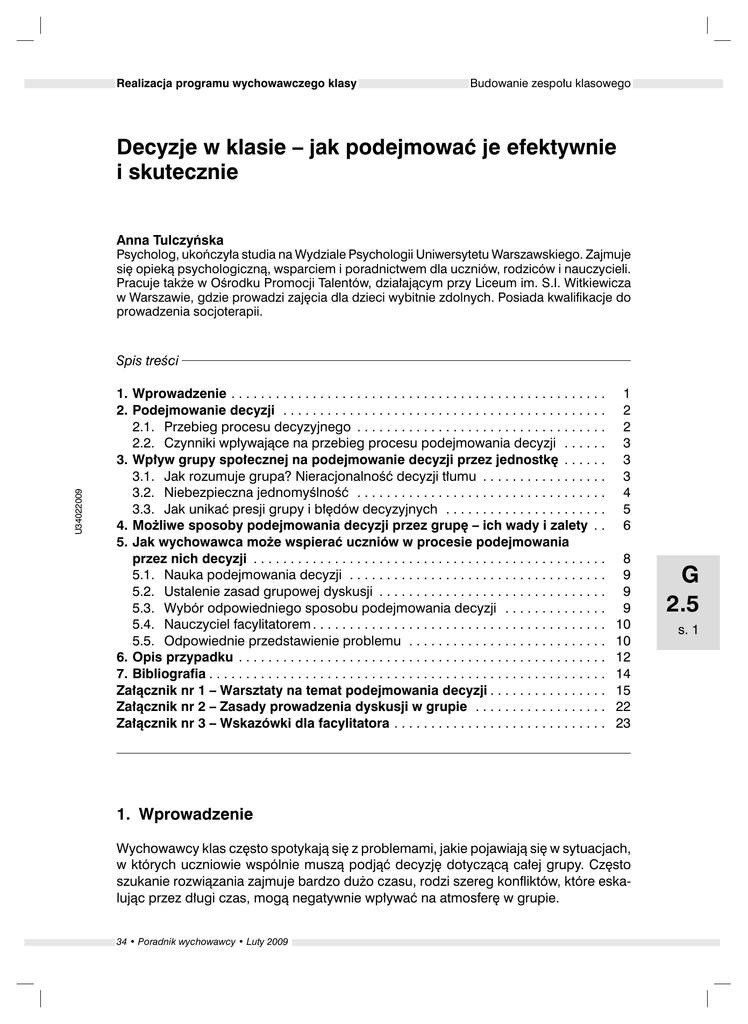 Realizacja programu wychowawczego klasy Budowanie zespołu klasowego Decyzje w klasie – jak podejmować je efektywnie i skutecznie Anna Tulczyńska Psycholog, ukończyła studia na Wydziale Psychologii Uniwersytetu Warszawskiego. Zajmuje się opieką psychologiczną, wsparciem i poradnictwem dla uczniów, rodziców i nauczycieli. Pracuje także w Ośrodku Promocji Talentów, działającym przy Liceum im. S.I. Witkiewicza w Warszawie, gdzie prowadzi zajęcia dla dzieci wybitnie zdolnych. Posiada kwalifikacje do prowadzenia socjoterapii. U34022009 Spis treści 1. Wprowadzenie . . . . . . . . . . . . . . . . . . . . . . . . . . . . . . . . . . . . . . . . . . . . . . . . . . . 2. Podejmowanie decyzji . . . . . . . . . . . . . . . . . . . . . . . . . . . . . . . . . . . . . . . . . . . . 2.1. Przebieg procesu decyzyjnego . . . . . . . . . . . . . . . . . . . . . . . . . . . . . . . . . . 2.2. Czynniki wpływające na przebieg procesu podejmowania decyzji . . . . . . 3. Wpływ grupy społecznej na podejmowanie decyzji przez jednostkę . . . . . . 3.1. Jak rozumuje grupa? Nieracjonalność decyzji tłumu . . . . . . . . . . . . . . . . . 3.2. Niebezpieczna jednomyślność . . . . . . . . . . . . . . . . . . . . . . . . . . . . . . . . . . 3.3. Jak unikać presji grupy i błędów decyzyjnych . . . . . . . . . . . . . . . . . . . . . . 4. Możliwe sposoby podejmowania decyzji przez grupę – ich wady i zalety . . 5. Jak wychowawca może wspierać uczniów w procesie podejmowania przez nich decyzji . . . . . . . . . . . . . . . . . . . . . . . . . . . . . . . . . . . . . . . . . . . . . . . . 5.1. Nauka podejmowania decyzji . . . . . . . . . . . . . . . . . . . . . . . . . . . . . . . . . . . 5.2. Ustalenie zasad grupowej dyskusji . . . . . . . . . . . . . . . . . . . . . . . . . . . . . . . 5.3. Wybór odpowiedniego sposobu podejmowania decyzji . . . . . . . . . . . . . . 5.4. Nauczyciel facylitatorem . . . . . . . . . . . . . . . . . . . . . . . . . . . . . . . . . . . . . . . . 5.5. Odpowiednie przedstawienie problemu . . . . . . . . . . . . . . . . . . . . . . . . . . . 6. Opis przypadku . . . . . . . . . . . . . . . . . . . . . . . . . . . . . . . . . . . . . . . . . . . . . . . . . . 7. Bibliografia . . . . . . . . . . . . . . . . . . . . . . . . . . . . . . . . . . . . . . . . . . . . . . . . . . . . . . Załącznik nr 1 – Warsztaty na temat podejmowania decyzji . . . . . . . . . . . . . . . . Załącznik nr 2 – Zasady prowadzenia dyskusji w grupie . . . . . . . . . . . . . . . . . . Załącznik nr 3 – Wskazówki dla facylitatora . . . . . . . . . . . . . . . . . . . . . . . . . . . . . 1 2 2 3 3 3 4 5 6 8 9 9 9 10 10 12 14 15 22 23 1. Wprowadzenie Wychowawcy klas często spotykają się z problemami, jakie pojawiają się w sytuacjach, w których uczniowie wspólnie muszą podjąć decyzję dotyczącą całej grupy. Często szukanie rozwiązania zajmuje bardzo dużo czasu, rodzi szereg konfliktów, które eskalując przez długi czas, mogą negatywnie wpływać na atmosferę w grupie. 34 • Poradnik wychowawcy • Luty 2009 G 2.5 s. 1 Budowanie zespołu klasowego Realizacja programu wychowawczego klasy Poniższy tekst został przygotowany, aby pomóc nauczycielom w sprawnym przeprowadzeniu klasy przez proces podejmowania decyzji – przedstawia podstawowe informacje na temat procesów podejmowania decyzji, opisuje specyfikę podejmowania decyzji przez grupę, a także prezentuje czynniki wpływające na ten proces, zawiera także praktyczne informacje przydatne nauczycielom w pracy wychowawczej – wskazówki dotyczące kierowania procesem podejmowania decyzji przez uczniów. Prezentuje sposoby podejmowania decyzji w grupie, analizuje ich plusy i minusy, a także sugeruje, który ze sposobów najkorzystniej zastosować w najczęściej spotykanych w szkole sytuacjach decyzyjnych. 2. Podejmowanie decyzji 2.1. Przebieg procesu decyzyjnego Podejmowanie decyzji to wybór jakiegoś działania lub rzeczy poprzedzony pewną refleksją. Teoretycy, zajmujący się procesami decyzyjnymi, wyróżniają kilka rodzajów decyzji1. Ze względu na ich skutki wyróżniono decyzje: pewne – czyli takie, których konsekwencje są dokładnie znane i w pełni przewidywalne, oraz ryzykowne – takie, których konsekwencje mogą być zgodne lub sprzeczne z oczekiwaniami, a rozwiązania mogą przynieść zysk lub stratę decydentom. s. 2 Podejmowanie decyzji poprzedzone jest: przewidywaniem tego, co może zdarzyć się po podjęciu decyzji, oceną prawdopodobieństwa pojawienia się tych konsekwencji, oceną tych konsekwencji. Takie przewidywania znacząco wpływają na ostatecznie podejmowane decyzje. Oceniając prawdopodobieństwo pojawienia się przewidywanych konsekwencji, ludzie wykorzystują kilka zasad. Pierwsza z nich to zasada dostępności psychicznej, zgodnie z którą bardziej prawdopodobne wydają się te skutki decyzji, które łatwiej jest im odświeżyć w pamięci, np. uczniowie, którzy dobrze pamiętają te sytuacje, w których oni lub ich koledzy zostali ukarani za ściąganie, częściej będą podejmować decyzję o unikaniu ściągania niż uczniowie, którzy takich sytuacji nie pamiętają. 34 • Poradnik wychowawcy • Luty 2009 U34022009 G 2.5 Ze względu na charakter wyborów wyróżniono: decyzje selekcyjne, kiedy decydent staje przed wyborem jednej z alternatyw, np. klasa musi wybrać miejsce, które chce odwiedzić podczas szkolnej wycieczki, alokacyjne, gdy zadanie dotyczy przyporządkowania elementów do siebie, np. uczniowie spośród wybranej trójki kolegów muszą zadecydować, kto będzie piastował funkcję skarbnika, zastępcy gospodarza klasy, i decyzje hierarchiczne dotyczące usystematyzowania pewnych elementów, np. uszeregowania przez uczniów proponowanych im tematów godzin wychowawczych pod względem ważności lub zainteresowania danym zagadnieniem. Realizacja programu wychowawczego klasy Budowanie zespołu klasowego Kolejna zasada to nadmierny optymiz