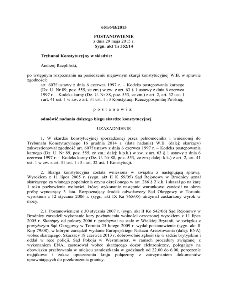 651/6/B/2015 POSTANOWIENIE z dnia 29 maja 2015 r. Sygn. akt Ts 352/14 Trybunał Konstytucyjny w składzie: Andrzej Rzepliński, po wstępnym rozpoznaniu na posiedzeniu niejawnym skargi konstytucyjnej W.B. w sprawie zgodności: art. 607f ustawy z dnia 6 czerwca 1997 r. – Kodeks postępowania karnego (Dz. U. Nr 89, poz. 555, ze zm.) w zw. z art. 63 § 1 ustawy z dnia 6 czerwca 1997 r. – Kodeks karny (Dz. U. Nr 88, poz. 553, ze zm.) z art. 2, art. 32 ust. 1 i art. 41 ust. 1 w zw. z art. 31 ust. 1 i 3 Konstytucji Rzeczypospolitej Polskiej, p o s t a n a w i a: odmówić nadania dalszego biegu skardze konstytucyjnej. UZASADNIENIE 1. W skardze konstytucyjnej sporządzonej przez pełnomocnika i wniesionej do Trybunału Konstytucyjnego 16 grudnia 2014 r. (data nadania) W.B. (dalej: skarżący) zakwestionował zgodność art. 607f ustawy z dnia 6 czerwca 1997 r. – Kodeks postępowania karnego (Dz. U. Nr 89, poz. 555, ze zm.; dalej: k.p.k.) w zw. z art. 63 § 1 ustawy z dnia 6 czerwca 1997 r. – Kodeks karny (Dz. U. Nr 88, poz. 553, ze zm.; dalej: k.k.) z art. 2, art. 41 ust. 1 w zw. z art. 31 ust. 1 i 3 i art. 32 ust. 1 Konstytucji. 2. Skarga konstytucyjna została wniesiona w związku z następującą sprawą. Wyrokiem z 11 lipca 2005 r. (sygn. akt II K 59/05) Sąd Rejonowy w Brodnicy uznał skarżącego za winnego popełnienia czynu określonego w art. 286 § 2 k.k. i skazał go na karę 1 roku pozbawienia wolności, której wykonanie następnie warunkowo zawiesił na okres próby wynoszący 3 lata. Rozpoznający środek odwoławczy Sąd Okręgowy w Toruniu wyrokiem z 12 stycznia 2006 r. (sygn. akt IX Ka 765/05) utrzymał zaskarżony wyrok w mocy. 2.1. Postanowieniem z 30 stycznia 2007 r. (sygn. akt II Ko 542/06) Sąd Rejonowy w Brodnicy zarządził wykonanie kary pozbawienia wolności orzeczonej wyrokiem z 11 lipca 2005 r. Skarżący od połowy 2006 r. przebywał na stałe w Wielkiej Brytanii, w związku z powyższym Sąd Okręgowy w Toruniu 25 lutego 2009 r. wydał postanowienie (sygn. akt II Kop 79/08), w którym zarządził wydanie Europejskiego Nakazu Aresztowania (dalej: ENA) wobec skarżącego. Skarżący 18 czerwca 2013 r. dobrowolnie zgłosił się w sądzie brytyjskim i oddał w ręce policji. Sąd Pokoju w Westminster, w ramach procedury związanej z wykonaniem ENA, zastosował wobec skarżącego dozór elektroniczny, polegający na obowiązku przebywania w miejscu zamieszkania w godzinach od 22.00 do 6.00, poręczenie majątkowe i zakaz opuszczania kraju połączony z zatrzymaniem dokumentów uprawniających do przekroczenia granicy. 2.2. Obrońca skarżącego 12 września 2013 r. wystąpił do Sądu Okręgowego w Elblągu z wnioskiem o dokonanie zaliczenia okresu rzeczywistego pozbawienia wolności w związku ze środkiem stosowanym w Wielkiej Brytanii wraz z wnioskiem o warunkowe przedterminowe zwolnienie z odbycia reszty kary pozbawienia wolności. Sąd Okręgowy w Elblągu postanowieniem z 2 października 2013 r. (sygn. akt III Kow 2537/13/wz) stwierdził swoją niewłaściwość i przekazał sprawę Sądowi Okręgowemu w Toruniu. Sąd Okręgowy w Toruniu umorzył postępowanie w sprawie warunkowego udzielenia przedterminowego zwolnienia, stwierdziwszy, że wniosek złożony przez obrońcę jest przedwczesny (postanowienie z 23 listopada 2013 r., sygn. akt III Kow 1820/13/wz). Zdaniem sądu w sprawie nie zostało jeszcze wydane orzeczenie, które mogłoby stanowić podstawę zaliczenia okresu rzeczywistego pozbawienia wolności na poczet orzeczonej kary. Postanowienie Sądu Apelacyjnego w Gdańsku z 27 stycznia 2014 r. (sygn. akt II AKzw 35/14) utrzymało to orzeczenie w mocy. 2.3. W związku z powyższym obrońca skarżącego 20 lutego 2014 r. wystąpił do Sądu Rejonowego w Brodnicy z wnioskiem o zaliczenie okresu stosowania dozoru elektronicznego jako okresu faktycznego pozbawienia wolności, na poczet kary pozbawienia wolności orzeczonej wyrokiem Sądu Rejonowego w Brodnicy z 11 lipca 2005 r. W uzasadnieniu wskazał, że dozór elektroniczny stosowany w Wielkiej Brytanii odpowiada jednemu ze sposobów wykonywania kary pozbawienia wolności w Polsce, gdy wymiar kary nie przekracza jednego roku. Sąd Rejonowy w Brodnicy nie uwzględnił wniosku o zaliczenie okresu stosowania dozoru elektronicznego jako faktycznego pozbawienia wolności na poczet orzeczonej kary pozbawienia wolności (postanowienie z 3 lipca 2014 r., sygn. akt II K 59/05). Sąd Okręgowy w Toruniu postanowieniem z 9 września 2014 r. (sygn. akt IX Kz 358/14) nie uwzględnił zażalenia złożonego na to postanowienie i utrzymał zaskarżone orzeczenie w mocy. 3. Zdaniem skarżącego „przyjęta wykładnia wynikająca z powszechnej, trwałej i ugruntowanej praktyki orzeczniczej doprowadziła do ukształtowania normy prawnej”, zgodnie z którą nie jest możliwe zaliczenie na poczet kary pozbawienia wolności okresu, w którym w państwie wykonania ENA w związku z przekazaniem stosowany był środek zapobiegawczy związany z poddaniem pod dozór elektroniczny. W ocenie skarżącego niezastosowanie art. 63 § 1 k.k. oraz uznanie, że nie doszło do pozbawienia wolności skarżącego, doprowadziło do naruszenia wolności określonej w art. 41 ust. 1 Konstytucji, która wynika z art. 31 ust. 1 Konstytucji, co stanowi nieproporcjonalną ingerencję w tę wolność (art. 31 ust. 3 Konstytucji). Skarżący wyraził także swoje wątpliwości co do prawidłowości implementacji decyzji ramowej Rady 2002/584/WSiSW z 13 czerwca 2002 r. w sprawie europejskiego nakazu aresztowania i procedury wydawania osób między Państwami Członkowskimi (Dz. Urz. WE L 190 z 18.07.2002). W jego ocenie regulacja ustawowa mająca na celu implementację powyższej decyzji ramowej nie ma charakteru pełnego i nie uwzględnia obowiązku proeuropejskiej interpretacji wewnętrznych przepisów prawa. Wobec powyższego – jak twierdzi skarżący – uzasadniony jest zarzut pominięcia ustawodawczego, które polega na braku precyzy