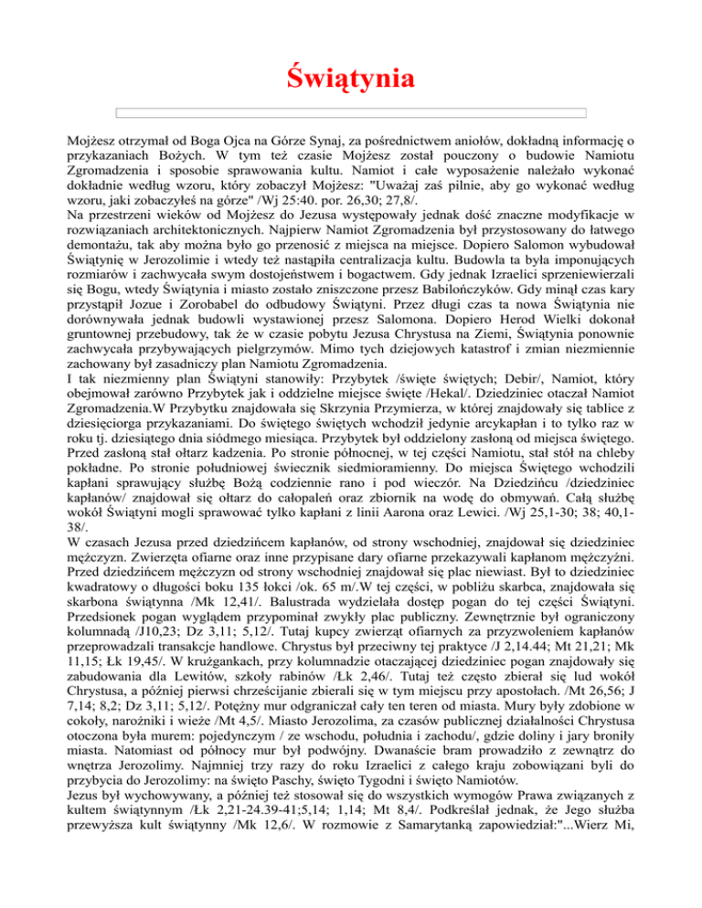 Świątynia Mojżesz otrzymał od Boga Ojca na Górze Synaj, za pośrednictwem aniołów, dokładną informację o przykazaniach Bożych. W tym też czasie Mojżesz został pouczony o budowie Namiotu Zgromadzenia i sposobie sprawowania kultu. Namiot i całe wyposażenie należało wykonać dokładnie według wzoru, który zobaczył Mojżesz: "Uważaj zaś pilnie, aby go wykonać według wzoru, jaki zobaczyłeś na górze" /Wj 25:40. por. 26,30; 27,8/. Na przestrzeni wieków od Mojżesz do Jezusa występowały jednak dość znaczne modyfikacje w rozwiązaniach architektonicznych. Najpierw Namiot Zgromadzenia był przystosowany do łatwego demontażu, tak aby można było go przenosić z miejsca na miejsce. Dopiero Salomon wybudował Świątynię w Jerozolimie i wtedy też nastąpiła centralizacja kultu. Budowla ta była imponujących rozmiarów i zachwycała swym dostojeństwem i bogactwem. Gdy jednak Izraelici sprzeniewierzali się Bogu, wtedy Świątynia i miasto zostało zniszczone przesz Babilończyków. Gdy minął czas kary przystąpił Jozue i Zorobabel do odbudowy Świątyni. Przez długi czas ta nowa Świątynia nie dorównywała jednak budowli wystawionej przesz Salomona. Dopiero Herod Wielki dokonał gruntownej przebudowy, tak że w czasie pobytu Jezusa Chrystusa na Ziemi, Świątynia ponownie zachwycała przybywających pielgrzymów. Mimo tych dziejowych katastrof i zmian niezmiennie zachowany był zasadniczy plan Namiotu Zgromadzenia. I tak niezmienny plan Świątyni stanowiły: Przybytek /święte świętych; Debir/, Namiot, który obejmował zarówno Przybytek jak i oddzielne miejsce święte /Hekal/. Dziedziniec otaczał Namiot Zgromadzenia.W Przybytku znajdowała się Skrzynia Przymierza, w której znajdowały się tablice z dziesięciorga przykazaniami. Do świętego świętych wchodził jedynie arcykapłan i to tylko raz w roku tj. dziesiątego dnia siódmego miesiąca. Przybytek był oddzielony zasłoną od miejsca świętego. Przed zasłoną stał ołtarz kadzenia. Po stronie północnej, w tej części Namiotu, stał stół na chleby pokładne. Po stronie południowej świecznik siedmioramienny. Do miejsca Świętego wchodzili kapłani sprawujący służbę Bożą codziennie rano i pod wieczór. Na Dziedzińcu /dziedziniec kapłanów/ znajdował się ołtarz do całopaleń oraz zbiornik na wodę do obmywań. Całą służbę wokół Świątyni mogli sprawować tylko kapłani z linii Aarona oraz Lewici. /Wj 25,1-30; 38; 40,138/. W czasach Jezusa przed dziedzińcem kapłanów, od strony wschodniej, znajdował się dziedziniec mężczyzn. Zwierzęta ofiarne oraz inne przypisane dary ofiarne przekazywali kapłanom mężczyźni. Przed dziedzińcem mężczyzn od strony wschodniej znajdował się plac niewiast. Był to dziedziniec kwadratowy o długości boku 135 łokci /ok. 65 m/.W tej części, w pobliżu skarbca, znajdowała się skarbona świątynna /Mk 12,41/. Balustrada wydzielała dostęp pogan do tej części Świątyni. Przedsionek pogan wyglądem przypominał zwykły plac publiczny. Zewnętrznie był ograniczony kolumnadą /J10,23; Dz 3,11; 5,12/. Tutaj kupcy zwierząt ofiarnych za przyzwoleniem kapłanów przeprowadzali transakcje handlowe. Chrystus był przeciwny tej praktyce /J 2,14.44; Mt 21,21; Mk 11,15; Łk 19,45/. W krużgankach, przy kolumnadzie otaczającej dziedziniec pogan znajdowały się zabudowania dla Lewitów, szkoły rabinów /Łk 2,46/. Tutaj też często zbierał się lud wokół Chrystusa, a później pierwsi chrześcijanie zbierali się w tym miejscu przy apostołach. /Mt 26,56; J 7,14; 8,2; Dz 3,11; 5,12/. Potężny mur odgraniczał cały ten teren od miasta. Mury były zdobione w cokoły, narożniki i wieże /Mt 4,5/. Miasto Jerozolima, za czasów publicznej działalności Chrystusa otoczona była murem: pojedynczym / ze wschodu, południa i zachodu/, gdzie doliny i jary broniły miasta. Natomiast od północy mur był podwójny. Dwanaście bram prowadziło z zewnątrz do wnętrza Jerozolimy. Najmniej trzy razy do roku Izraelici z całego kraju zobowiązani byli do przybycia do Jerozolimy: na święto Paschy, święto Tygodni i święto Namiotów. Jezus był wychowywany, a później też stosował się do wszystkich wymogów Prawa związanych z kultem świątynnym /Łk 2,21-24.39-41;5,14; 1,14; Mt 8,4/. Podkreślał jednak, że Jego służba przewyższa kult świątynny /Mk 12,6/. W rozmowie z Samarytanką zapowiedział:"...Wierz Mi, kobieto, że nadchodzi godzina, kiedy ani na tej górze, ani w Jerozolimie nie będziecie czcili Ojca. Wy czcicie to, czego nie znacie, my czcimy to, co znamy, ponieważ zbawienie bierze początek od Żydów. Nadchodzi jednak godzina, owszem już jest, kiedy to prawdziwi czciciele będą oddawać cześć Ojcu w Duchu i prawdzie, a takich to czcicieli chce mieć Ojciec. Bóg jest duchem; potrzeba więc, by czciciele Jego oddawali Mu cześć w Duchu i prawdzie /Jn 4:21-24/. W czasie śmierci Jezusa Chrystusa zasłona oddzielająca miejsce święte świętych od świętego uległa rozdarciu / Mk 15,33-38/. Uczniowie Jezusa jeszcze przez pewien czas, po wniebowstąpieniu Jezusa, zgromadzali się w Świątyni /Dz 2,46; 21,20-26/. Autor listu do Hebrajczyków odnosi model służby sprawowanej w ziemskiej świątyni do świątyni niebiańskiej. Dobitnie udowadnia tymczasowość służby w ziemskiej świątyni /Hbr 7,12; 9,9; 10,9.18; 13,9.10/. Jezus przez swą śmierć i zmartwychwstanie zapoczątkował drogę nową i żywą /Hbr 10,20/. Chrystus bowiem wszedł nie do świątyni zbudowanej rękami ludzkimi, ale do samego nieba, zasiadając po prawicy Ojca /Hbr 10,24; 8,1/. Jezus jest arcykapłanem na wzór Melchizedeka i jest sługą Świątyni i prawdziwego przybytku zbudowanego przez Pana, a nie przez człowieka /Hbr 7,1-8,13/. Służba w ziemskiej świątyni jest obrazem i cieniem rzeczywistości niebiańskich /Hbr 8,5/. Krew Chrystusa, który przez ducha wiecznego złożył Bogu samego siebie jako nieskalaną ofia