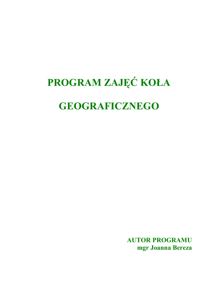 PROGRAM ZAJĘĆ KOŁA GEOGRAFICZNEGO AUTOR PROGRAMU mgr Joanna Bereza SPIS TREŚCI 1. WSTĘP 2. ZAŁOśENIA PROGRAMU 3. CELE KSZTAŁCENIA 4. PROPONOWANE TREŚCI PROGRAMU 5. PLAN ZAJĘĆ KOŁA GEOGRAFICZNEGO 6. OPIS OSIĄGNIĘĆ UCZNIÓW WSTĘP Współczesną geografię tworzy system nauk badających oraz wyjaśniających przyczyny i skutki przyrodniczego i społeczno- ekonomicznego zróŜnicowania przestrzeni geograficznej. Przedmiotem jej badań jest opisywanie i wyjaśnianie związków i współzaleŜności zachodzących między poszczególnymi elementami przyrody oŜywionej i nieoŜywionej oraz między działalnością gospodarczą człowieka. Geografia jako przedmiot nauczania w szkole ma ogromne walory poznawcze, praktyczne i wychowawcze. Nauczanie geografii ma pomóc uczniom odpowiedzieć na pytania o sens i przyczynę istnienia, rolę w środowisku określonych obiektów i zjawisk oraz o moŜliwości ich racjonalnego wykorzystania. Edukacja geograficzna dąŜy do uświadomienia ludziom skutków ich zachowań w środowisku geograficznym. Dzięki wiedzy geograficznej ludzie potrafią podejmować właściwe decyzje, dotyczące zagospodarowywania przestrzeni geograficznej, zachowując jednocześnie naturalną równowagę w środowisku przyrodniczym naszej planety. Geografia integruje wiedzę z róŜnych przedmiotów, np. biologii, chemii, fizyki, matematyki. Tylko zintegrowana wiedza stwarza warunki do ogólnego wykształcenia i wielostronnego rozwoju osobowości ucznia oraz przygotowuje go do twórczego myślenia i działania. ZAŁOśENIA PROGRAMU Program skierowany jest do uczniów gimnazjum szczególnie zainteresowanych przedmiotem-geografia. Zajęcia prowadzone są róŜnymi metodami najczęściej aktywnymi. Zmuszają one uczniów do samodzielnego myślenia, zdobywania i weryfikowania informacji. Gimnazjaliści uczą się podejmować decyzje, funkcjonować w grupie, odpowiadać za własne posunięcia. Zajęcia koła geograficznego mają równieŜ za zadanie przygotować uczniów do udziału w konkursach geograficznych i ekologicznych. Zajęcia prowadzone są społecznie i odbywają się w wymiarze jednej godziny tygodniowo. CELE PROGRAMU • Budzenie i rozwijanie zainteresowań ucznia geografią jako nauką przez • • • • • • • uświadomienie jej przydatności w Ŝyciu i gospodarczej działalności człowieka Uczenie dostrzegania, obserwowania, rozumienia i wartościowania zjawisk oraz procesów przyrodniczych zachodzących w środowisku lokalnym, regionalnym i globalnym Wyjaśnienie przyczyn i skutków zróŜnicowania przyrody oraz Ŝycia i działalności człowieka Lokalizowanie obiektów i zjawisk oraz ocena ich z róŜnych punktów widzenia: moralnych, patriotycznych, gospodarczych, społecznych i kulturowych Diagnozowanie przydatności środowiska dla potrzeb człowieka, a takŜe przewidywanie kierunków zmian, jakie zachodzą w wyniku działalności człowieka Dostrzeganie piękna przyrody i tkwiących w niej wartości, oraz odczuwanie potrzeby oszczędnego wykorzystania zasobów naturalnych Ziemi Stwarzanie uczniom warunków do samodzielnego zdobywania informacji z róŜnych źródeł Wszechstronne kształtowanie osobowości uczniów, ich sprawności umysłowych i praktycznych PLAN ZAJĘĆ KOŁA GEOGRAFICZNEGO Lp 1 Tematyka zajęć Treści Rocznik statystyczny i atlas Poznanie zasad korzystania z jako kopalnia informacji. rocznika statystycznego i map tematycznych w atlasie. 2 Multimedialna Umiejętne wyszukiwanie informacji, Encyklopedia-geografia moŜliwości ich wykorzystania. 3 Ziemia-co o niej wiemy? Przedstawienie dawnych poglądów na kształt Ziemi, dowodów na jej kulistość, oraz wymiarów naszej planety. 4 Ćwiczenia w określaniu Odczytywanie współrzędnych połoŜenia geograficznego. geograficznych wybranych miejsc, poszukiwanie miejsc o podanych współrzędnych geograficznych. 5 Która godzina? Obliczanie czasu miejscowego dla róŜnych miast na kuli ziemskiej. Przekraczanie linii zmiany daty. 6 Wysokość Słońca w Wykonanie pomiaru kąta padania momencie górowania. promieni słonecznych. Obliczanie wysokości Słońca w momencie górowania w róŜnych miejscach na Ziemi, w pierwszych dniach astronomicznych pór roku. 7 Ziemia we Wszechświecie. Poznanie naszego Układu Słonecznego, pojęć związanych z kosmosem i kolejnych etapów „podboju” kosmosu przez człowieka. 8 PodróŜ w czasie-czyli RozłoŜenie w czasie najwaŜniejszych poznajemy tabelę wydarzeń w dziejach Ziemi. Zasady stratygraficzną. odczytywania informacji z tabeli stratygraficznej. 9 Dlaczego tak wygląda Poznanie współczesnych procesów Ziemia? geologicznych i ich wpływu na rzeźbę powierzchni Ziemi. 10 Rozpoznajemy skały i Podanie zasad rozpoznawania skał i minerały. minerałów. Podział skał ze względu na pochodzenie. 11 Przez lądy i oceany Scharakteryzowanie rozmieszczenia dookoła świata. lądów i oceanów na kuli ziemskiej. Liczba godzin 2godz. 1godz. 1godz. 1godz. 1godz. 2godz. 1godz. 1godz. 1godz. 1godz. 1godz. 12 Bajkowy krajobraz Kanionu Kolorado. 2godz. 13 1godz. 14 15 16 17 18 19 20 21 22 Wyjaśnienie przyczyn powstania oraz budowy największego kanionu na Ziemi, poprzez projekcję slajdów i filmu video. Ognisty Pierścień Pacyfiku. Poznanie obszaru o największej aktywności wulkanicznej i sejsmicznej. Na dnie oceanu. Przedstawienie rzeźby dna oceanu poprzez analizę profili dna morskiego i procentowych diagramów ukształtowania. Gospodarcze Poznanie przykładów gospodarczego wykorzystanie oceanów i wykorzystania oceanów i wód wód lądowych. lądowych. Czy oceany mogą być pomocne w walce z klęską głodu i niedoŜywienia na świecie? A to ciekawe- Pustynia Wyjaśnienie przyczyn powstania tych Atacama i Pustynia Namib. pustyń, oraz omówienie warunków tam panujących. Tajemnica El Nino. Poznanie „mechanizmu działania” prądu morskiego, odpowiedzialnego za szereg klęsk Ŝywiołowych na Ziemi. Wykorzystanie informacji z Int