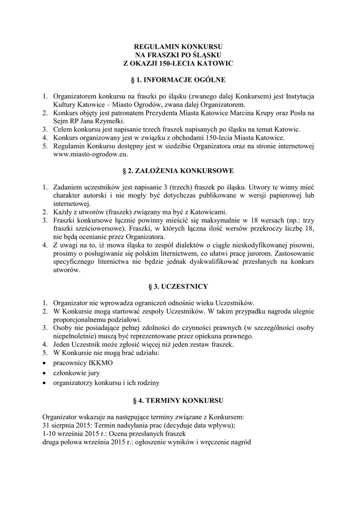 REGULAMIN KONKURSU NA FRASZKI PO ŚLĄSKU Z OKAZJI 150-LECIA KATOWIC § 1. INFORMACJE OGÓLNE 1. Organizatorem konkursu na fraszki po śląsku (zwanego dalej Konkursem) jest Instytucja Kultury Katowice – Miasto Ogrodów, zwana dalej Organizatorem. 2. Konkurs objęty jest patronatem Prezydenta Miasta Katowice Marcina Krupy oraz Posła na Sejm RP Jana Rzymełki. 3. Celem konkursu jest napisanie trzech fraszek napisanych po śląsku na temat Katowic. 4. Konkurs organizowany jest w związku z obchodami 150-lecia Miasta Katowice. 5. Regulamin Konkursu dostępny jest w siedzibie Organizatora oraz na stronie internetowej www.miasto-ogrodow.eu. § 2. ZAŁOŻENIA KONKURSOWE 1. Zadaniem uczestników jest napisanie 3 (trzech) fraszek po śląsku. Utwory te winny mieć charakter autorski i nie mogły być dotychczas publikowane w wersji papierowej lub internetowej. 2. Każdy z utworów (fraszek) związany ma być z Katowicami. 3. Fraszki konkursowe łącznie powinny mieścić się maksymalnie w 18 wersach (np.: trzy fraszki sześciowersowe). Fraszki, w których łączna ilość wersów przekroczy liczbę 18, nie będą ocenianie przez Organizatora. 4. Z uwagi na to, iż mowa śląska to zespół dialektów o ciągle nieskodyfikowanej pisowni, prosimy o posługiwanie się polskim liternictwem, co ułatwi pracę jurorom. Zastosowanie specyficznego liternictwa nie będzie jednak dyskwalifikować przesłanych na konkurs utworów. § 3. UCZESTNICY 1. Organizator nie wprowadza ograniczeń odnośnie wieku Uczestników. 2. W Konkursie mogą startować zespoły Uczestników. W takim przypadku nagroda ulegnie proporcjonalnemu podziałowi. 3. Osoby nie posiadające pełnej zdolności do czynności prawnych (w szczególności osoby niepełnoletnie) muszą być reprezentowane przez opiekuna prawnego. 4. Jeden Uczestnik może zgłosić więcej niż jeden zestaw fraszek. 5. W Konkursie nie mogą brać udziału: pracownicy IKKMO członkowie jury organizatorzy konkursu i ich rodziny § 4. TERMINY KONKURSU Organizator wskazuje na następujące terminy związane z Konkursem: 31 sierpnia 2015: Termin nadsyłania prac (decyduje data wpływu); 1-10 września 2015 r.: Ocena przesłanych fraszek druga połowa września 2015 r.: ogłoszenie wyników i wręczenie nagród § 5. ZGŁASZANIE PRAC 1. Utwory powinny być zgłaszane do siedziby Organizatora (Instytucja Kultury Katowice – Miasto Ogrodów, Plac Sejmu Śląskiego 2, 40-032 Katowice) osobiście lub listownie w kopertach z dopiskiem „Konkurs na fraszki po śląsku”. 2. Przesłane utwory, w formie maszynopisu lub wydruku komputerowego, powinny być podpisane pseudonimem (godłem). Do utworu należy dołączyć zaklejoną kopertę, opatrzoną tym samym pseudonimem (godłem), z umieszczonymi wewnątrz danymi autora: imię, nazwisko, wiek, e-mail, numer telefonu, ewentualnie adres do korespondencji. 3. Zgłoszenie utworów na Konkurs jest równoznaczne z oświadczeniem, iż osoba nadsyłająca: jest wyłącznym autorem/autorką utworów i dysponuje prawami autorskimi do całości utworów i/lub jej poszczególnych elementów; akceptuje warunki Regulaminu Konkursu, wyraża zgodę na przetwarzanie swoich danych osobowych zgodnie z ustawą o Ochronie Danych Osobowych ( Dz.U.Nr.133 pozycja 883) wyraża zgodę na nieodpłatne wykorzystywanie przez Organizatora Konkursu nadesłanych utworów w dowolnym czasie i formie w sposób nieodpłatny w zakresie wskazanym w Regulaminie. § 6. JURY 1. W skład Jury wchodzi 5 osób wskazanych przez Organizatora. Organizator o składzie Jury poinformuje na swojej stronie internetowej. 2. Organizator zastrzega sobie prawo zmiany składu Jury z przyczyn niezależnych od Organizatora. 3. Decyzja Jury jest ostateczna i nie przysługuje od niej odwołanie. § 7. NAGRODY 1. Organizator przewiduje przyznanie 3 nagród regulaminowych. 2. Ponadto Organizator planuje przyznanie wyróżnień. 3. Organizator zastrzega sobie prawo nie wskazania zwycięzy Konkursu oraz nie przyznania wyróżnień. 4. Warunkiem wypłacenia nagrody jest przekazanie Organizatorowi niezbędnych danych do dnia 30 września 2015 r. Po tym terminie prawo do nagrody wygasa. Nagroda zostanie przekazana do dnia 15 października 2015 r. §8. PRAWA AUTORSKIE I DANE OSOBOWE 1. Prawo do korzystania z utworów udzielone Organizatorowi Konkursu ma charakter nieograniczonej w czasie, bezpłatnej i niewyłącznej licencji w następującym zakresie: w zakresie utrwalania i zwielokrotniania utworów – wytwarzanie egzemplarzy jakąkolwiek techniką, w tym techniką drukarską, reprograficzną, poligraficzną, informatyczną, zapisu magnetycznego lub techniką cyfrową; w zakresie obrotu oryginałem oraz egzemplarzami, na których utwory utrwalono – wprowadzenie do obrotu oraz dowolne rozporządzanie, w tym zbycie, obciążenie, użyczenie lub najem oryginału lub egzemplarzy; w zakresie rozpowszechniania utworów w sposób inny niż określony w pkt 2 – publiczne wykonanie, wystawienie, wyświetlanie, odtworzenie oraz nadawanie i reemitowanie, a także publiczne udostępnianie w taki sposób, aby każdy mógł mieć do niego dostęp w miejscu i w czasie przez siebie wybranym. 2. Utwory mogą być wykorzystywane w dowolnym czasie, publikowane z zastosowaniem dowolnego nośnika, w tym w formie wydruku, materiałów wideo i/lub w Internecie. 3. Prawa niniejszej Organizator może przenieść na dowolną osobę w dowolnym czasie i zakresie. 4. W przypadku zgłoszenia roszczeń przez osoby trzecie związanych z treścią pracy jej autor zgadza się na zaspokojenie ewentualnych roszczeń Organizatora i zabezpieczenie go przed jakimikolwiek stratami, szkodami, kosztami, obciążeniami, opłatami prawnymi, windykacjami, wyrokami, kwotami wypłaconymi w ramach ugody, karami i wydatkami, jakie mogą być egzekwowane, nałożone lub ponoszone z powodu: (1) naruszenia prawa własności lub prawa autorskiego; (2) elementów zniesławiających lub niedozwolonych zawartych w pracy; (3) naruszeni